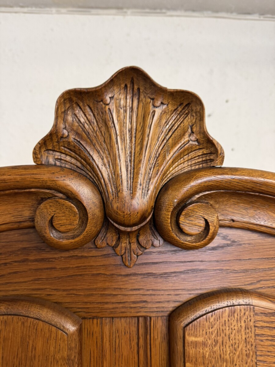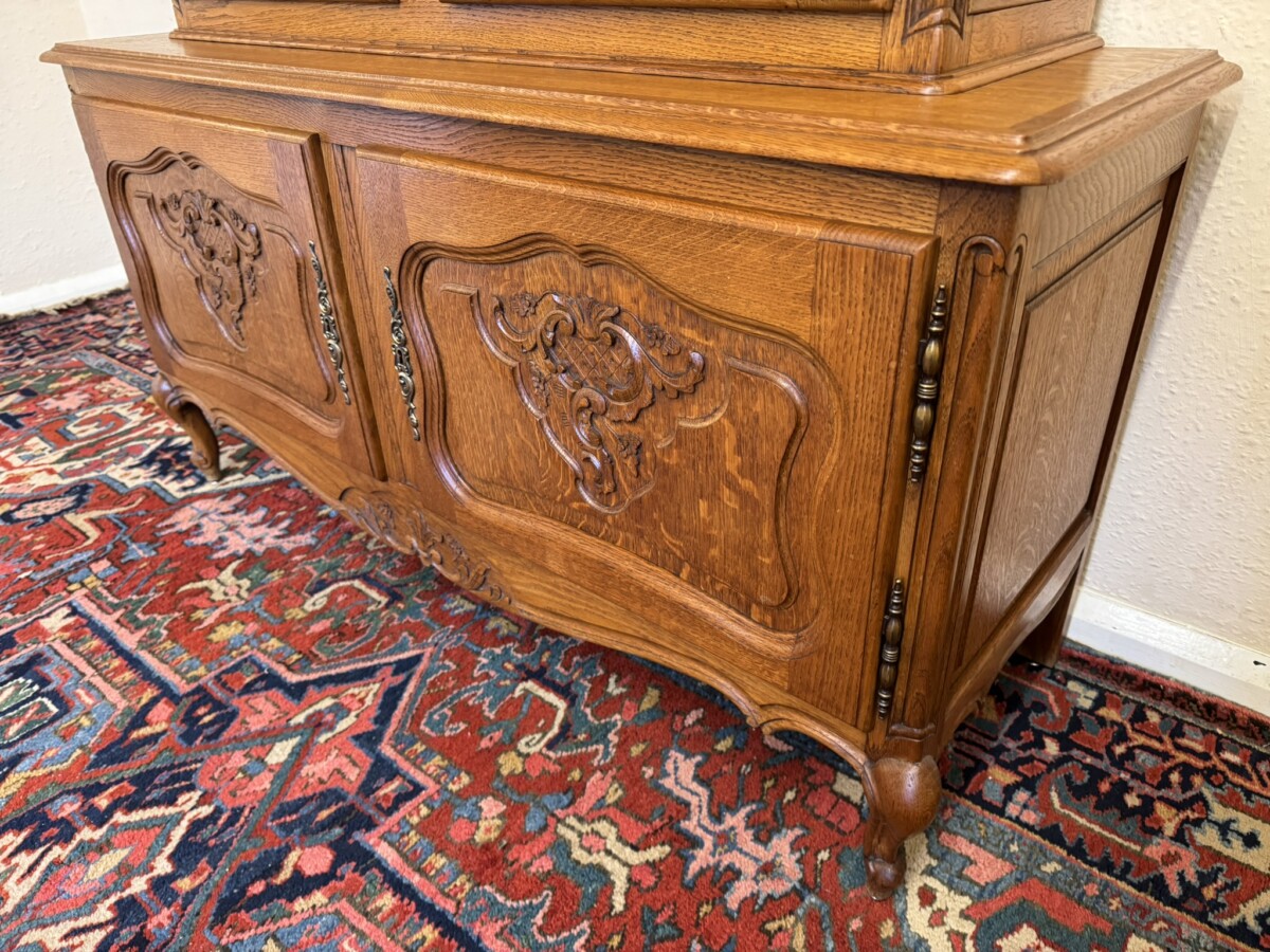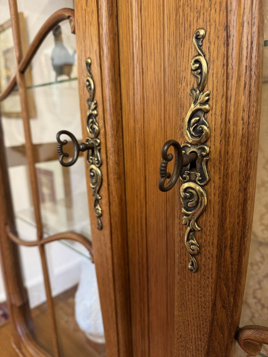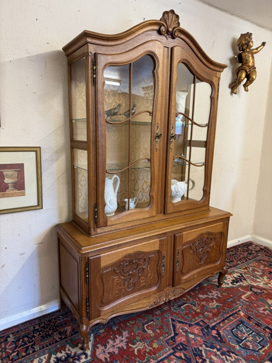 The curved oversailing top rises to a central carved crest, below are a pair of lockable glazed doors, each door having brass hinges, brass escutcheon, key and wood barring decoration. The doors open to reveal two removable glass shelves. For added display viewing the cabinet top has glazed sides. The base section has two carved recessed panelled lockable doors, each door having brass hinges and brass escutcheon. The doors open to reveal a removable wooden shelf. Recessed panelled sides, shaped skirt with decorative central carving and standing on two carved cabriole shaped legs to the front.