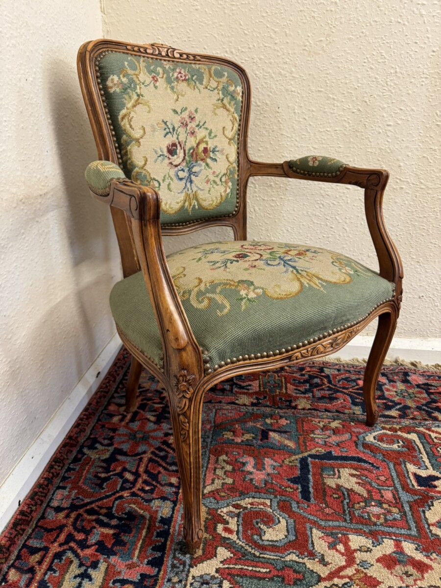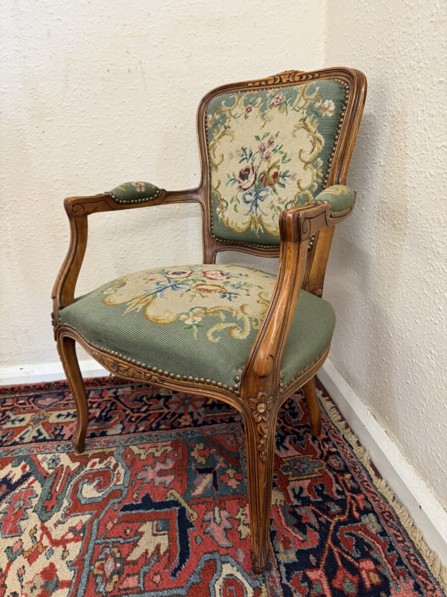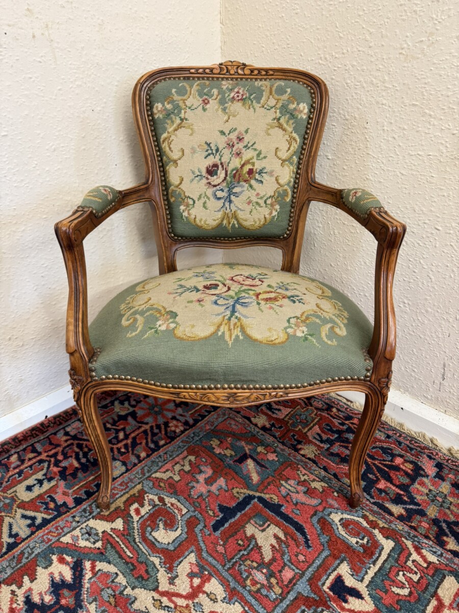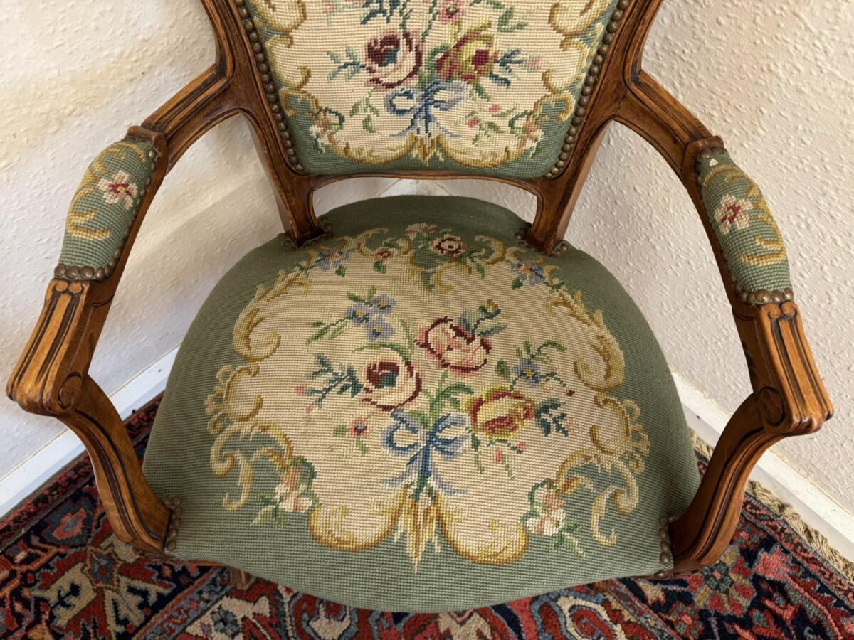 - FANTASTIC QUALITY FRENCH CARVED OAK NEEDLEPOINT ACCENT CHAIR