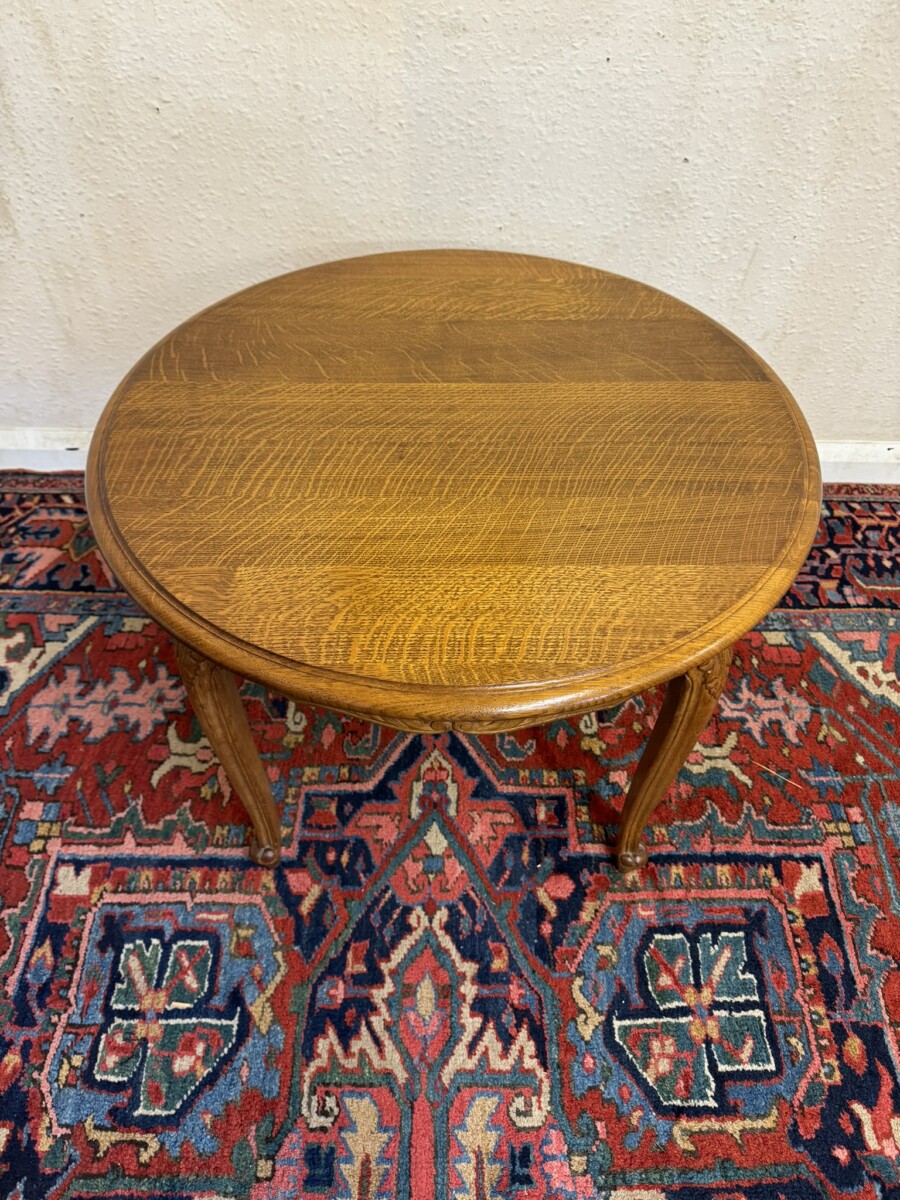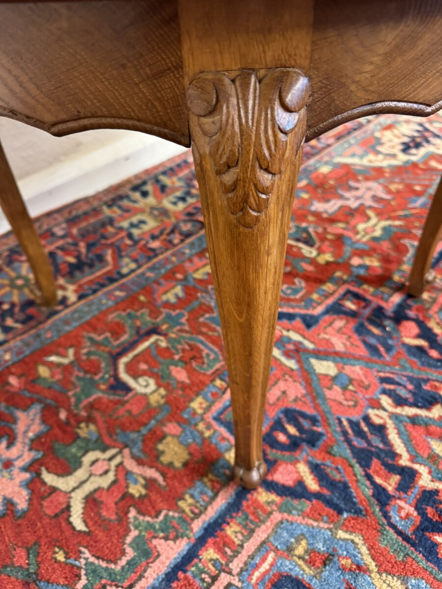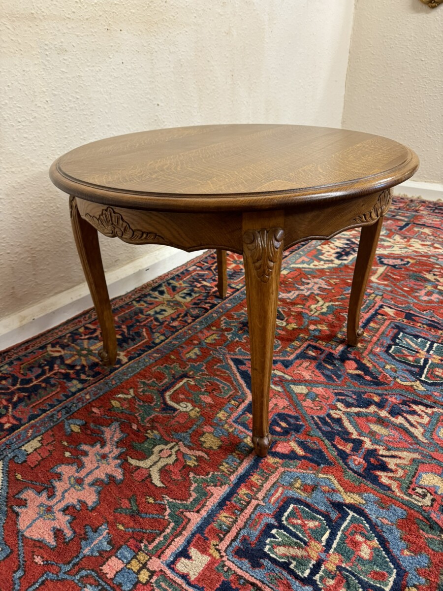 This fabulous table is made in striking solid oak. The round top has a carved shaped skirt below and stands on four carved cabriole shaped legs.