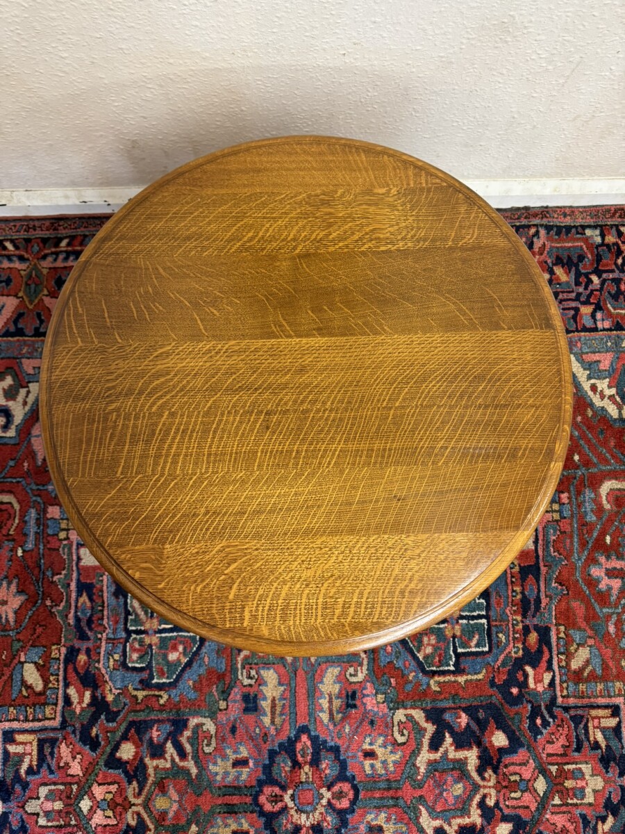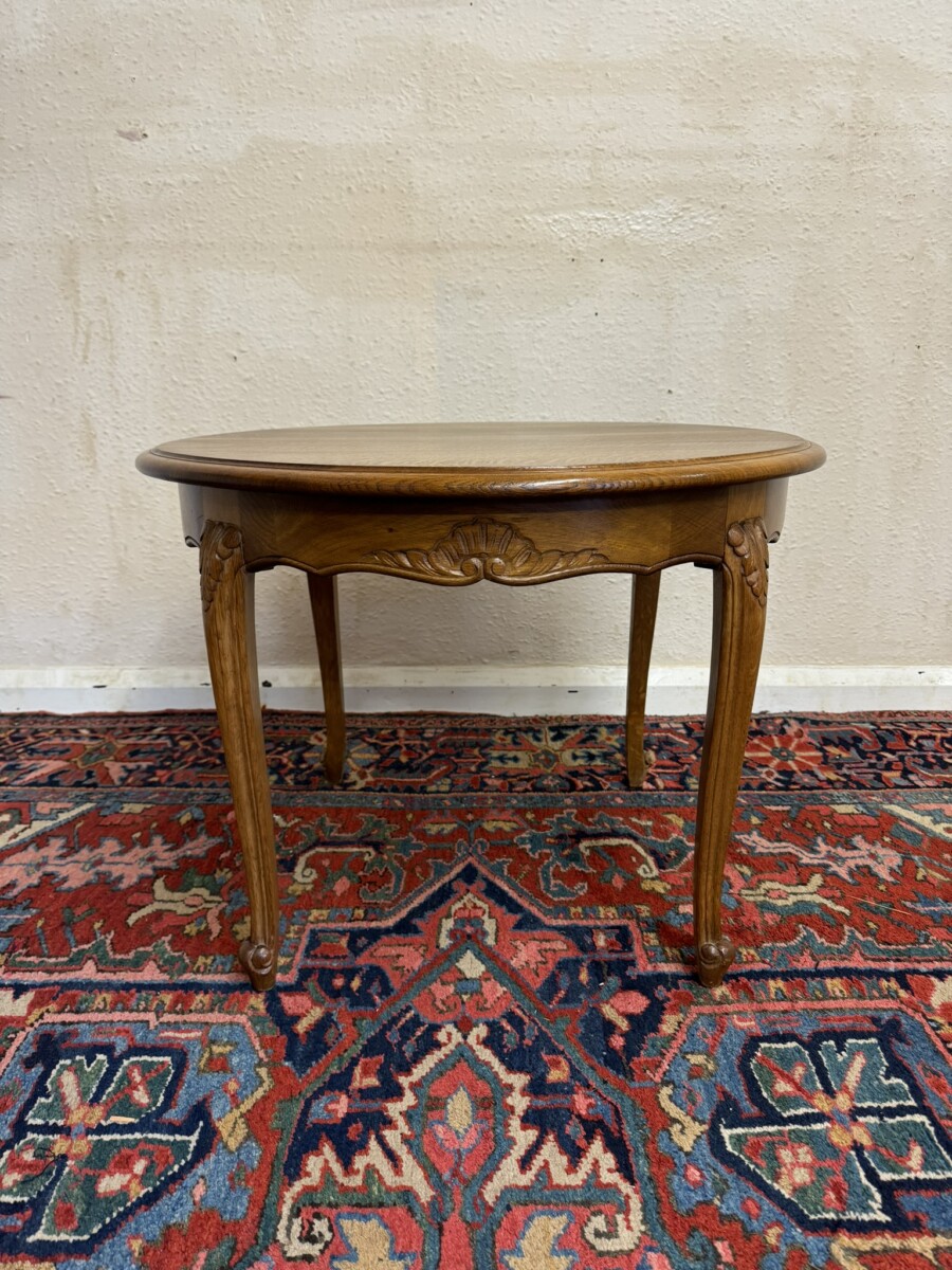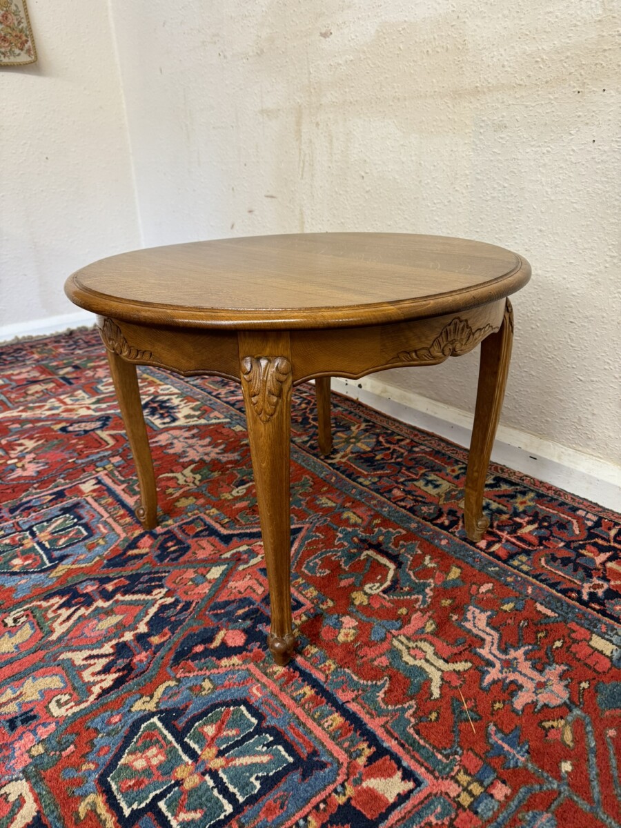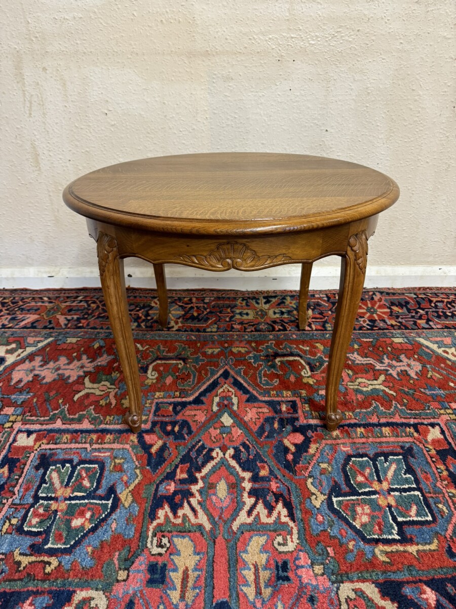 This fabulous table is made in striking solid oak. The round top has a carved shaped skirt below and stands on four carved cabriole shaped legs.