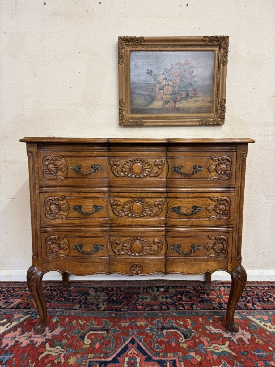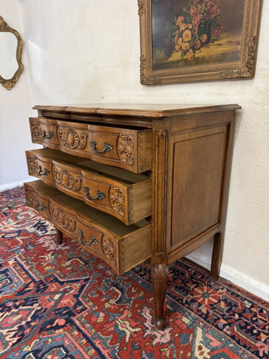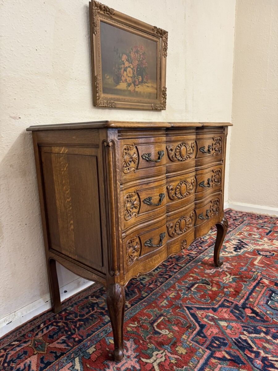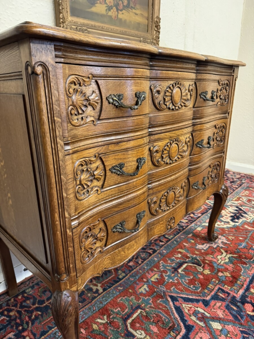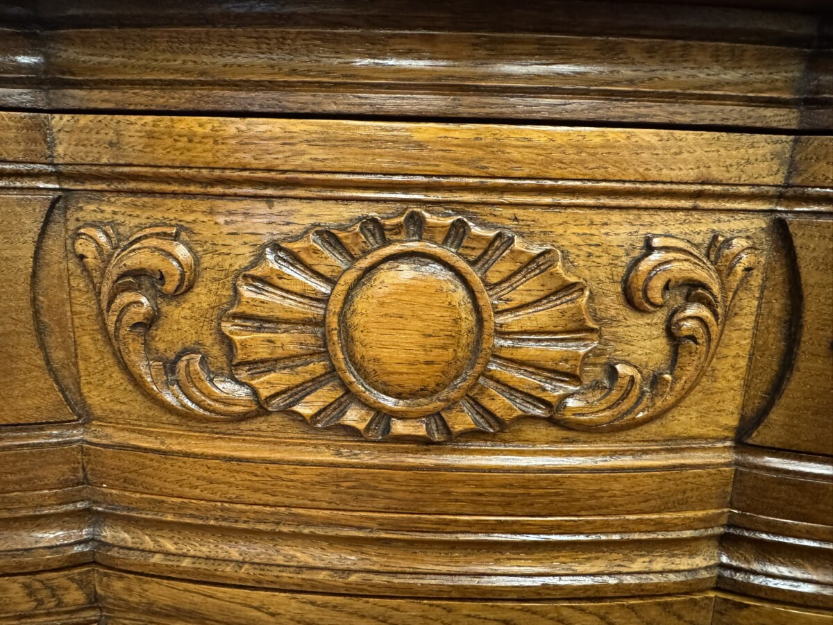- FANTASTIC QUALITY FRENCH CARVED OAK SHAPPED COMMODE/CHEST OF DRAWERS