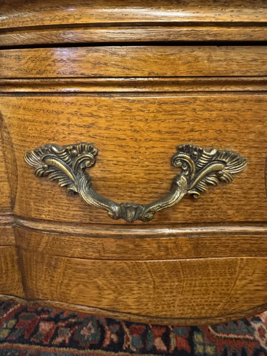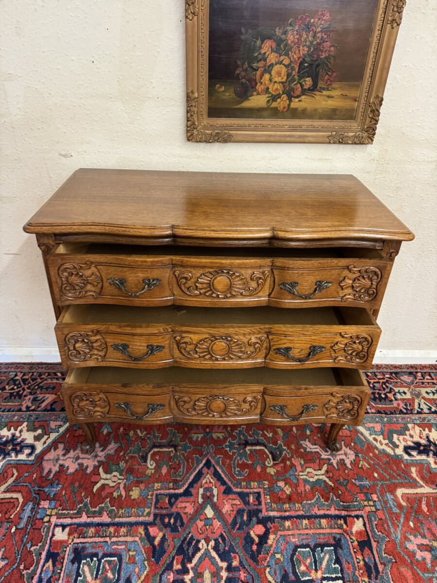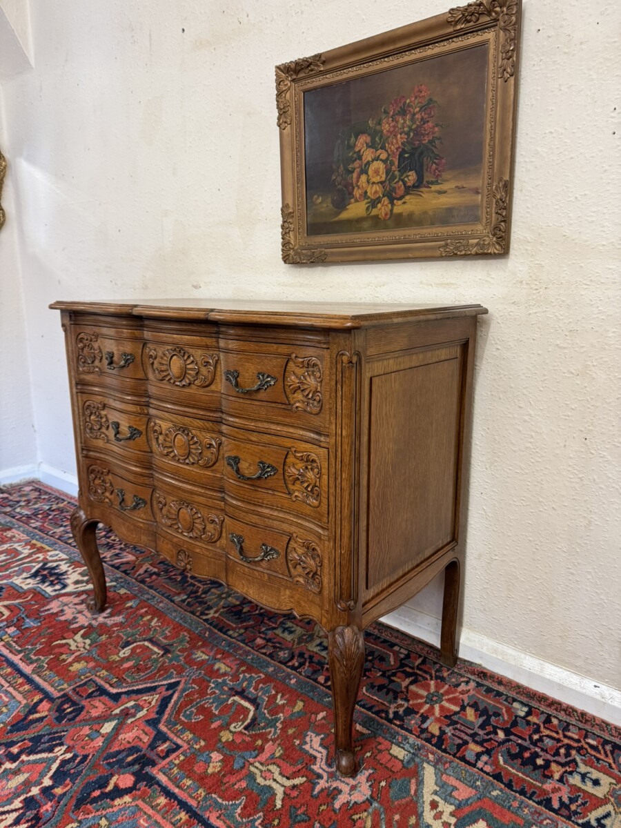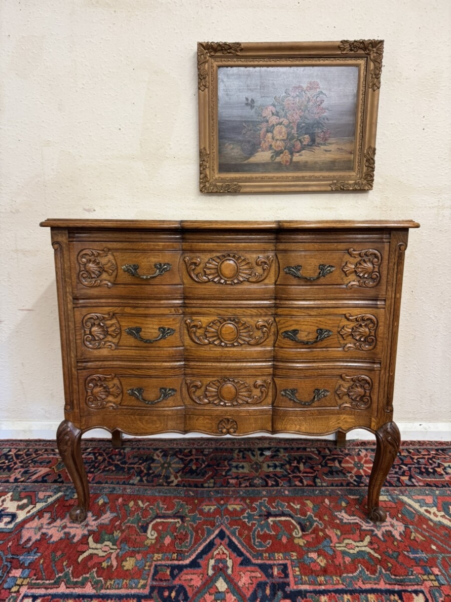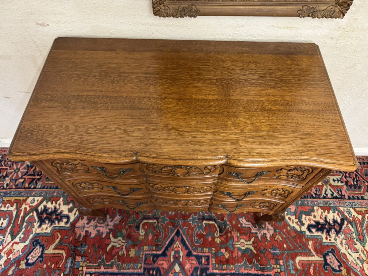 - FANTASTIC QUALITY FRENCH CARVED OAK SHAPPED COMMODE/CHEST OF DRAWERS