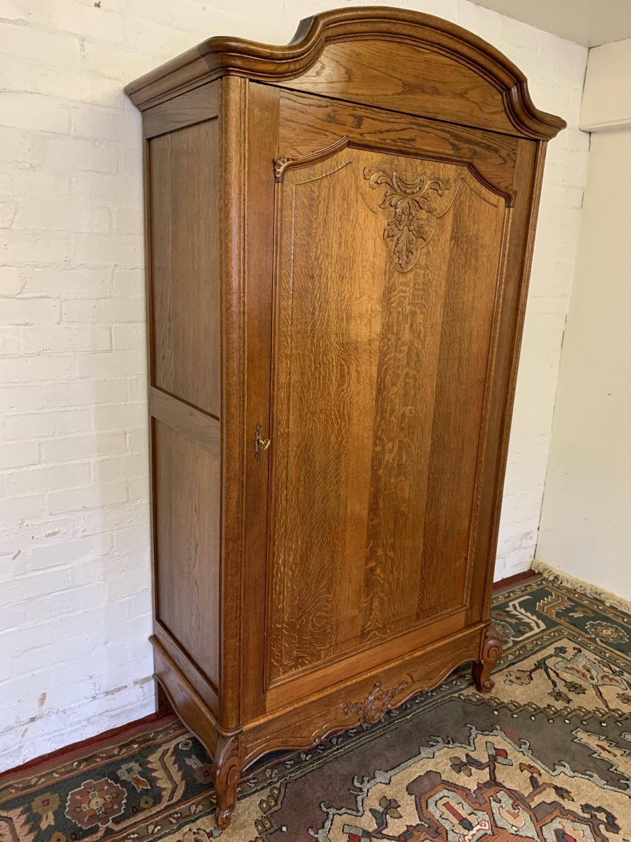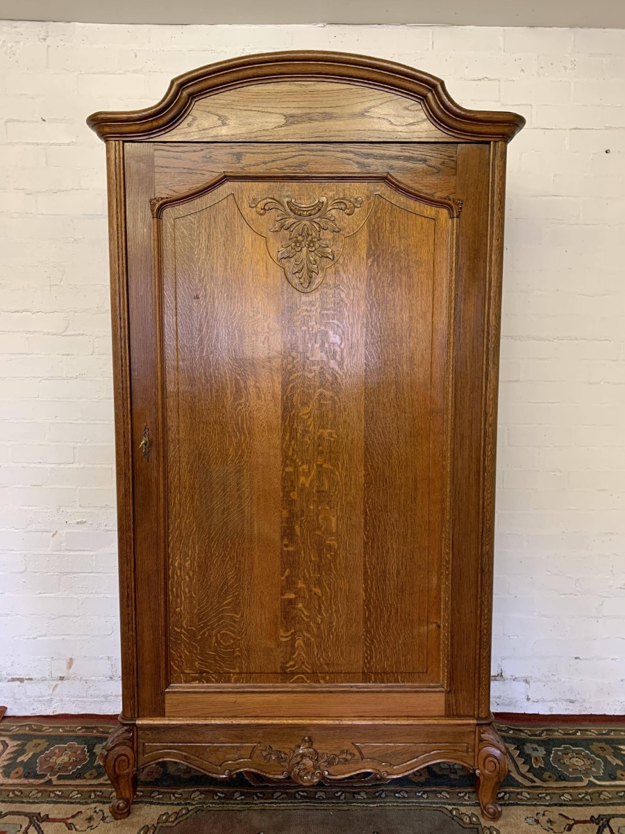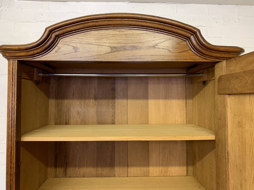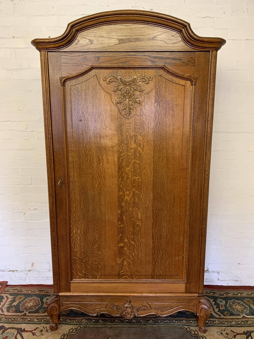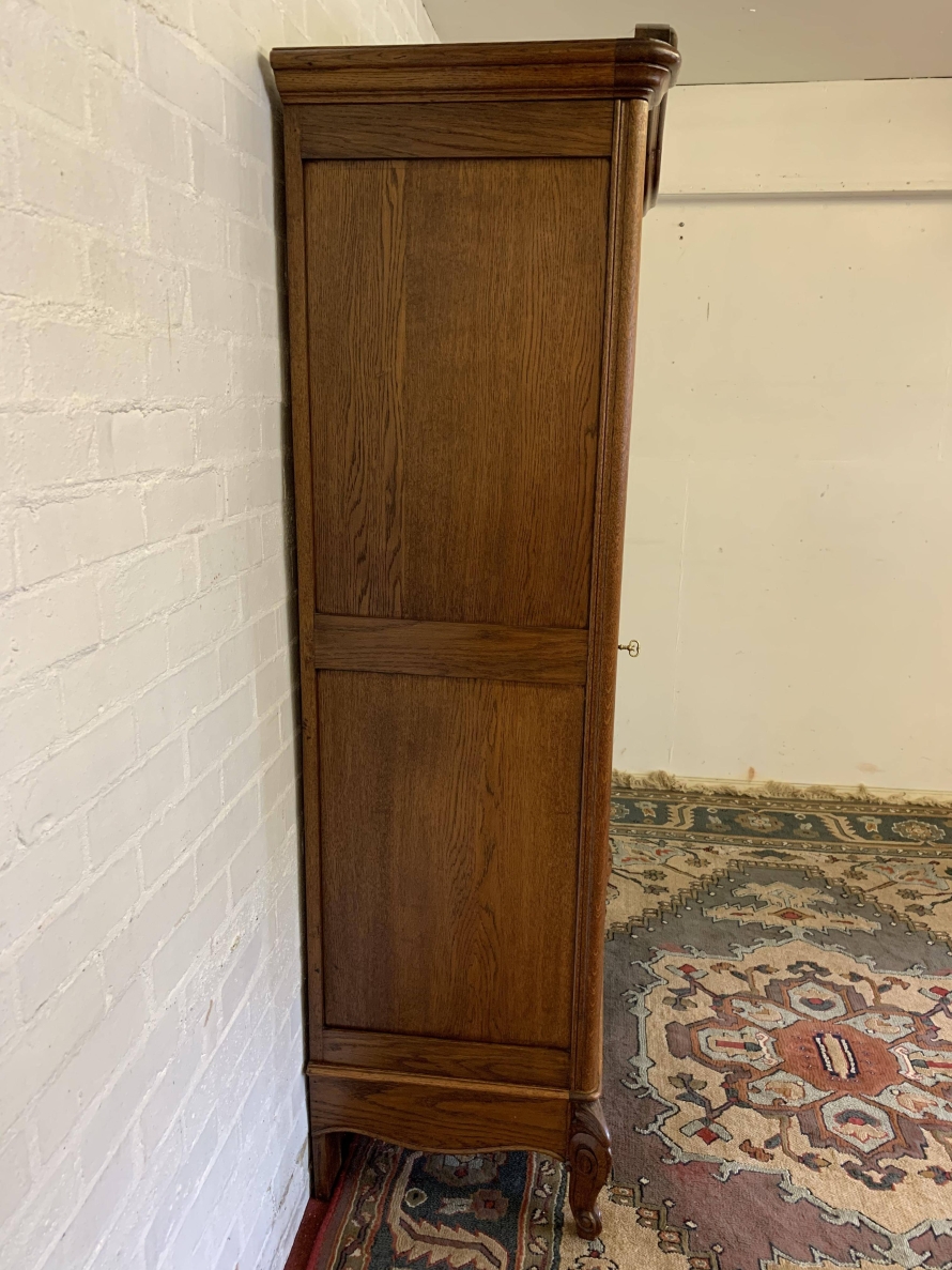 A fine armoire which is in excellent condition. The shaped top sits above a carved recessed panelled lockable door. The door opens to reveal a hanging rail, three removable shelves and long drawer, the drawer having to pull handles. Recessed panelled sides, shaped skirt with fine decorative central carving, this beautiful armoire stands on two shaped carved cabriole legs to the front. Please note this wardrobe splits down for easy transportation and delivery into any home.