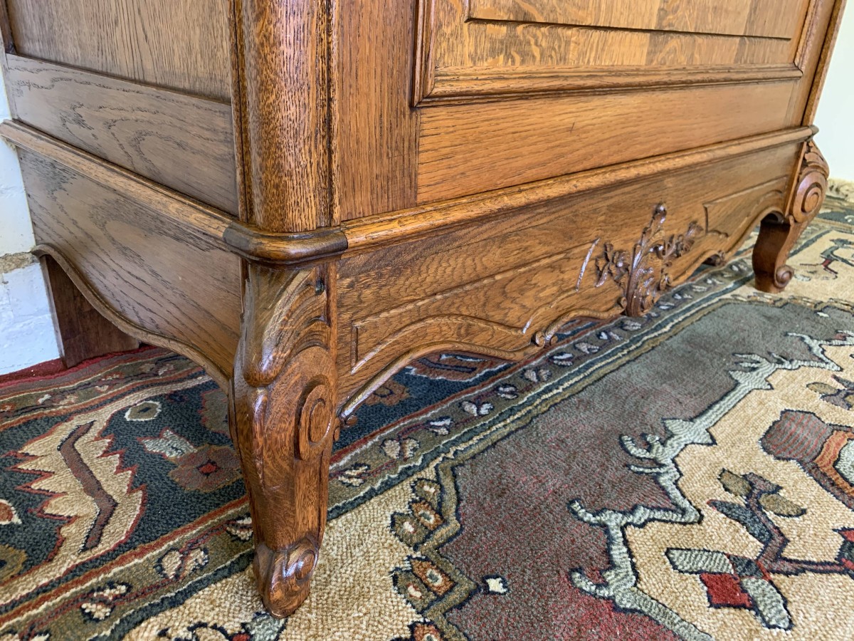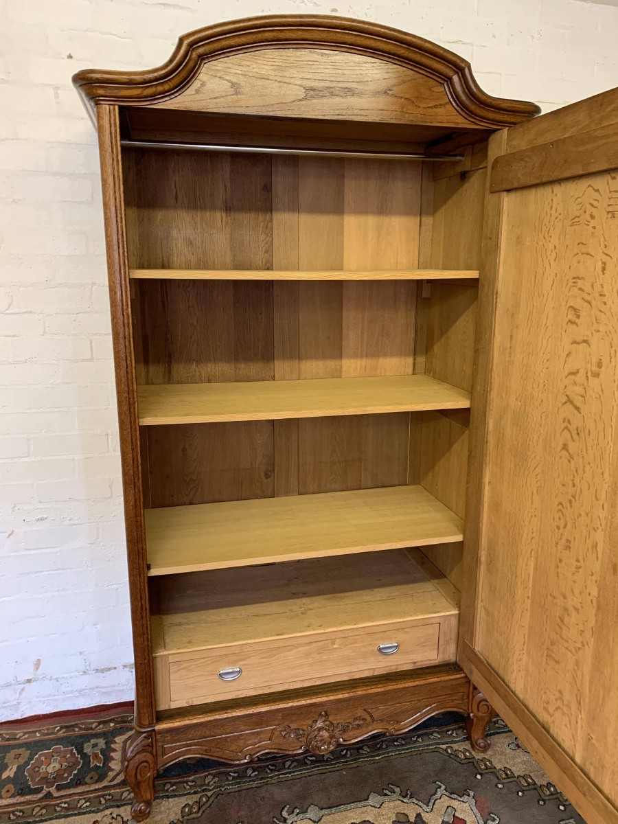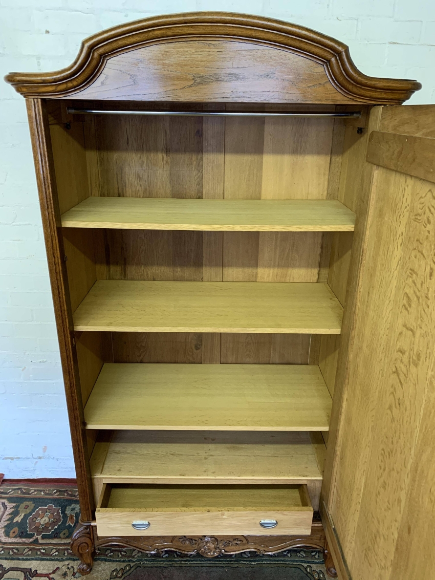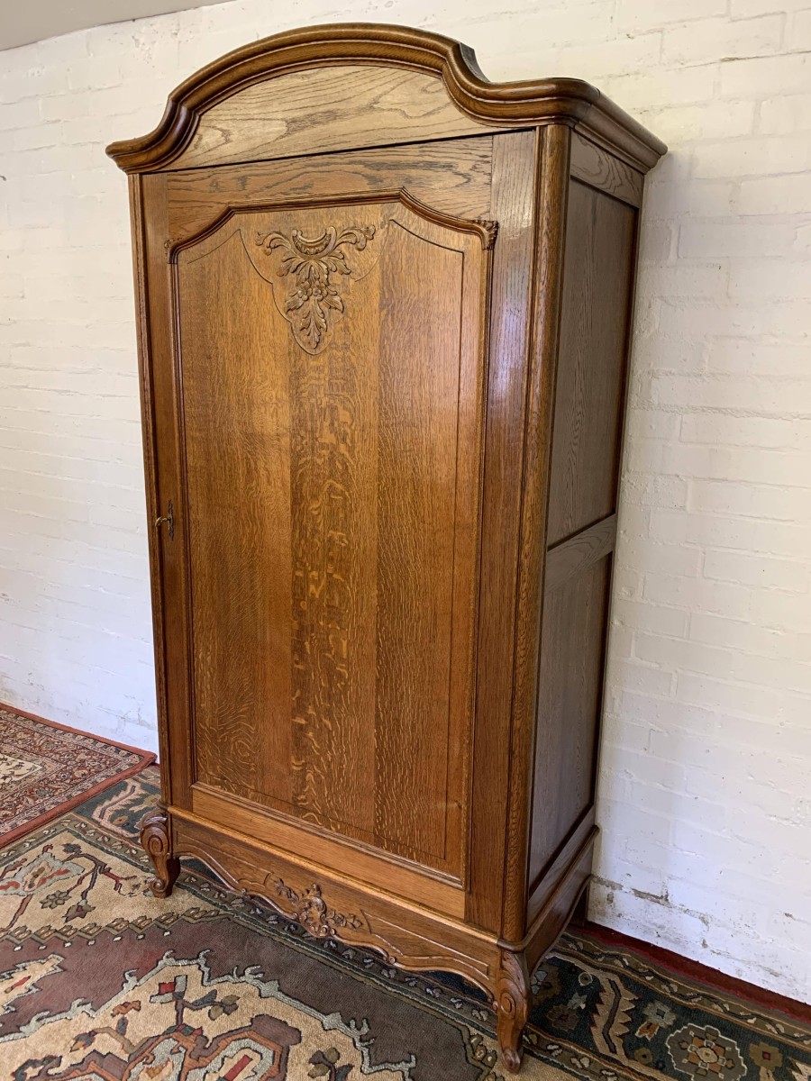 A fine armoire which is in excellent condition. The shaped top sits above a carved recessed panelled lockable door. The door opens to reveal a hanging rail, three removable shelves and long drawer, the drawer having to pull handles. Recessed panelled sides, shaped skirt with fine decorative central carving, this beautiful armoire stands on two shaped carved cabriole legs to the front. Please note this wardrobe splits down for easy transportation and delivery into any home.