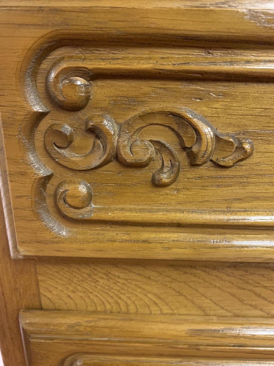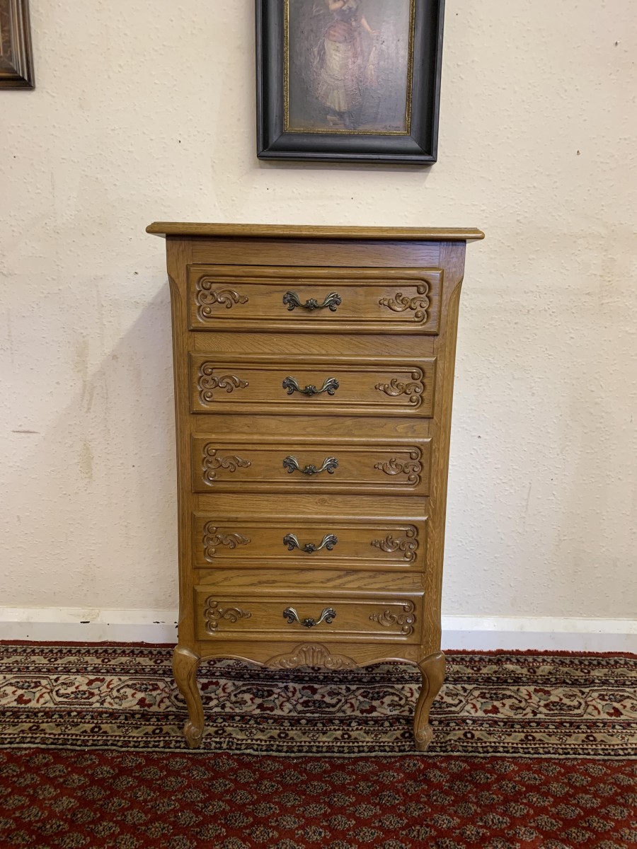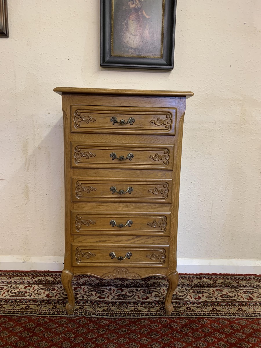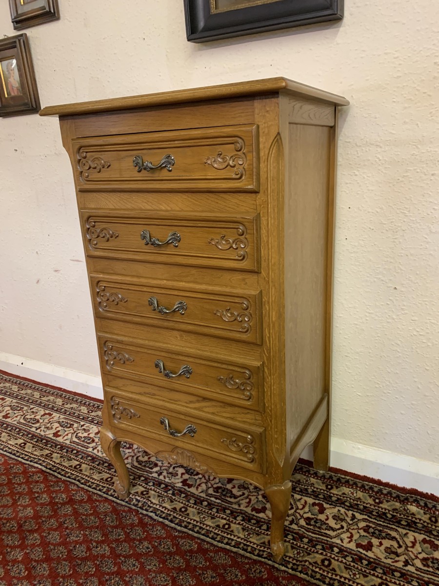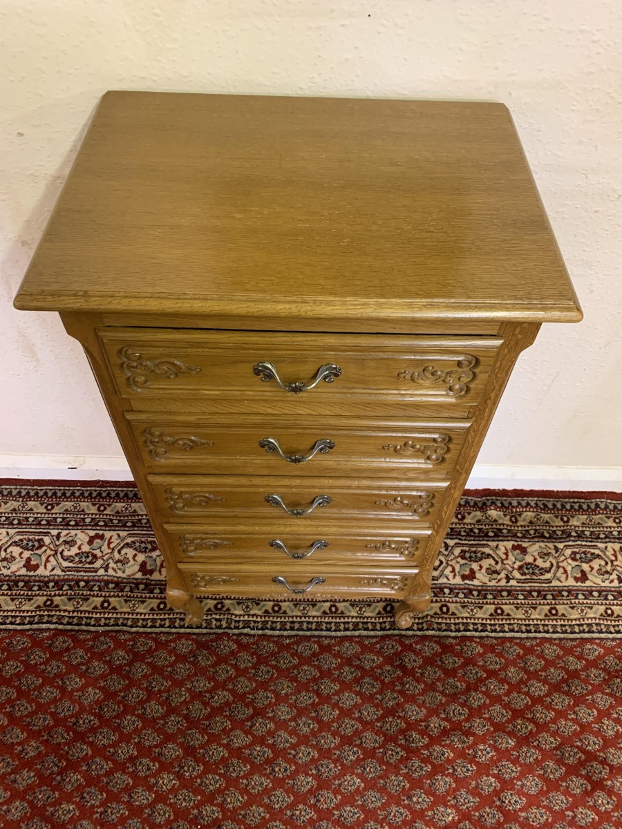 - Fantastic Quality French Carved Oak Slender Chest Of Five Drawers
