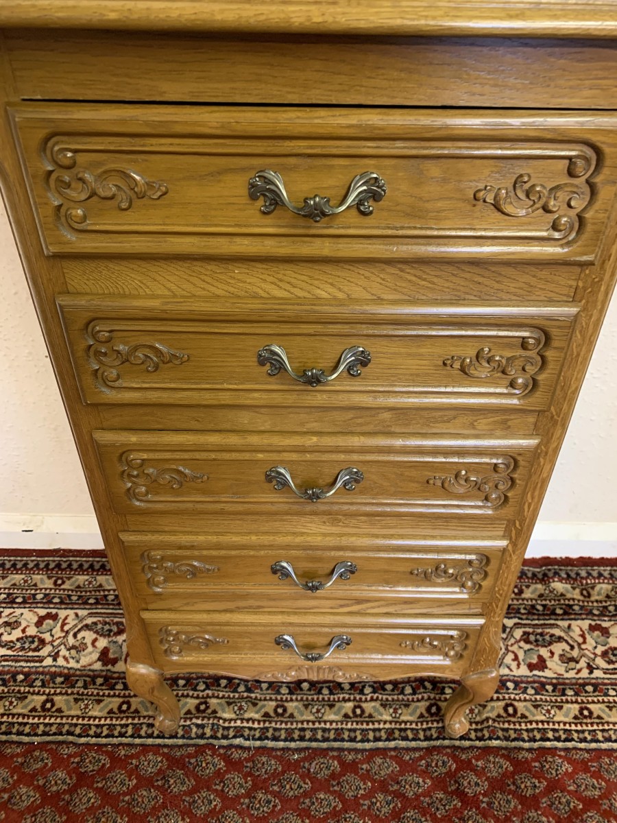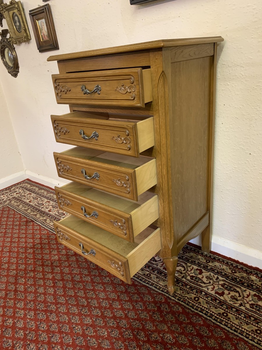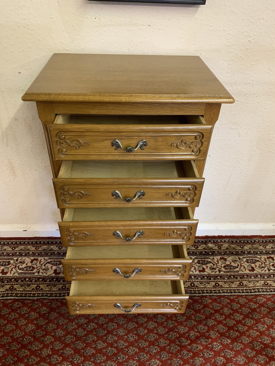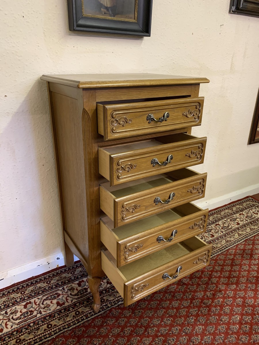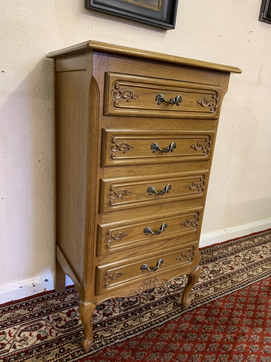 - Fantastic Quality French Carved Oak Slender Chest Of Five Drawers