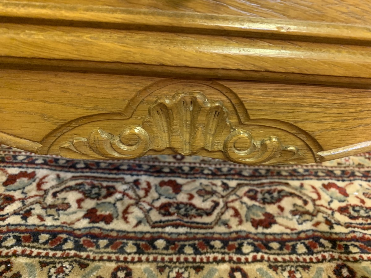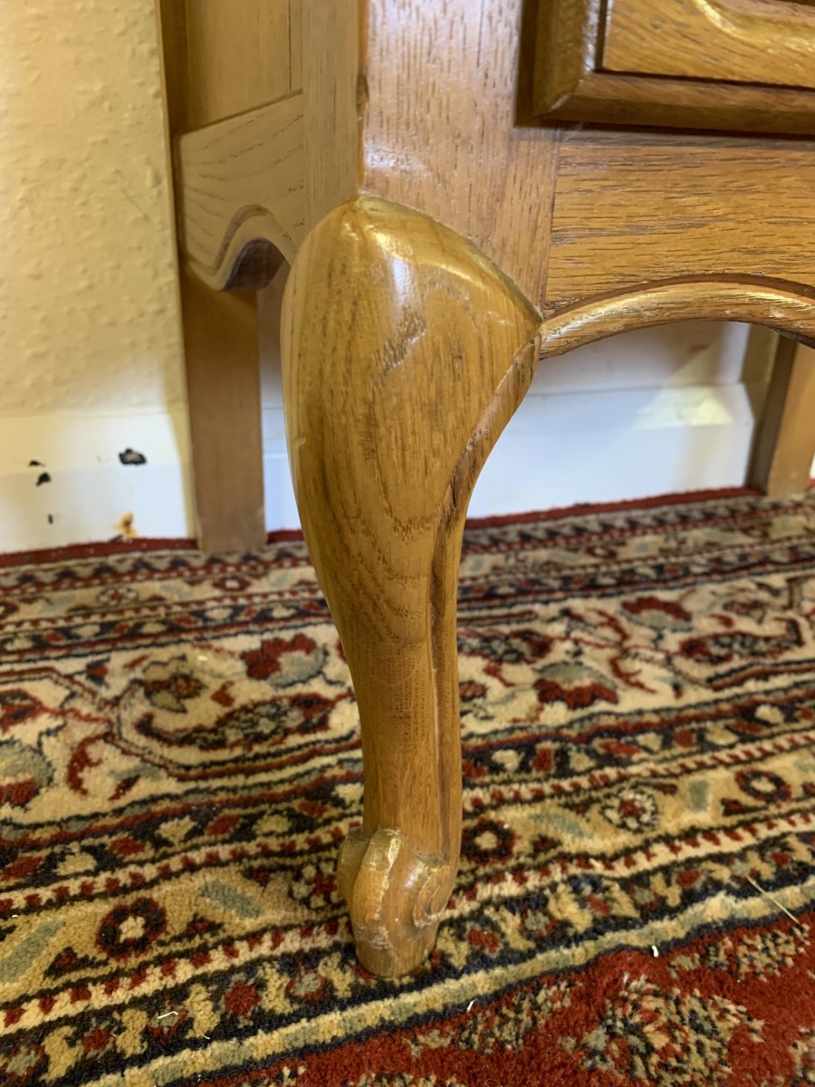 The oversailing top sits above five carved drawers, each drawer having a decorative brass handle. Recessed panelled sides shaped skirt with decorative central carving and standing on two carved cabriole shaped legs.