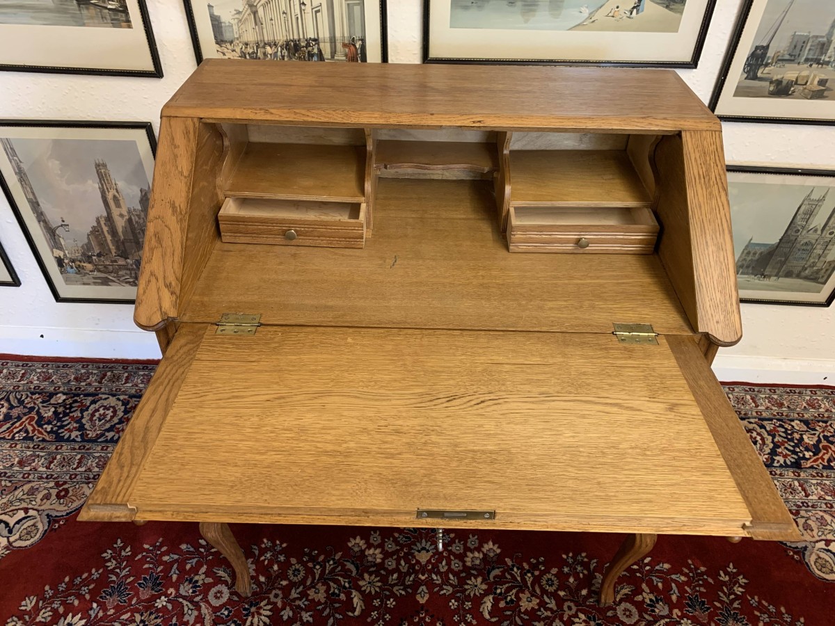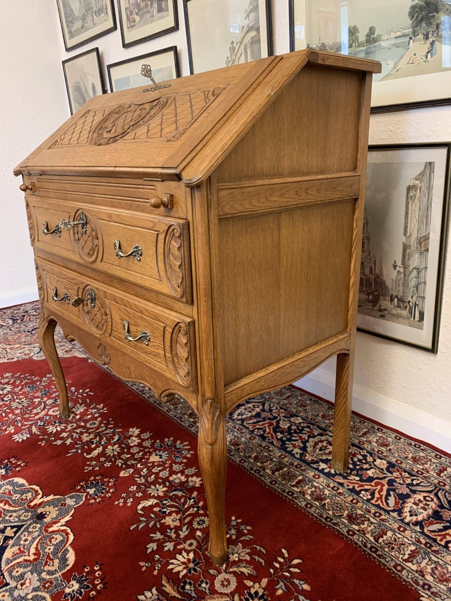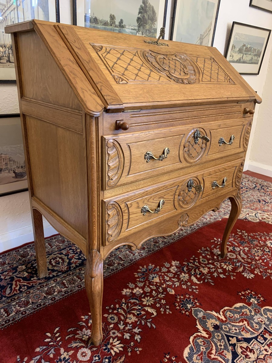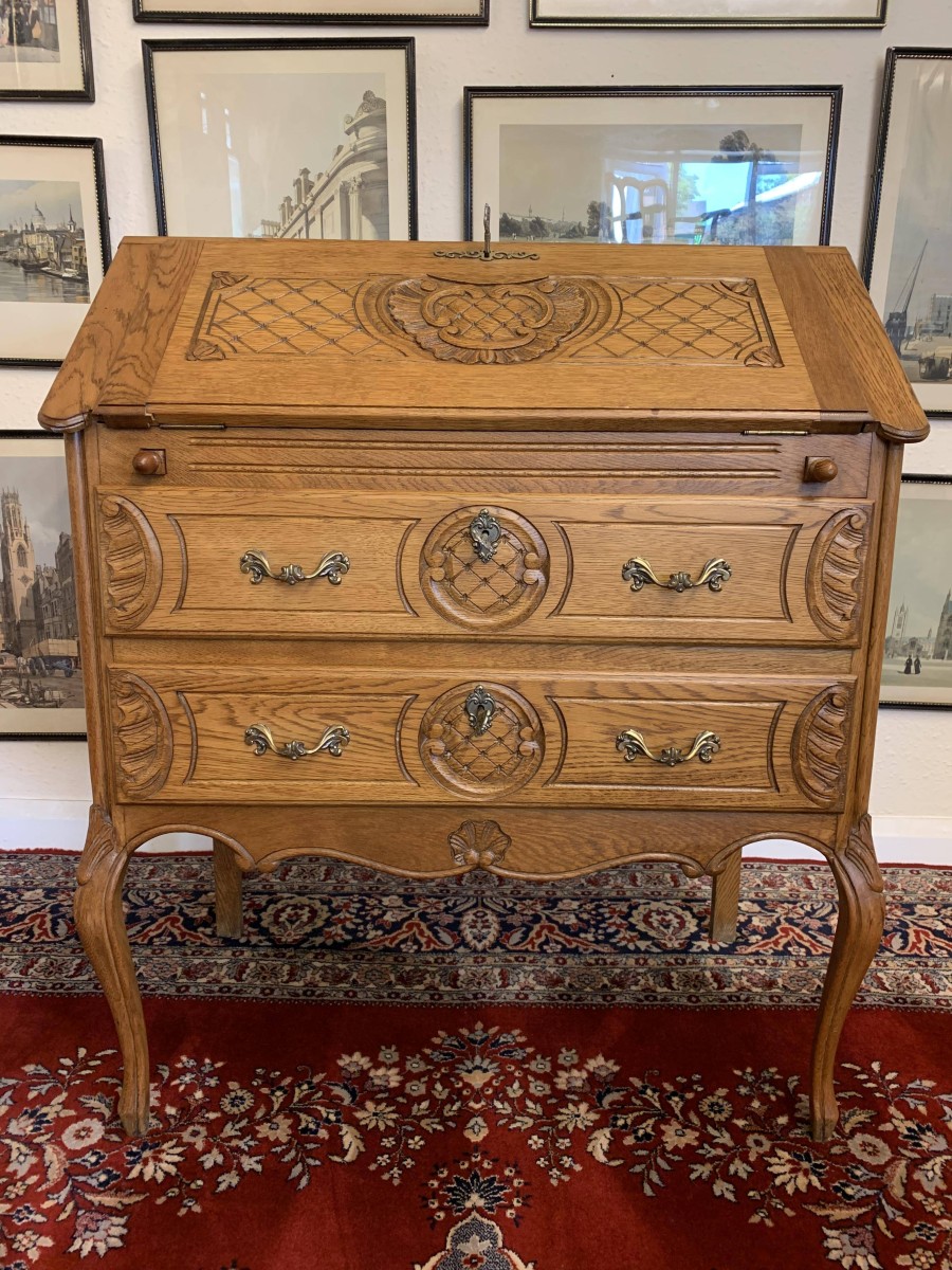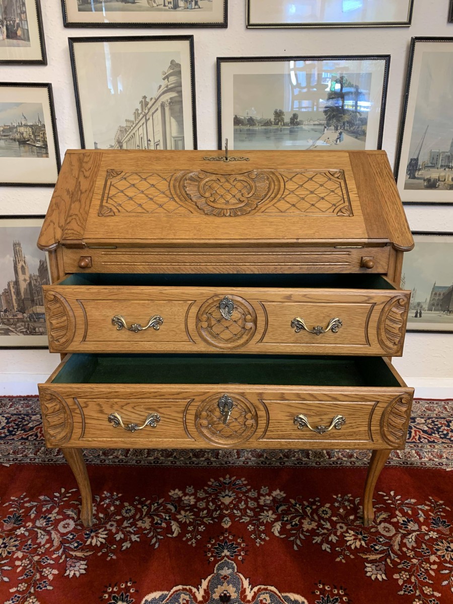 The lockable carved fall front opens and sits on two retractable rests. The fall opens to reveal two drawers, pigeon holes and writing space. Below are two carved lockable drawers, each drawer having a pair of brass ornate handles and key. Recessed panelled sides, shaped skirt with ornate central carving, this beautiful French bureau stands on two carved cabriole shaped legs to the front.