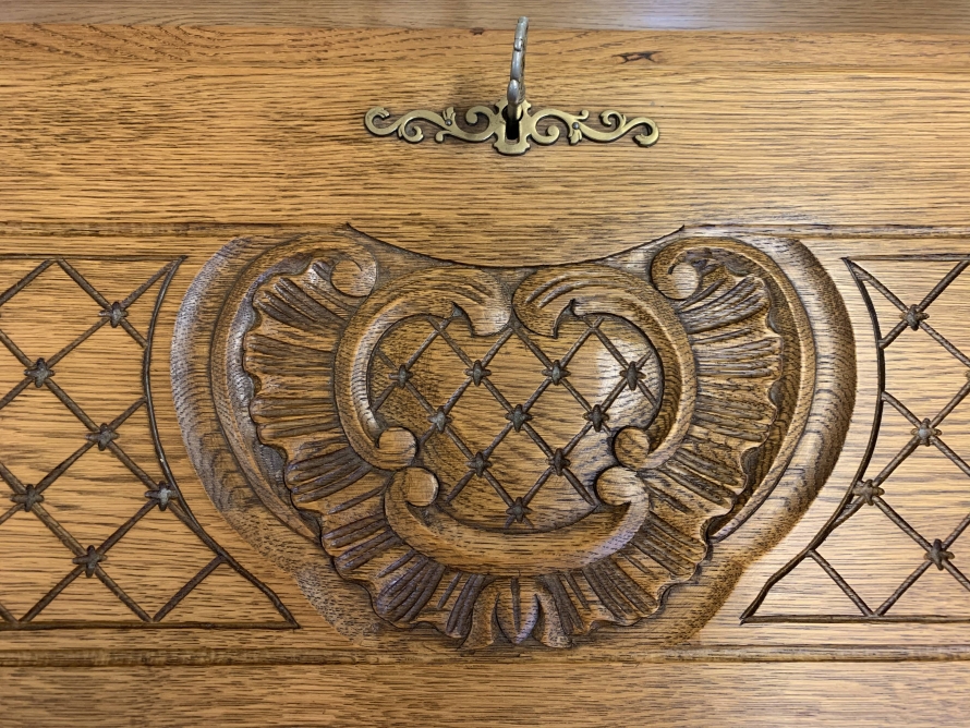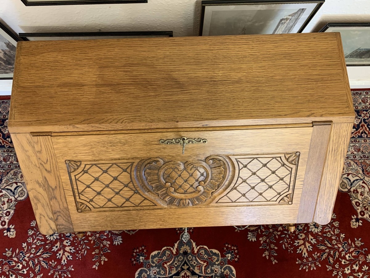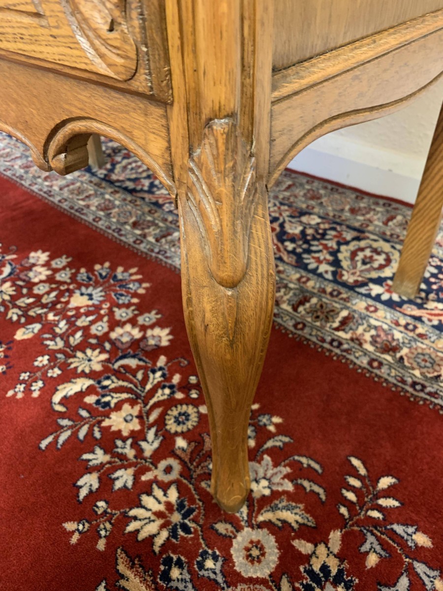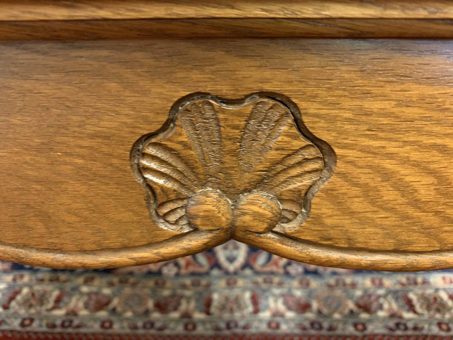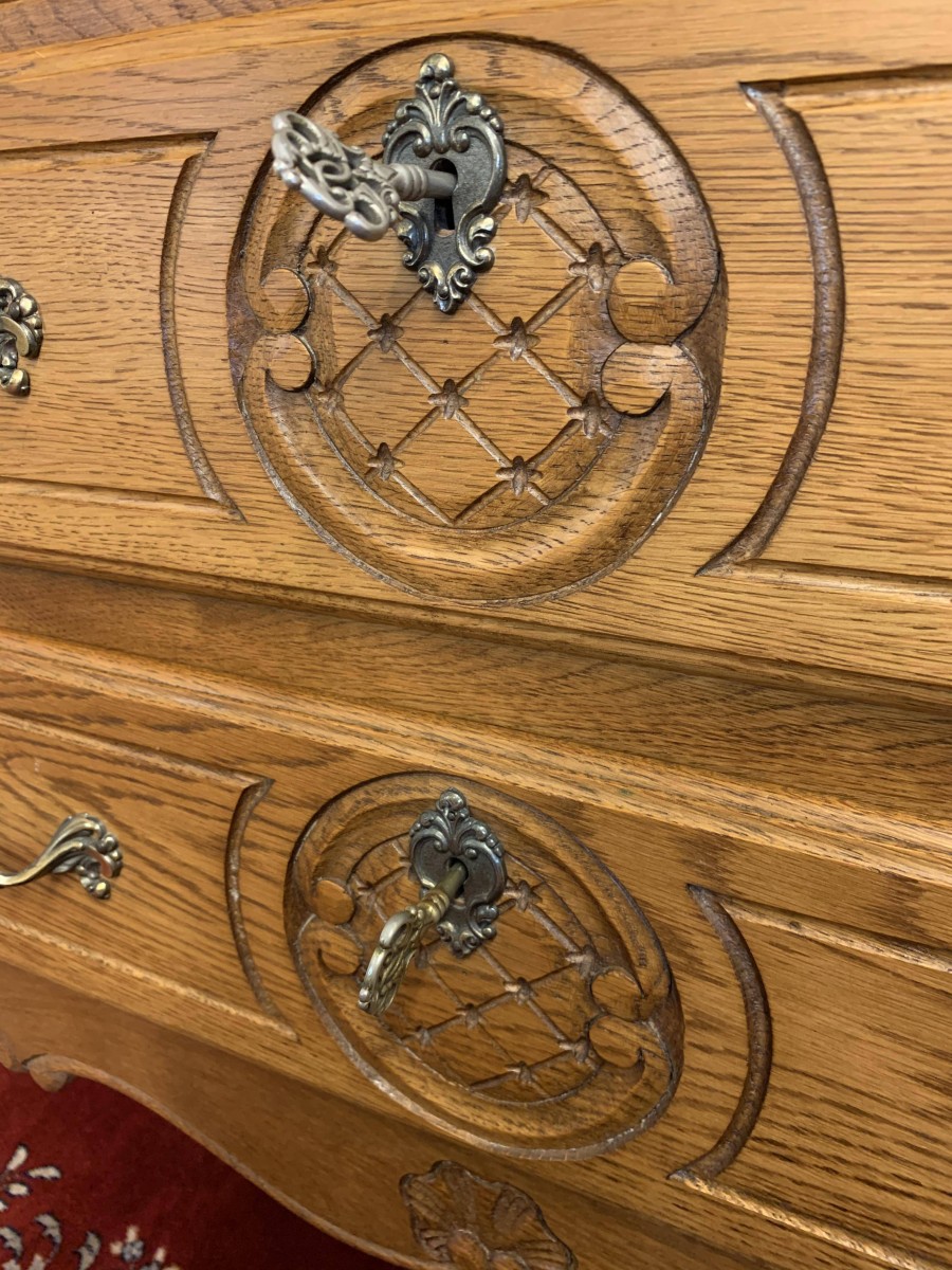 The lockable carved fall front opens and sits on two retractable rests. The fall opens to reveal two drawers, pigeon holes and writing space. Below are two carved lockable drawers, each drawer having a pair of brass ornate handles and key. Recessed panelled sides, shaped skirt with ornate central carving, this beautiful French bureau stands on two carved cabriole shaped legs to the front.