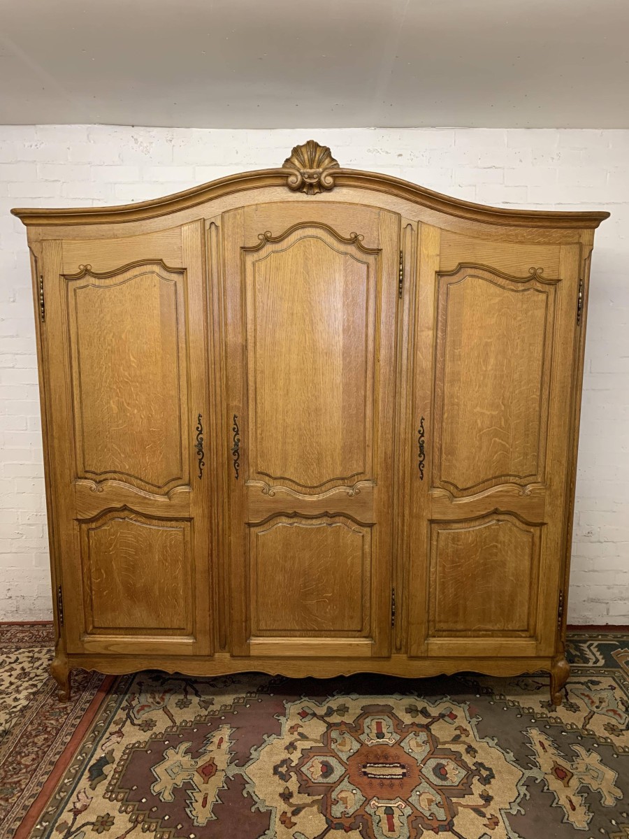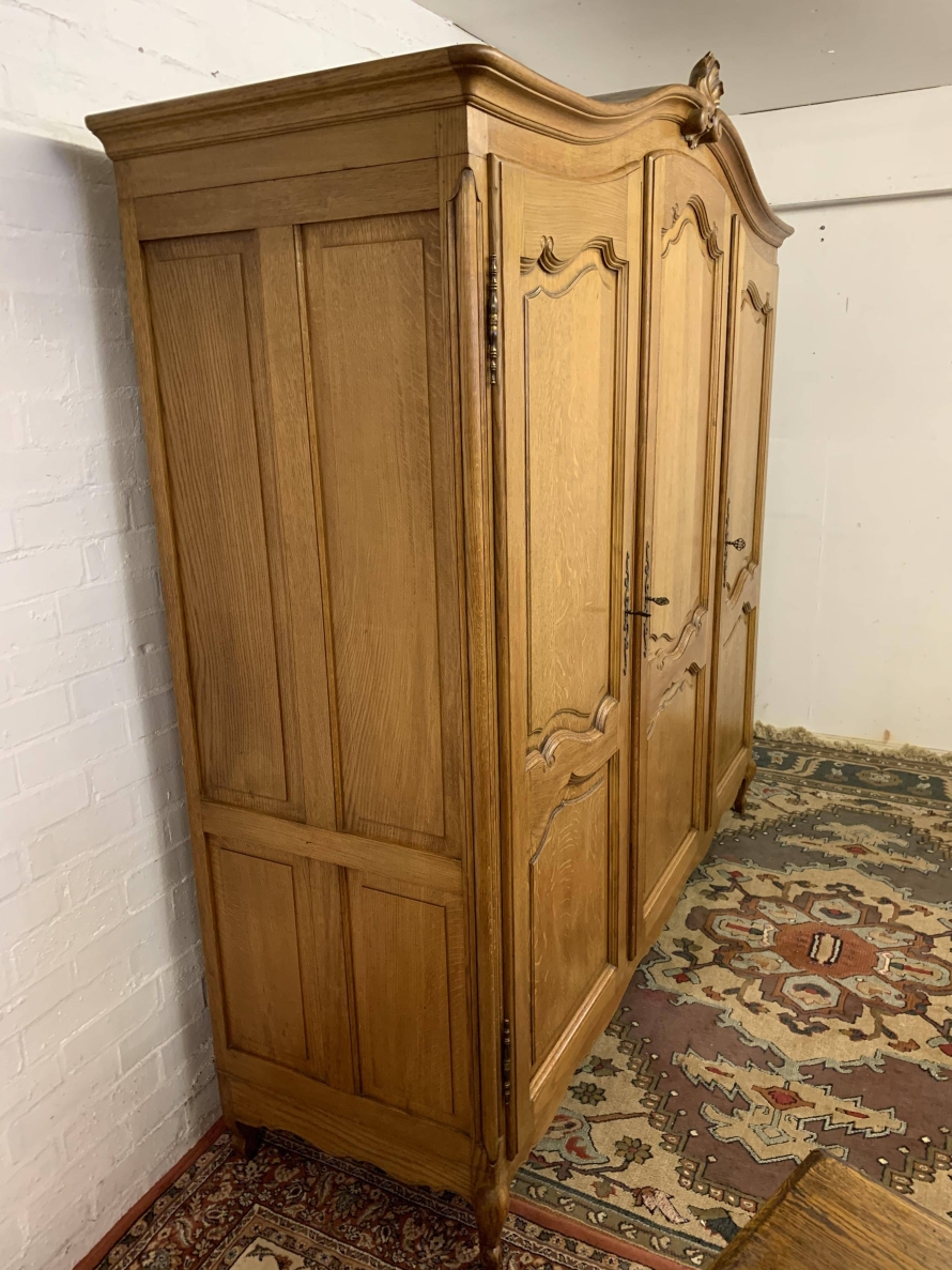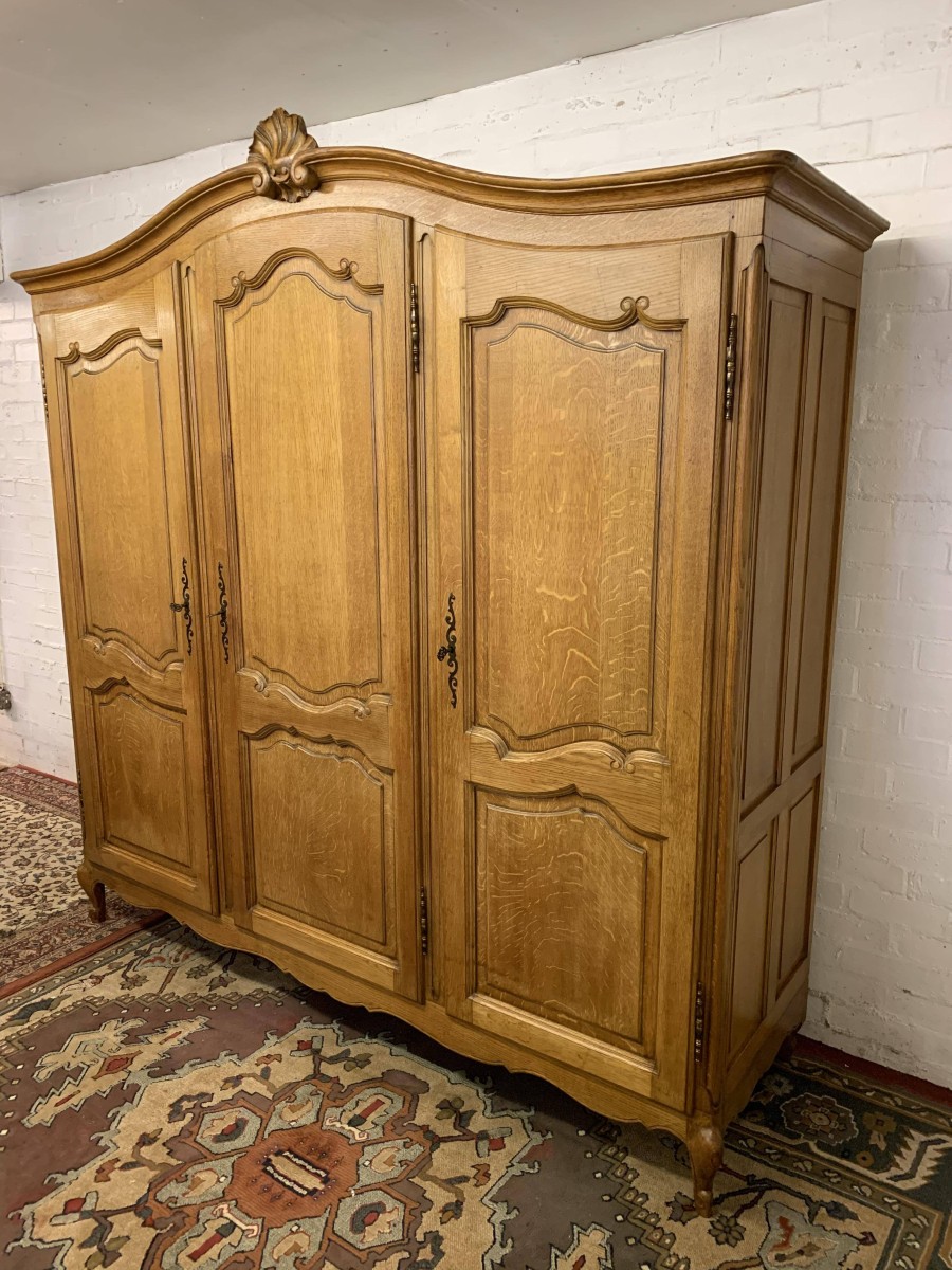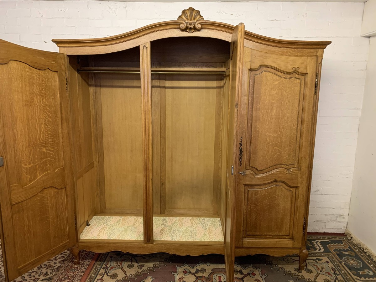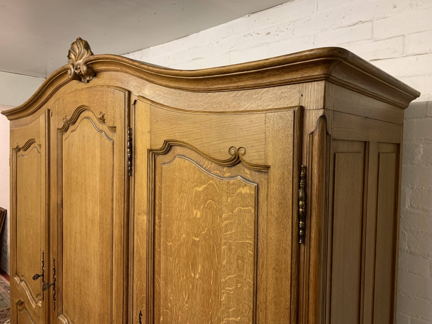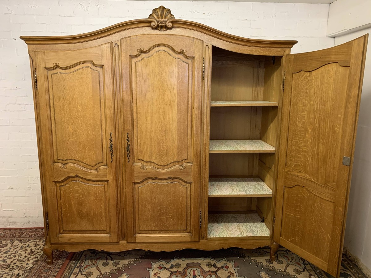 The shaped oversailing top rises to a central fan carving. Below are three lockable shaped recessed panels doors, each door having brass hinges, decorative brass escutcheon and key. The left-hand door and central door open to reveal a shelf above a brass hanging rail. The right-hand door opens to reveal three removable shelves. The armoire offers excellent storage. Recessed panelled sides shaped skirt this, fantastic French armoire stands on carved cabriole shaped legs to the front.