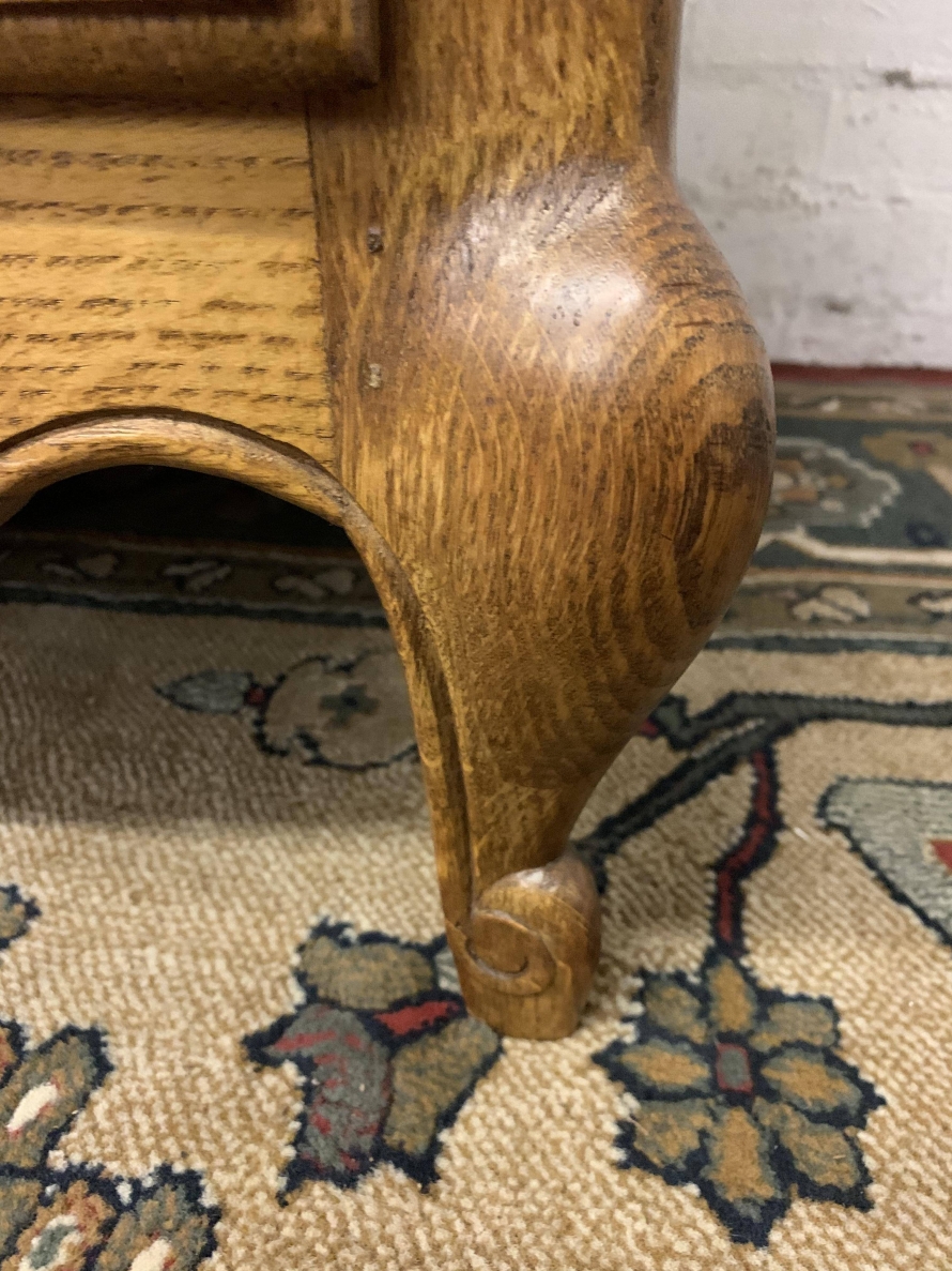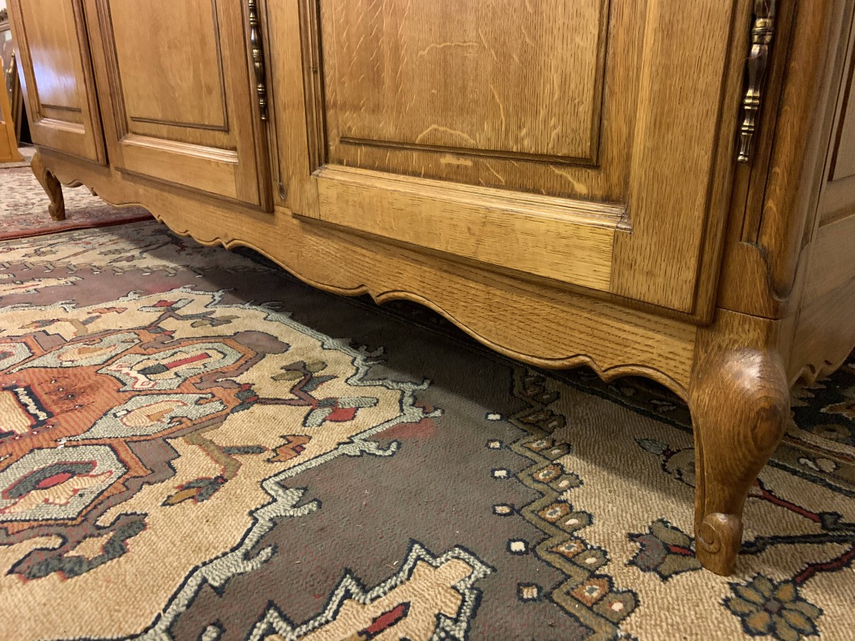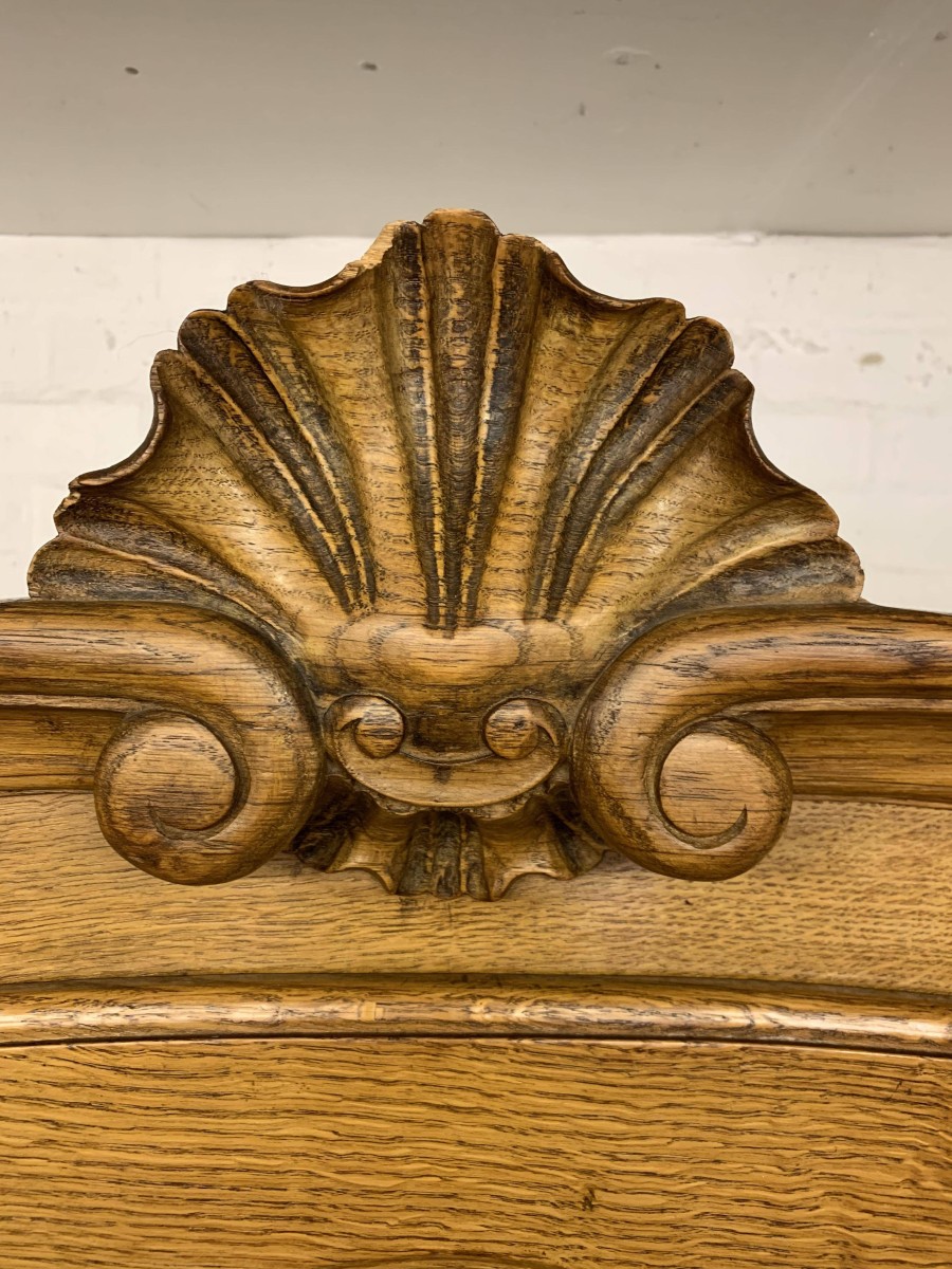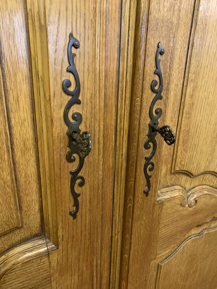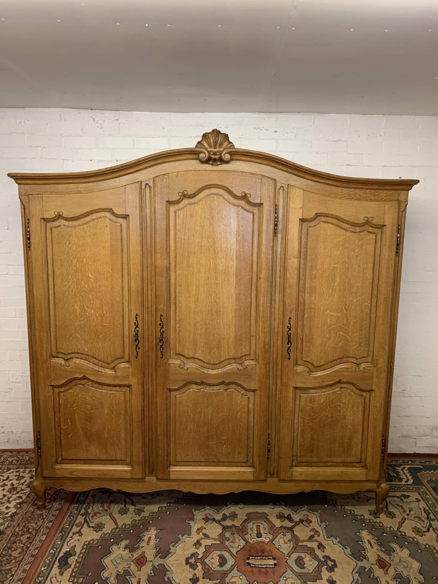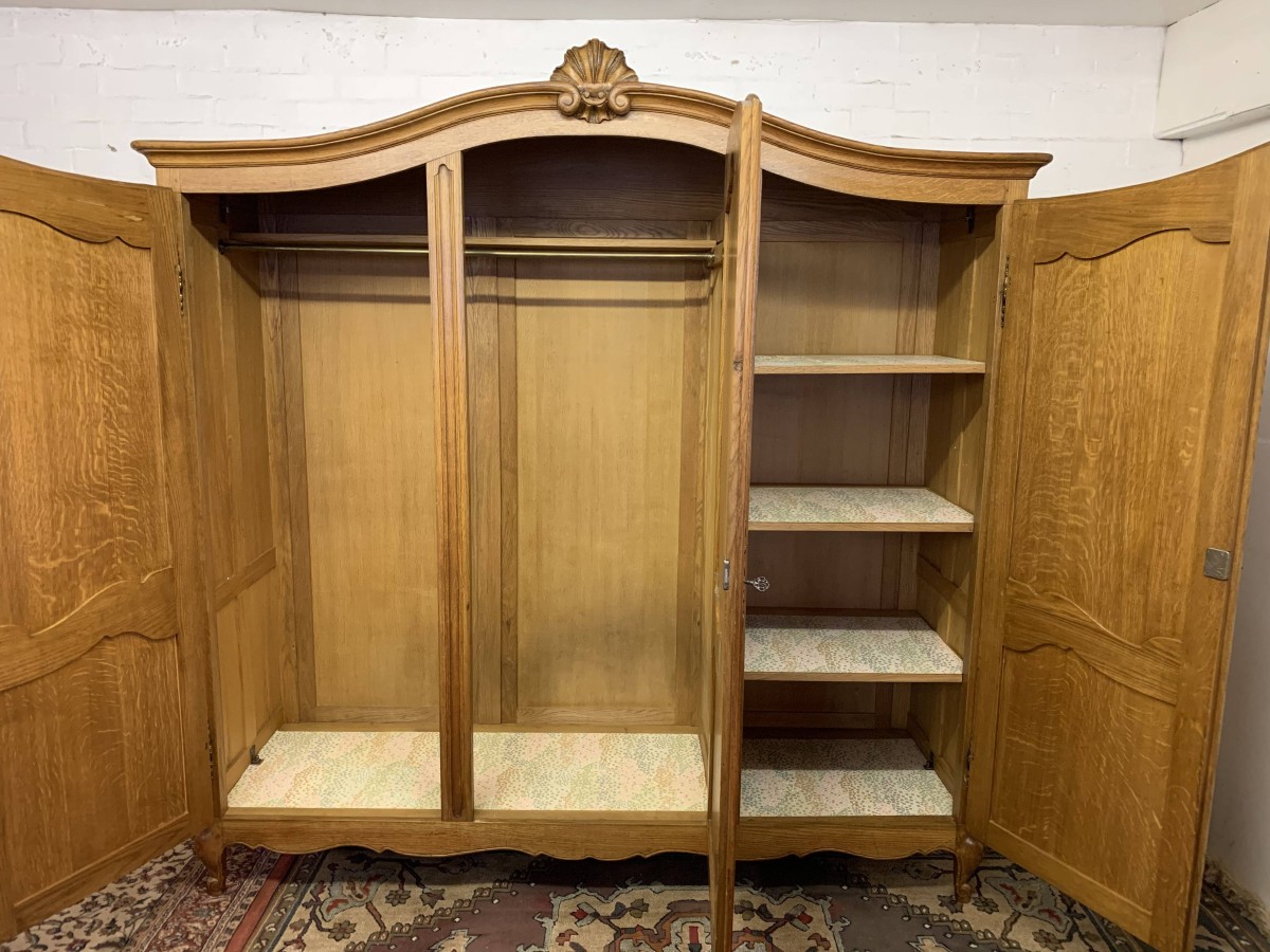 The shaped oversailing top rises to a central fan carving. Below are three lockable shaped recessed panels doors, each door having brass hinges, decorative brass escutcheon and key. The left-hand door and central door open to reveal a shelf above a brass hanging rail. The right-hand door opens to reveal three removable shelves. The armoire offers excellent storage. Recessed panelled sides shaped skirt this, fantastic French armoire stands on carved cabriole shaped legs to the front.