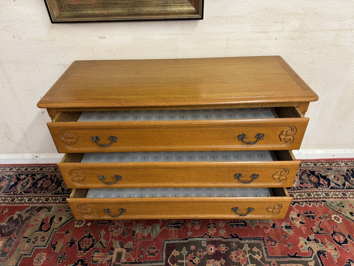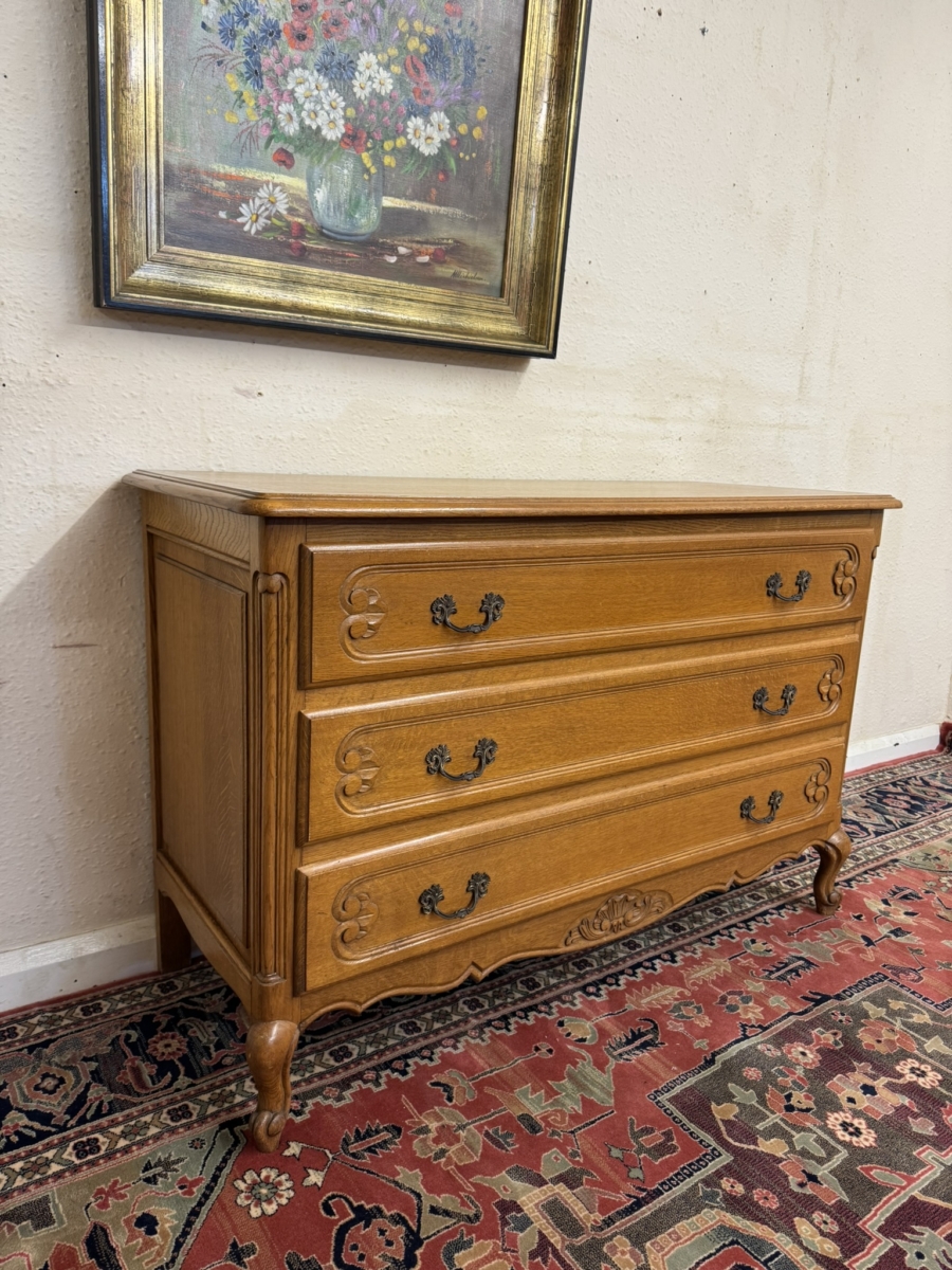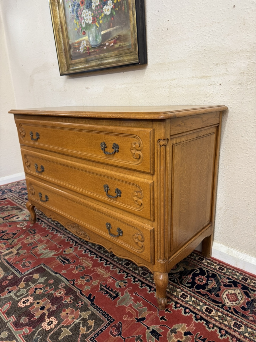 This fine French chest is in excellent condition. The over sailing top has a cross banded edging, below are three long drawers, each drawer having a pair of ornate handles and carved decoration. Recessed panelled sides, shaped skirt with central carving and standing on carved cabriole legs to the front.