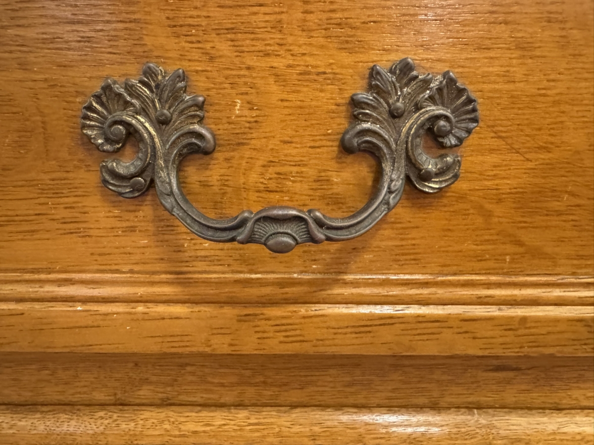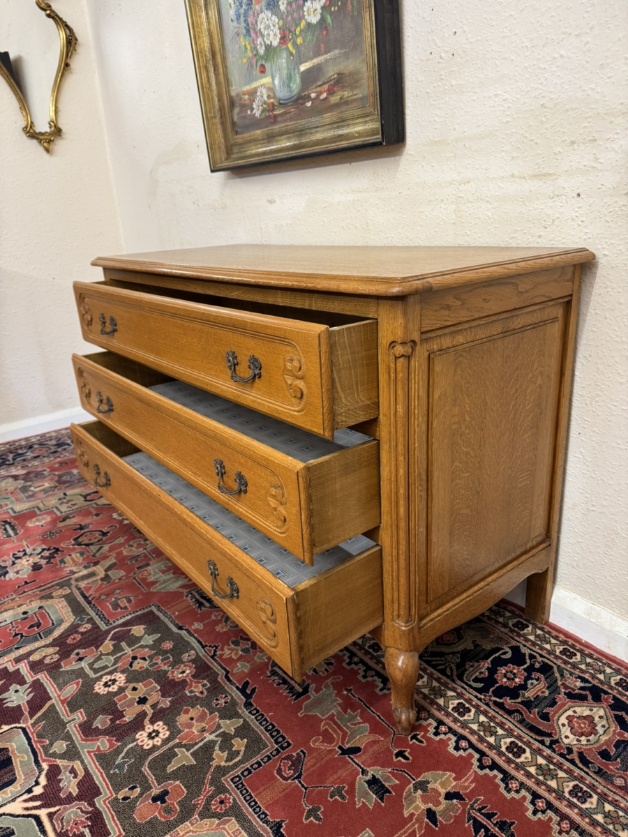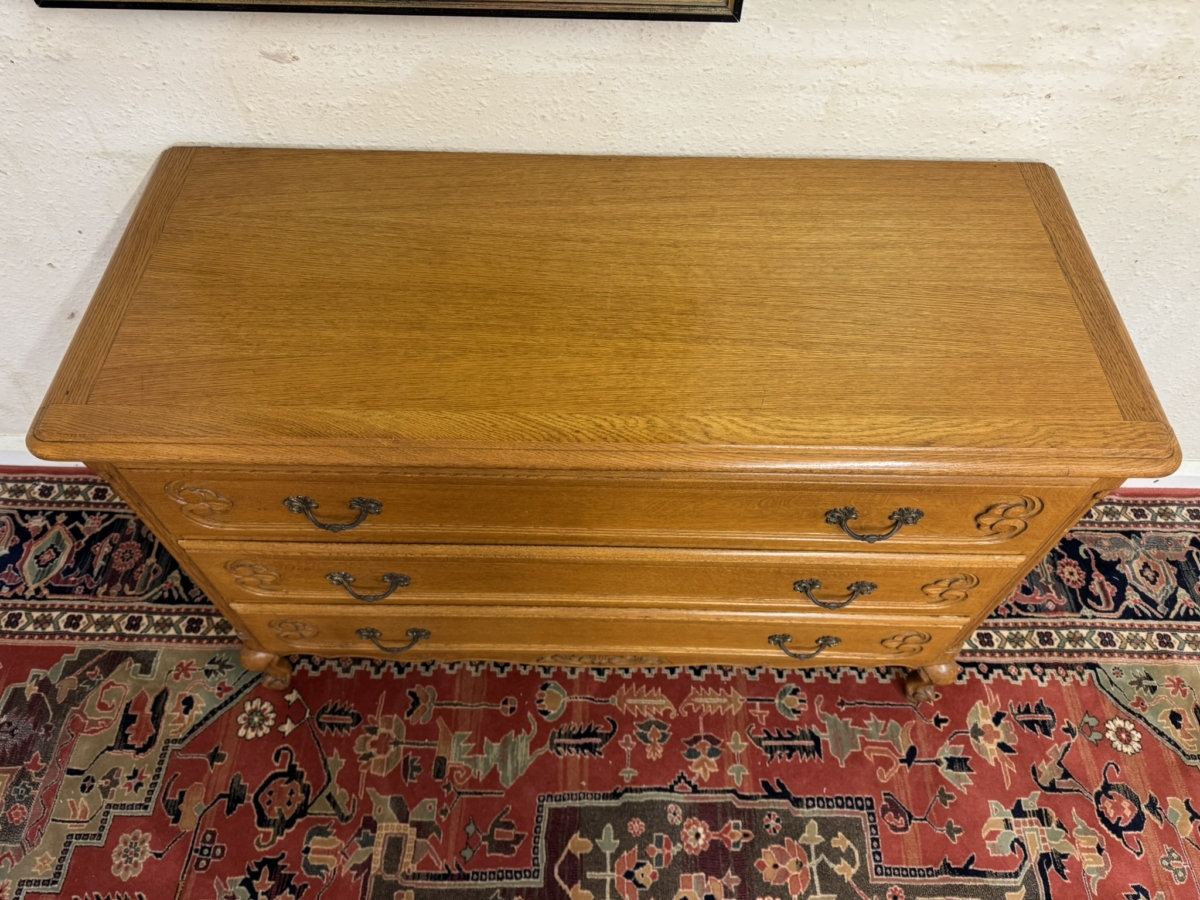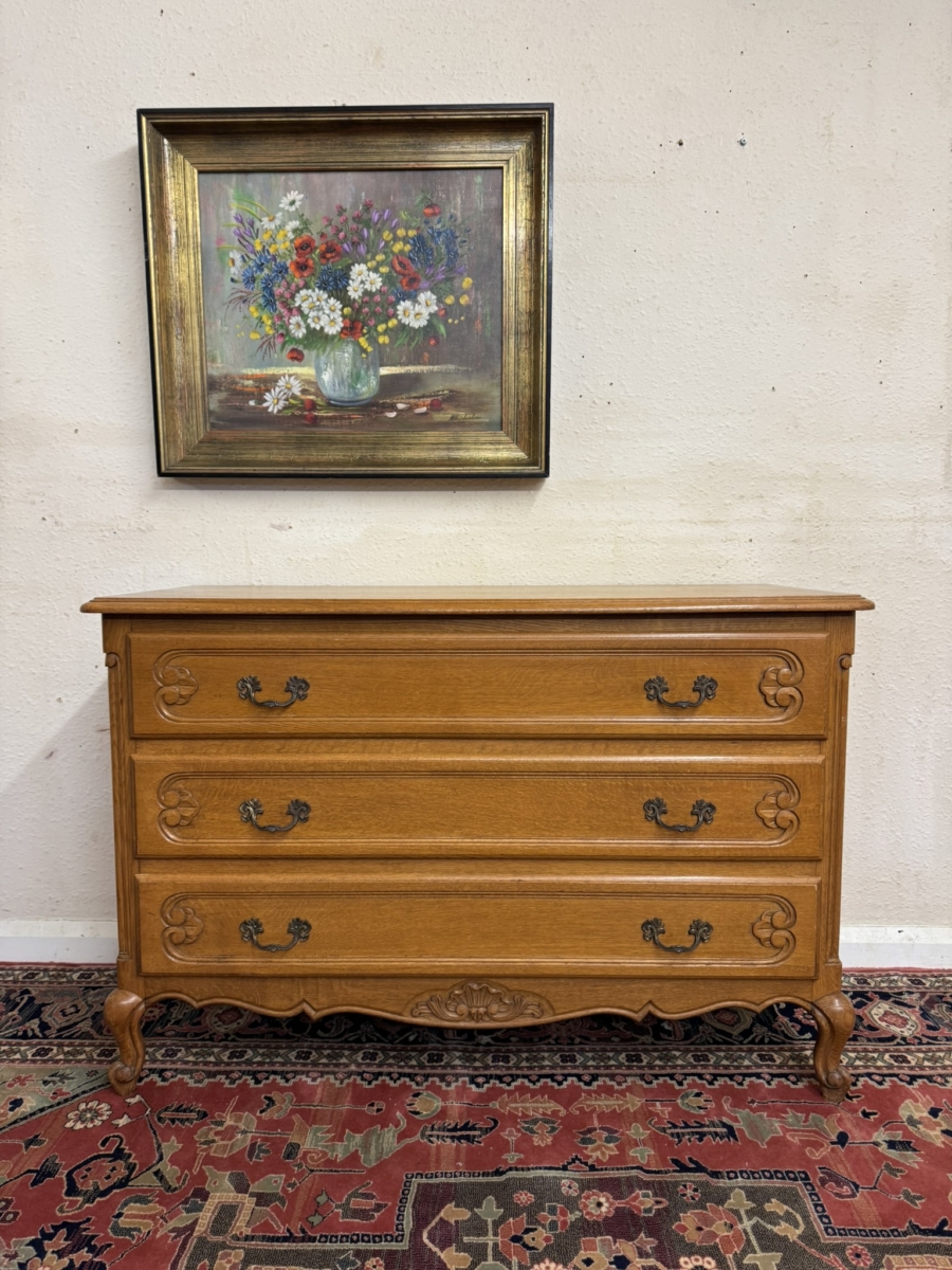 This fine French chest is in excellent condition. The over sailing top has a cross banded edging, below are three long drawers, each drawer having a pair of ornate handles and carved decoration. Recessed panelled sides, shaped skirt with central carving and standing on carved cabriole legs to the front.