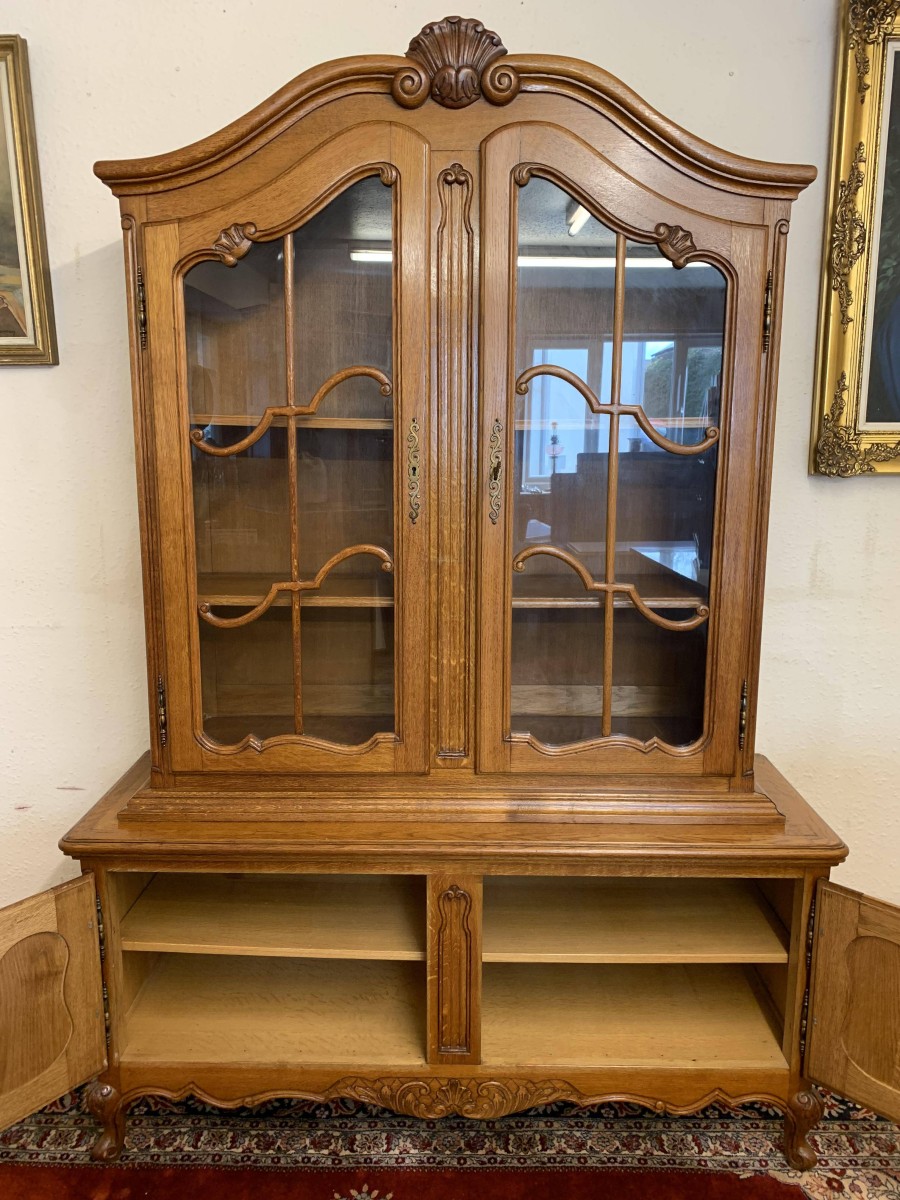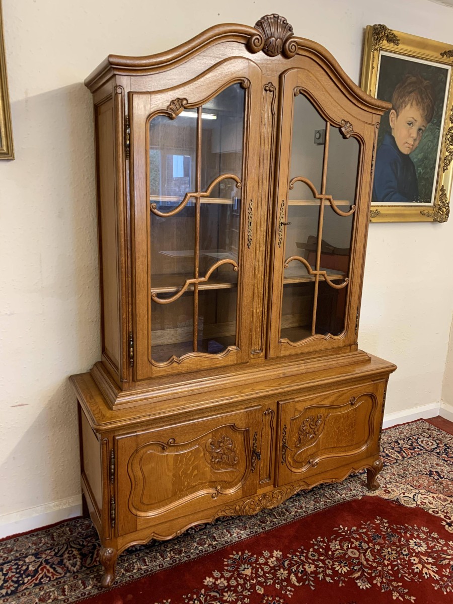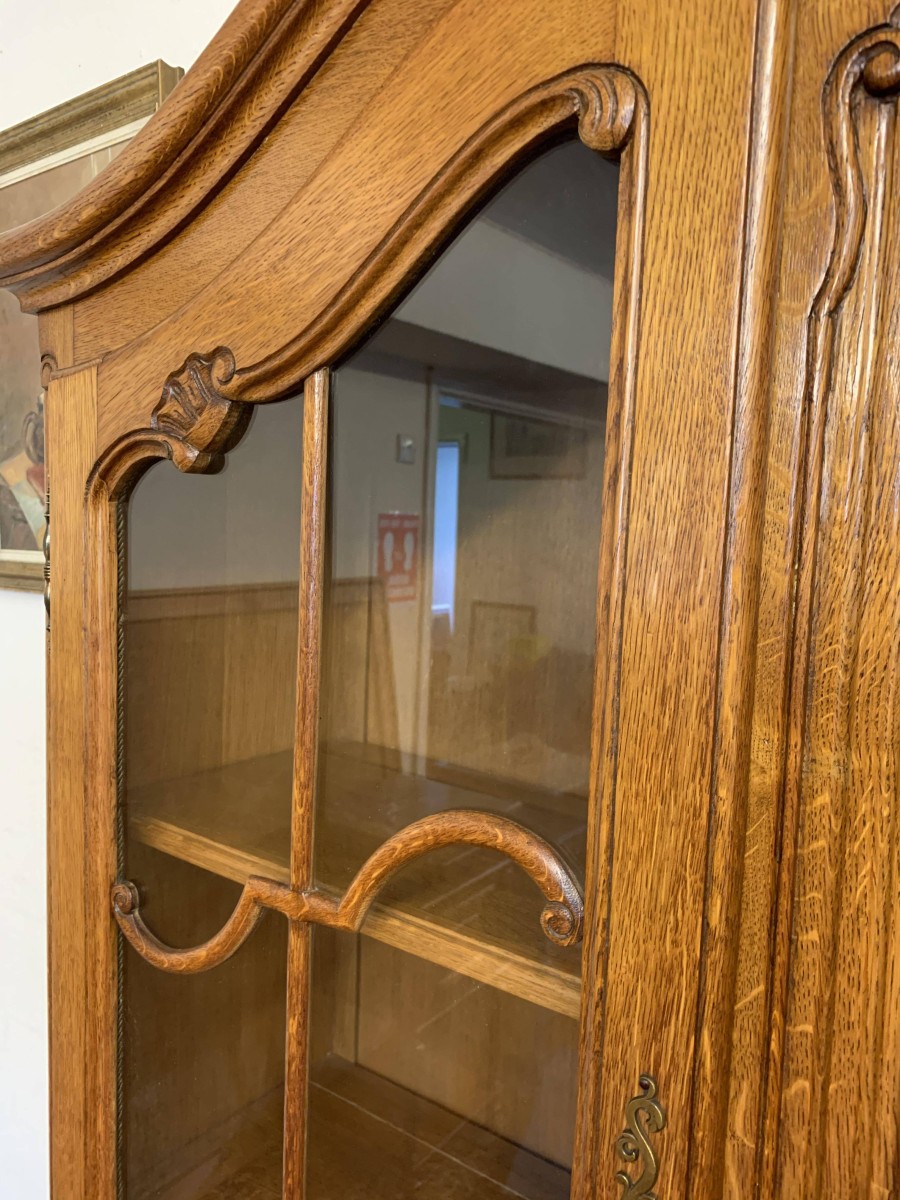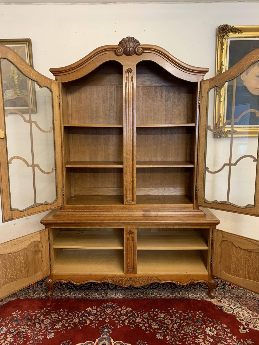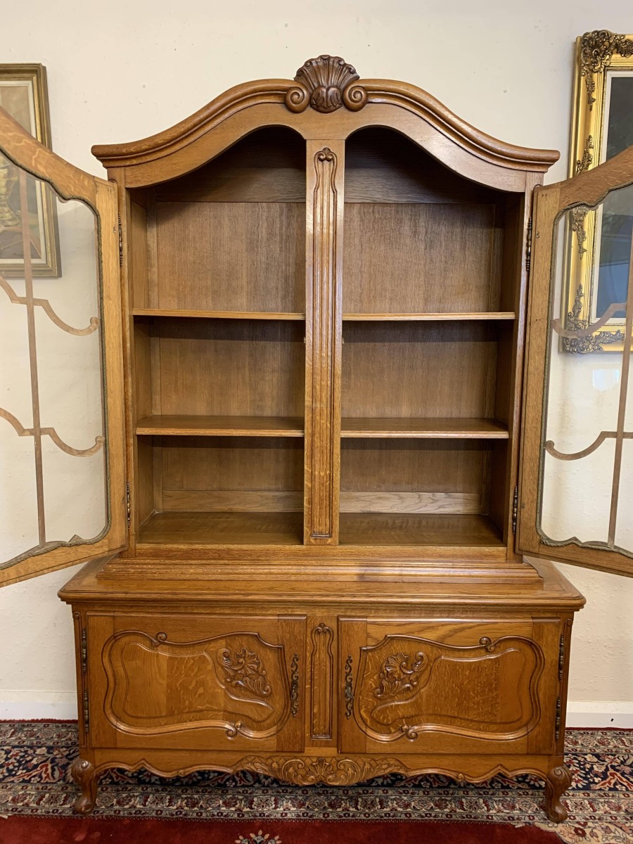 The shaped top rises to a central carving. Below are a pair of lockable glazed doors with shaped wood barring. Each door having brass hinges and decorative brass escutcheon. The doors open to reveal two removable shelves. Below are a pair of lockable shaped carved recessed panelled doors, each door having brass hinges, decorative brass escutcheon and brass key. The doors open to reveal a removable shelf. Recessed panelled sides, shaped skirt with decorative fan carving this beautiful example of French oak antique furniture stands on two carved shaped cabriole legs to the front.