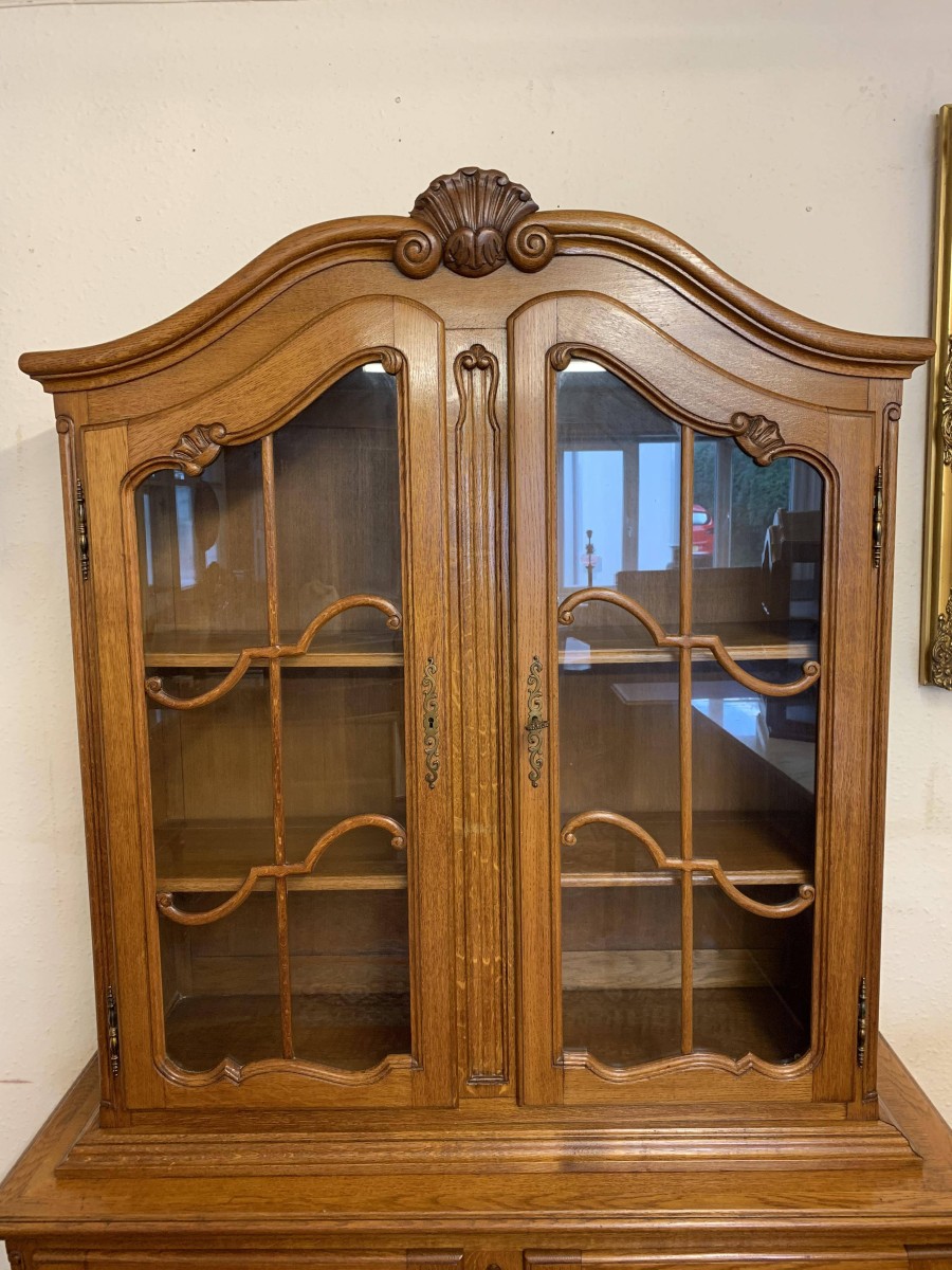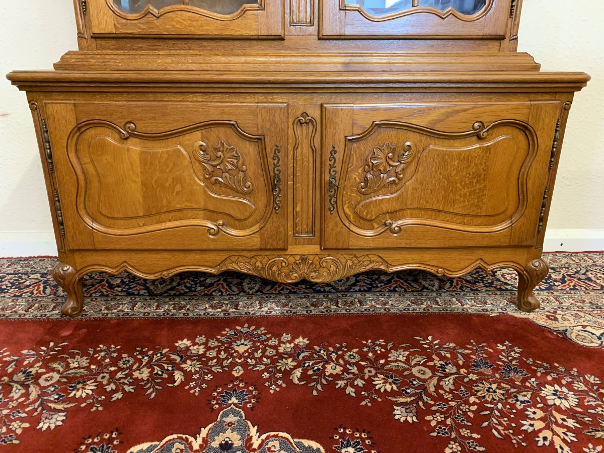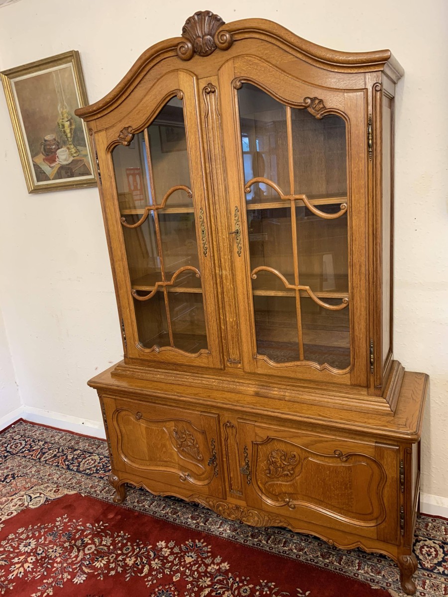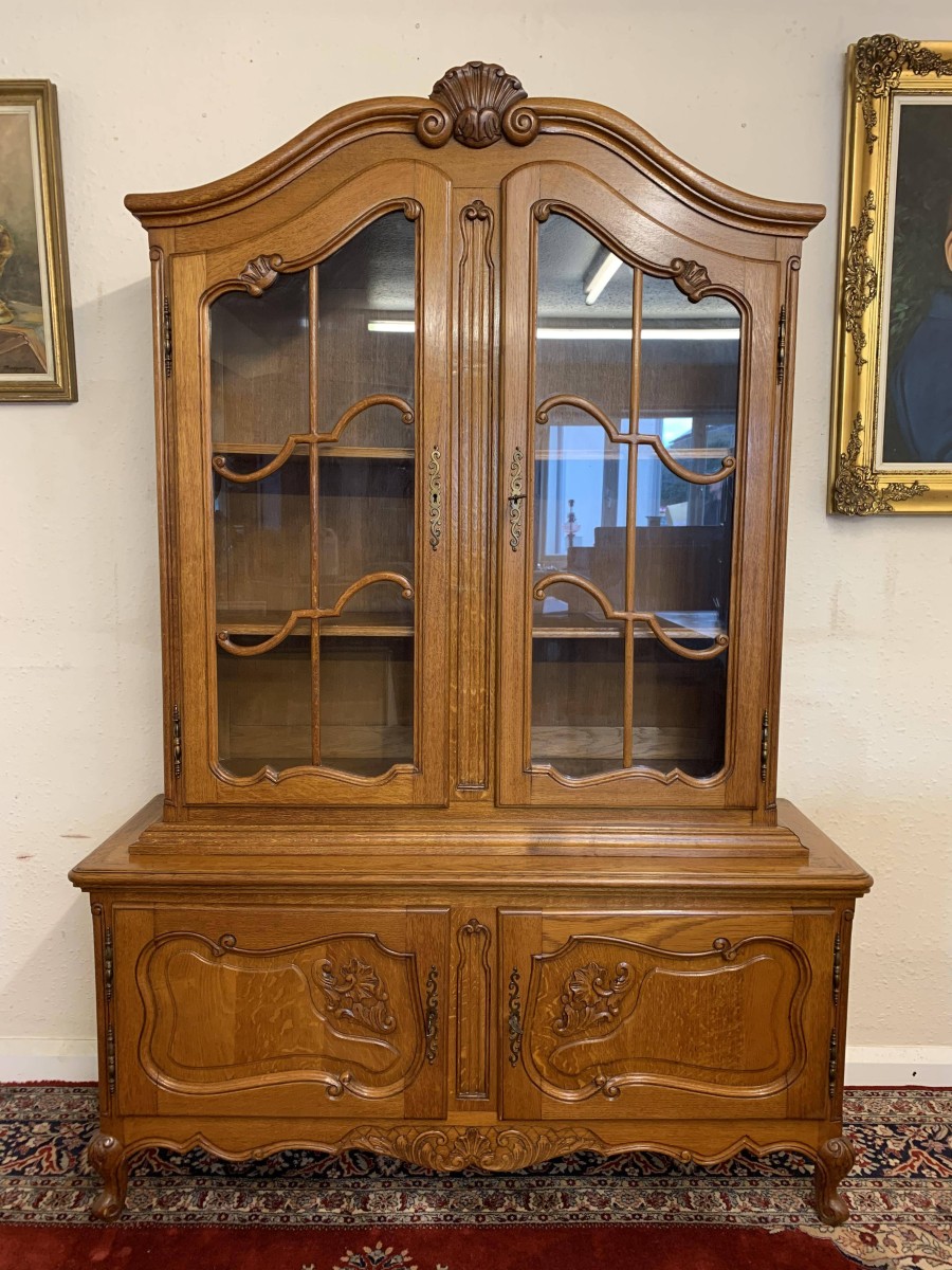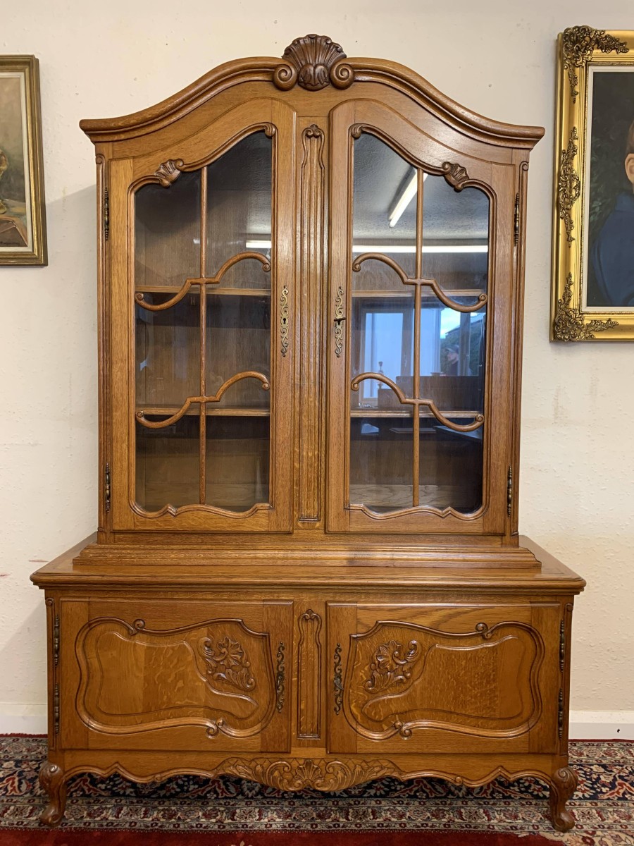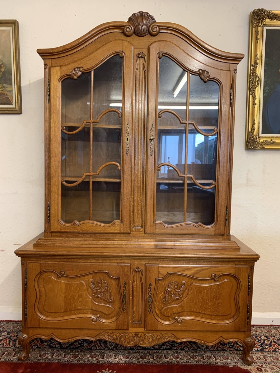 The shaped top rises to a central carving. Below are a pair of lockable glazed doors with shaped wood barring. Each door having brass hinges and decorative brass escutcheon. The doors open to reveal two removable shelves. Below are a pair of lockable shaped carved recessed panelled doors, each door having brass hinges, decorative brass escutcheon and brass key. The doors open to reveal a removable shelf. Recessed panelled sides, shaped skirt with decorative fan carving this beautiful example of French oak antique furniture stands on two carved shaped cabriole legs to the front.