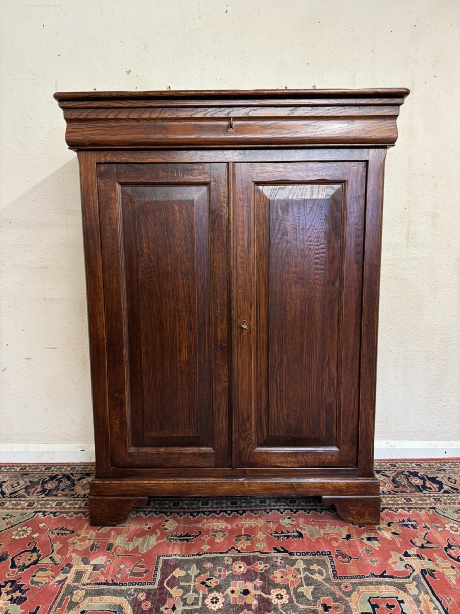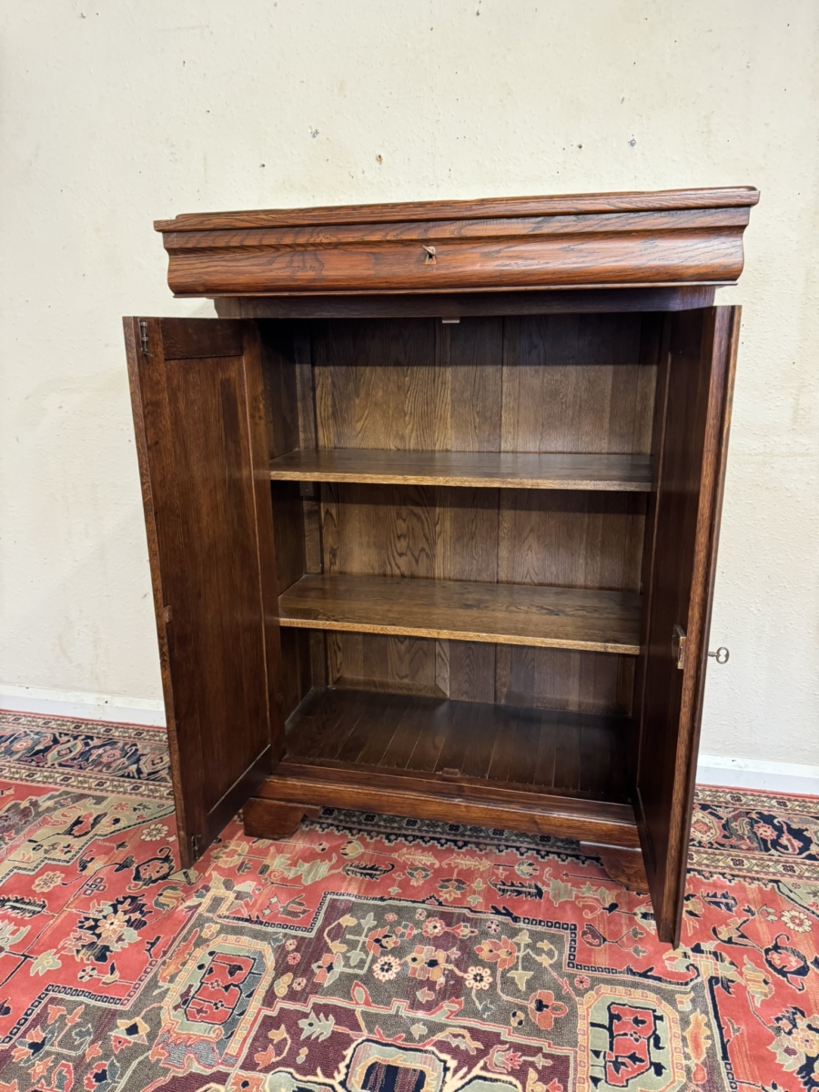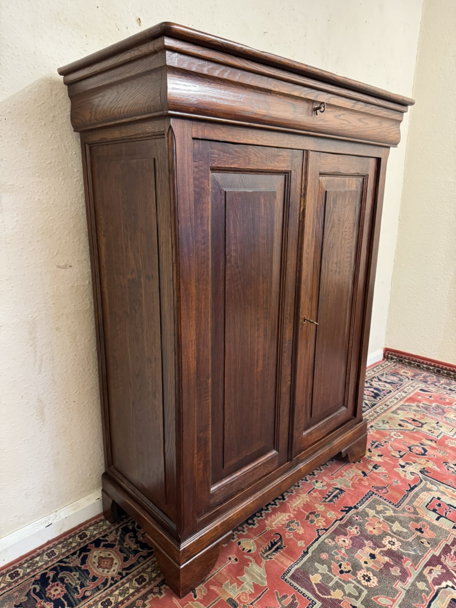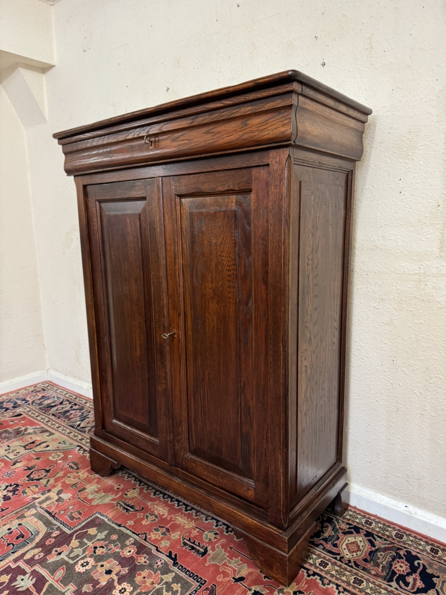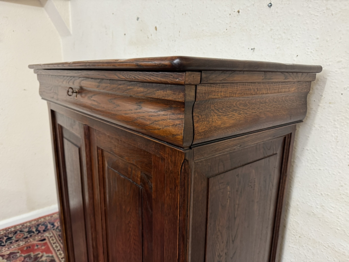 This super cupboard is in excellent condition. The over sailing top sits above a lockable drawer, below is a pair of lockable fielded panelled doors, the doors open to reveal two removable shelves. Fielded panelled sides and standing on four bracket feet.