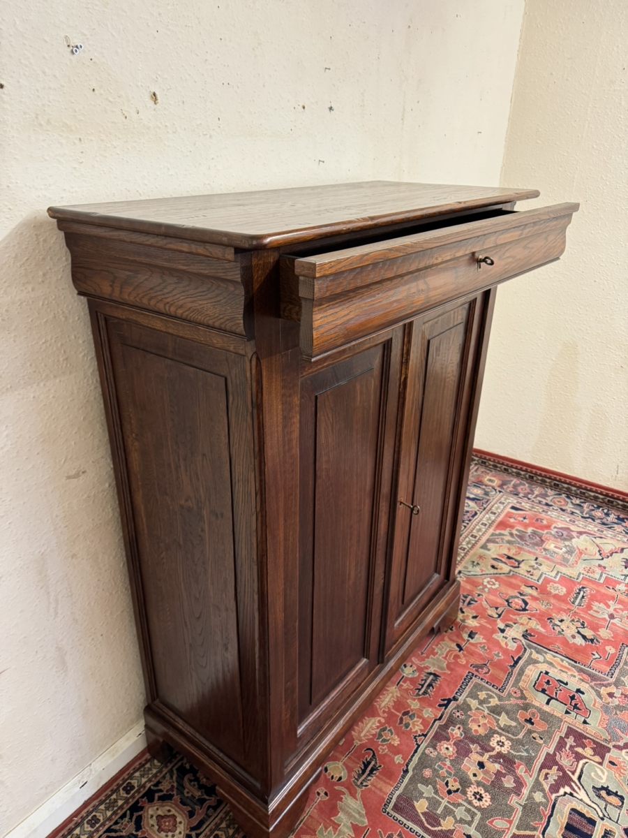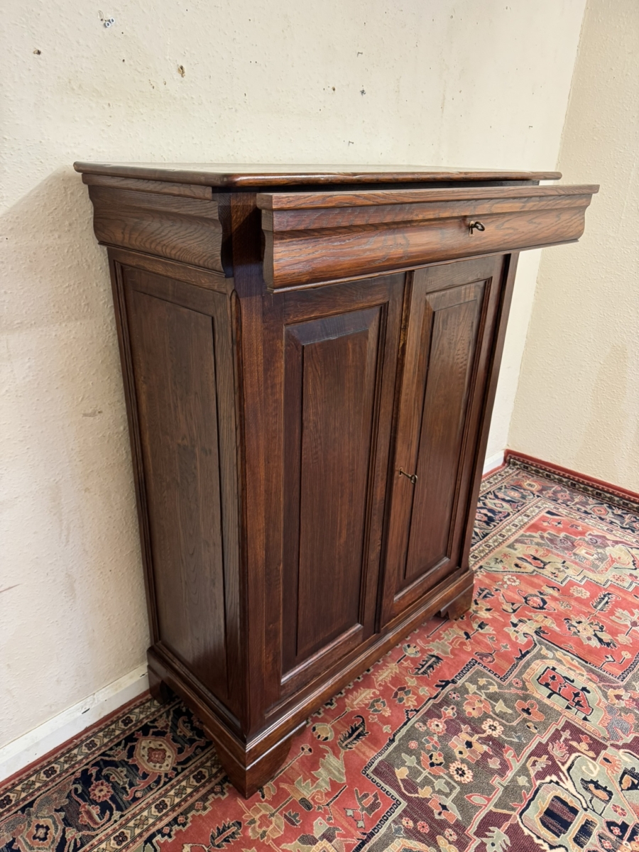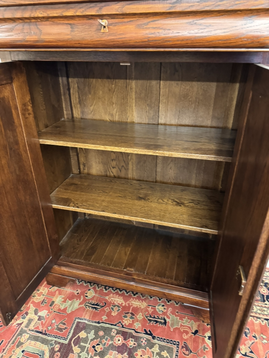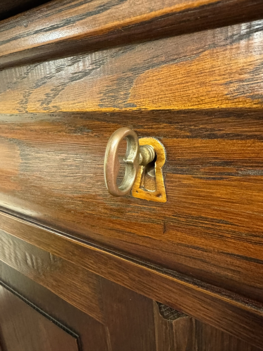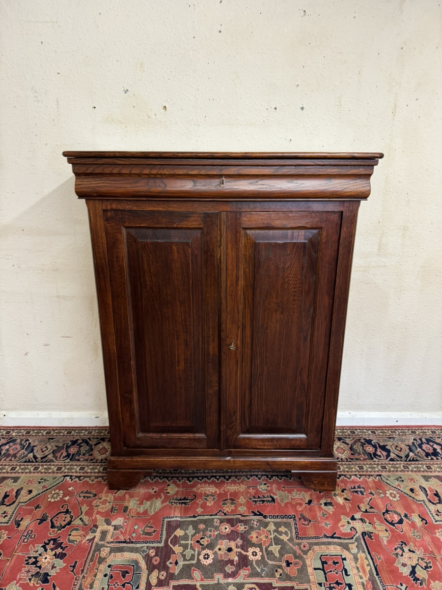 This super cupboard is in excellent condition. The over sailing top sits above a lockable drawer, below is a pair of lockable fielded panelled doors, the doors open to reveal two removable shelves. Fielded panelled sides and standing on four bracket feet.