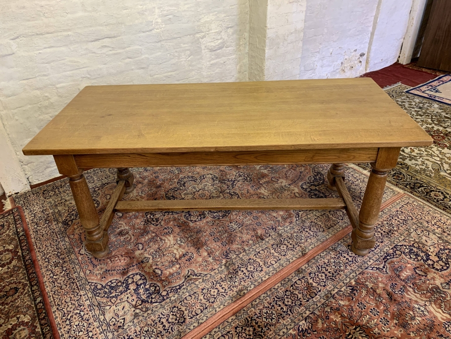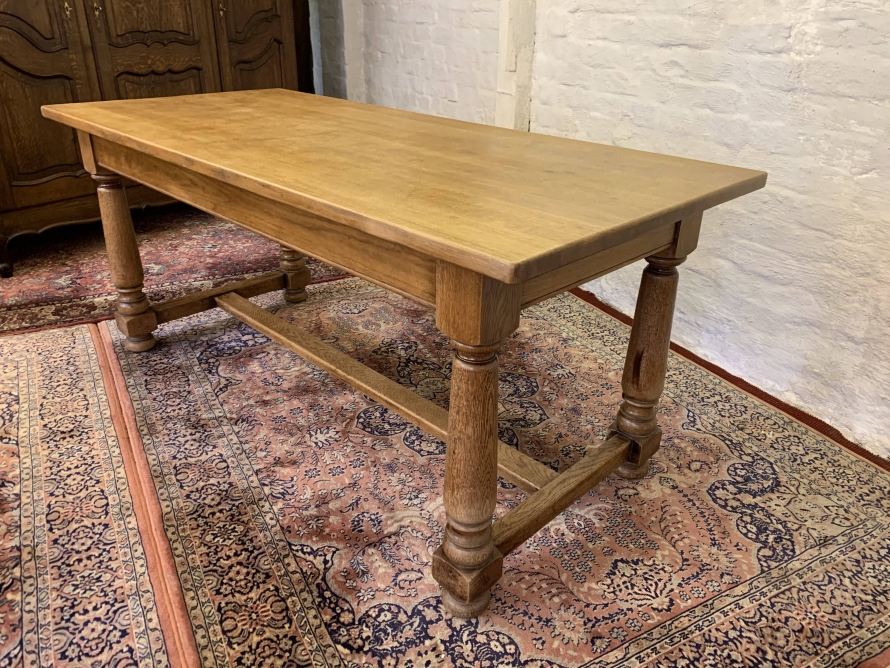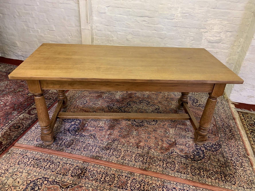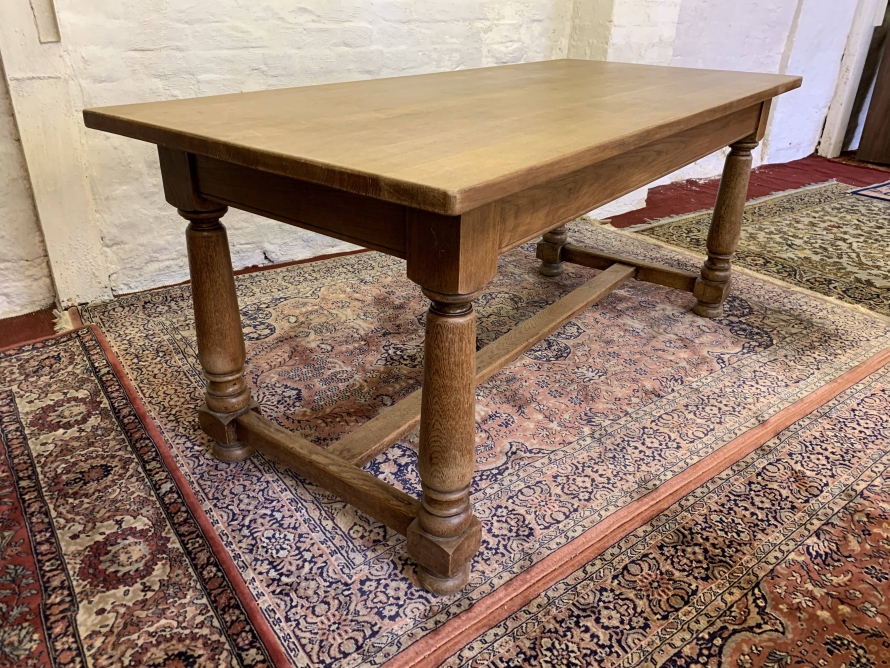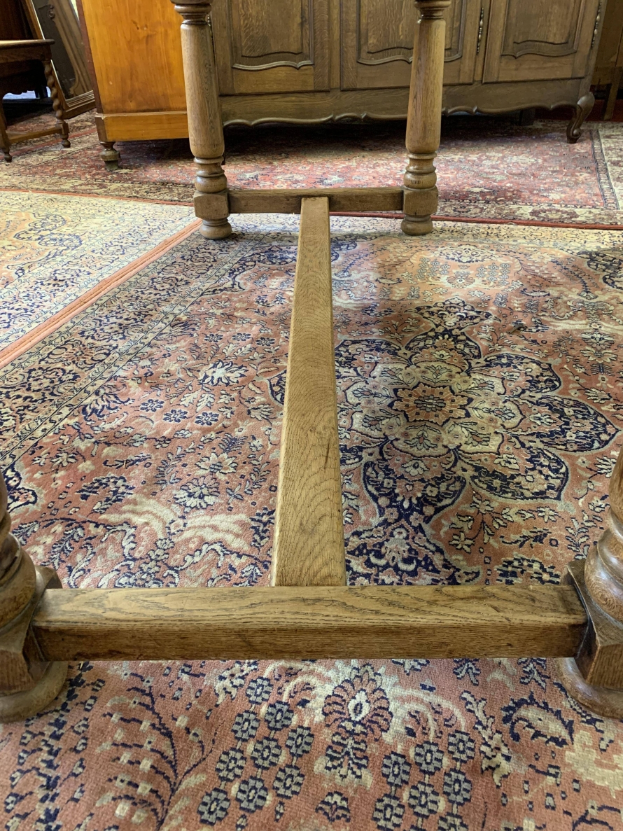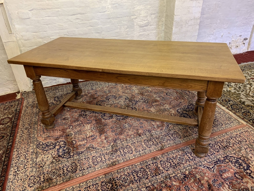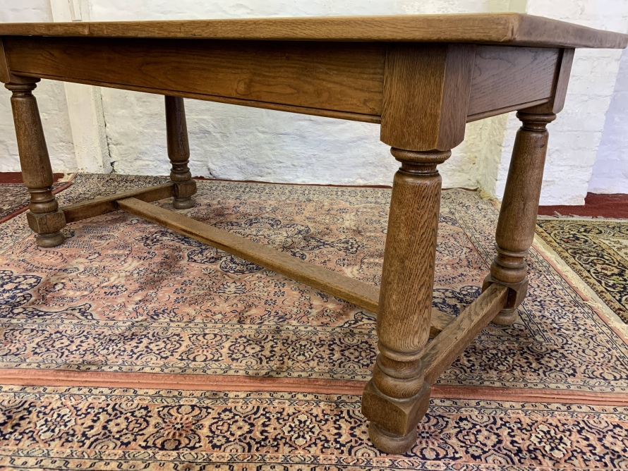 Made in glorious solid oak the table would be a fabulous addition to any home. The oversailing top sits above four turned legs, stretcher support and standing on four bun feet.