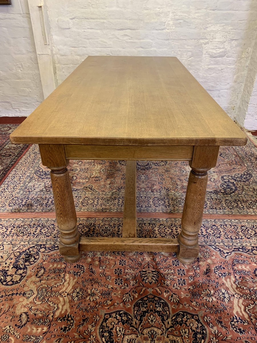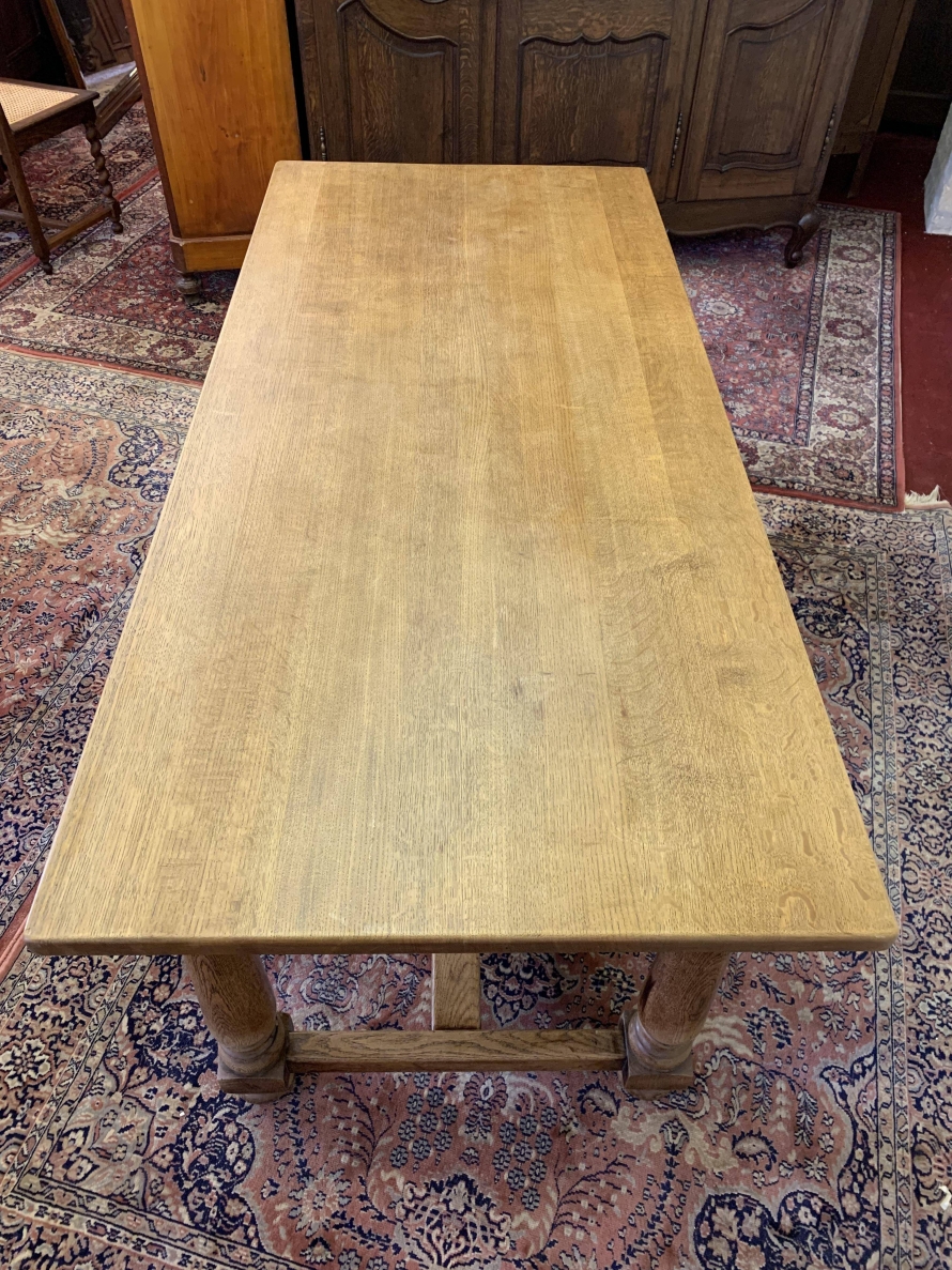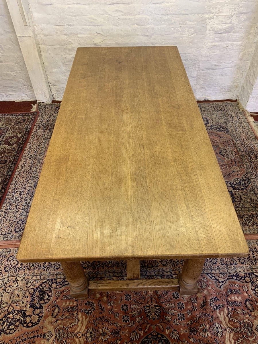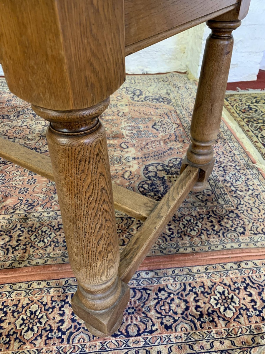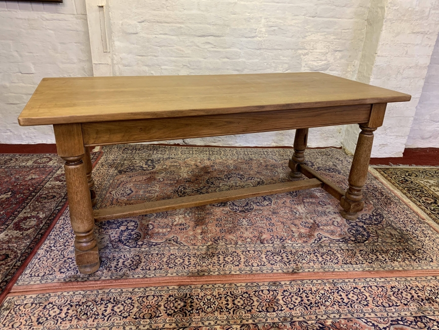 Made in glorious solid oak the table would be a fabulous addition to any home. The oversailing top sits above four turned legs, stretcher support and standing on four bun feet.