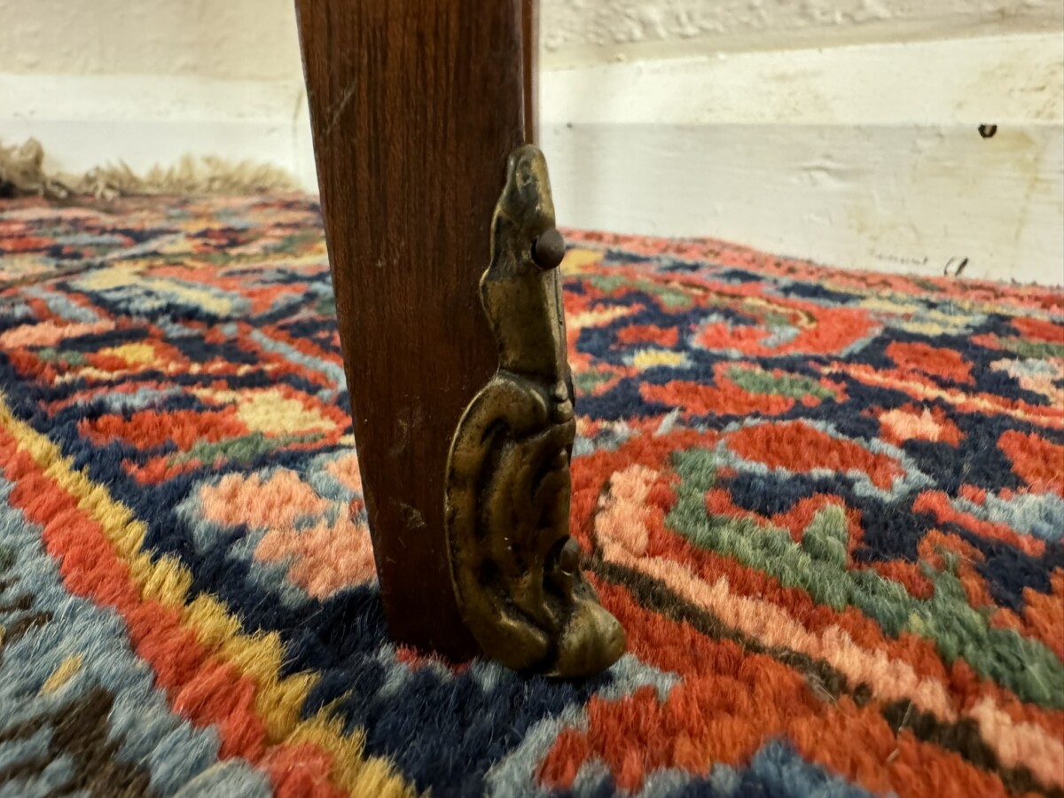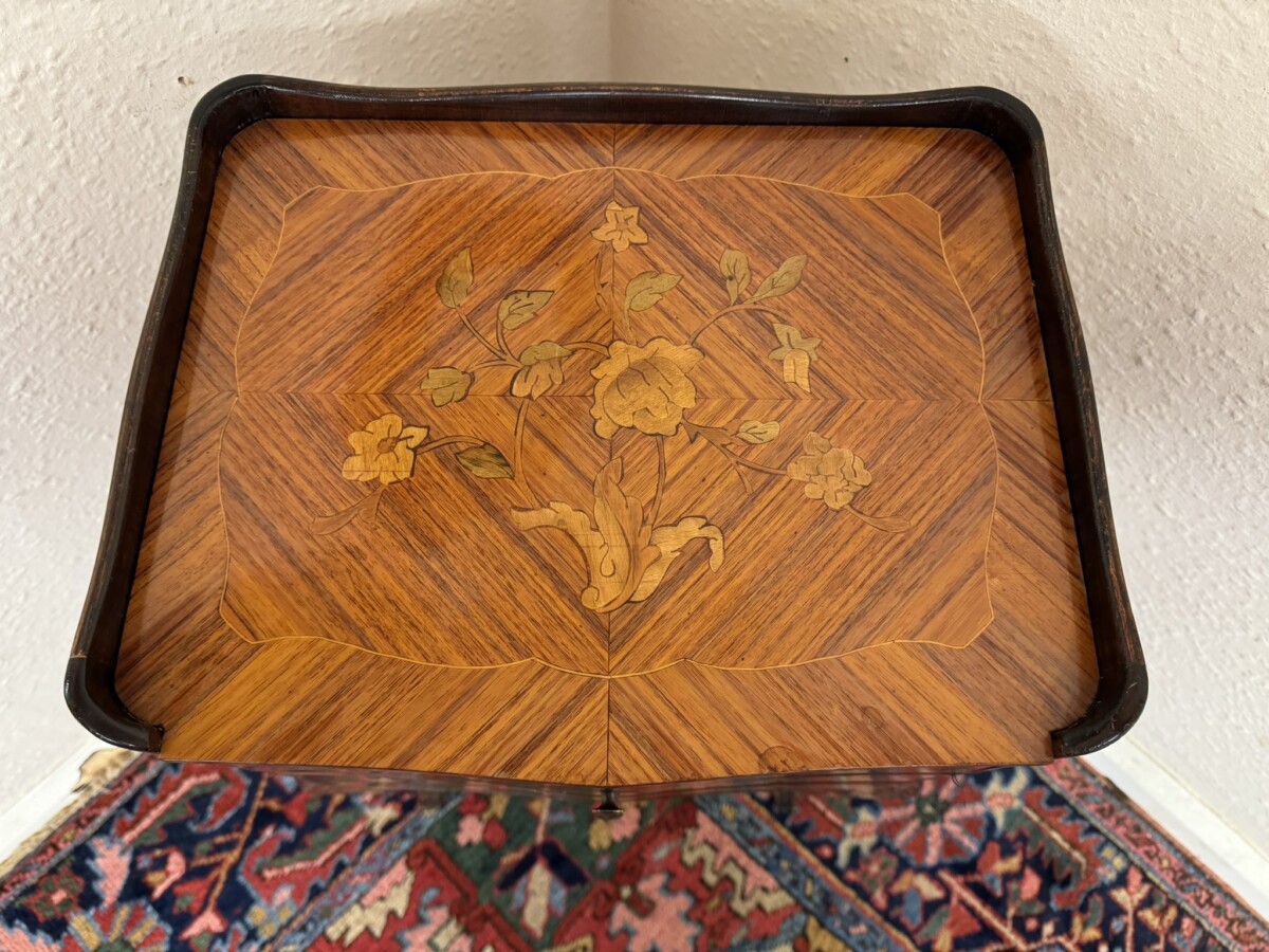 The floral inlaid top has a galleried back and sides, below are three curved inlaid drawers, each drawer having a button brass knob handle. Inlaid decorated sides and standing on four shaped legs, the front legs having gilt brass caps to the feet.
