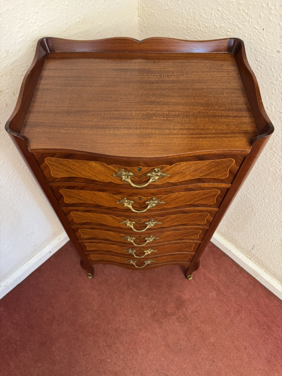 This elegant chest has a galleried back and sides to the top, below are six inlaid shaped drawers, each drawer having an ornate brass handle. Standing on four cabriole shaped legs with gilt mounts to the front.