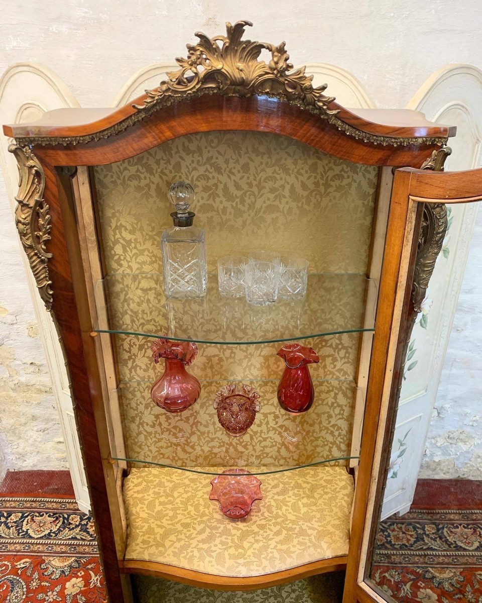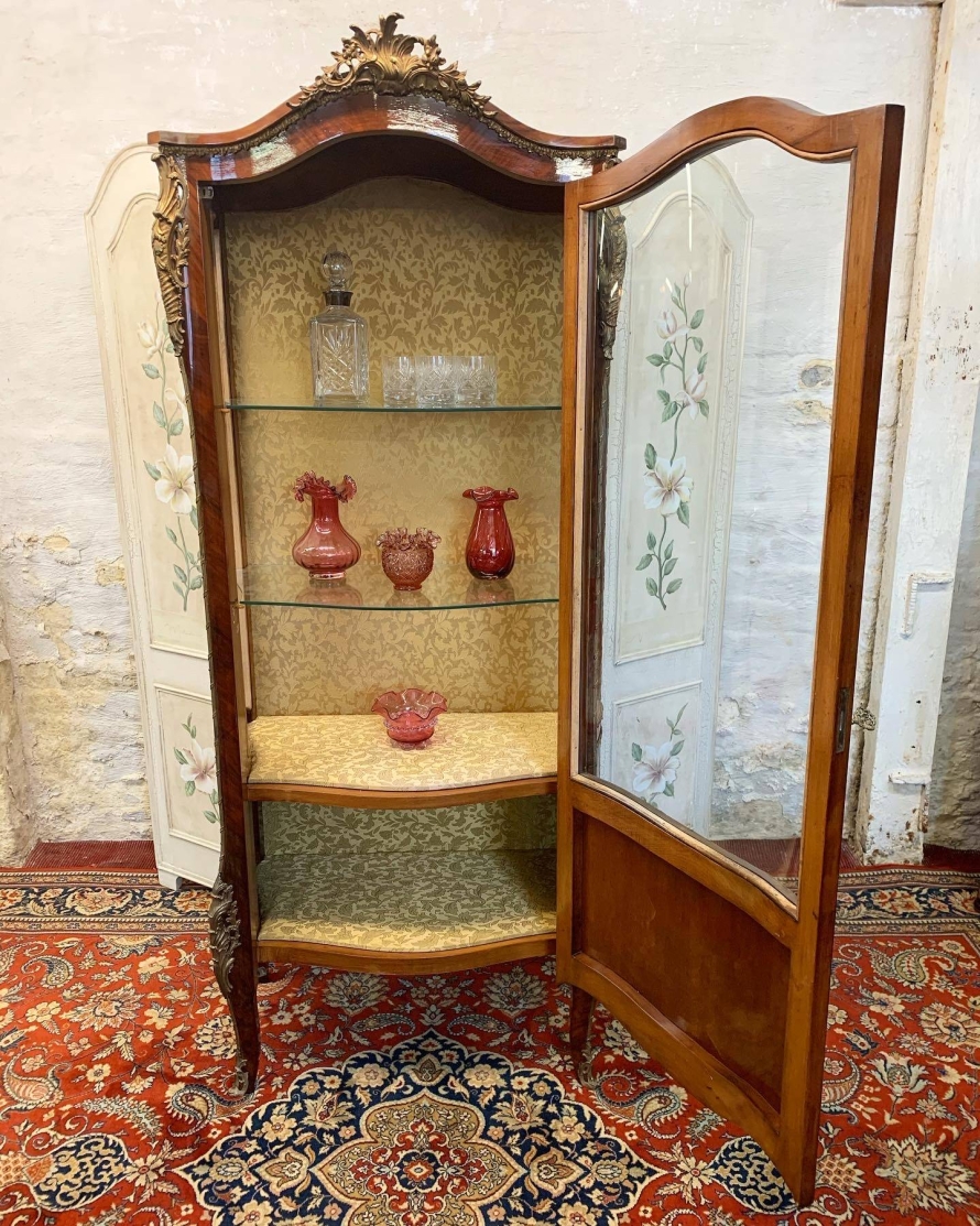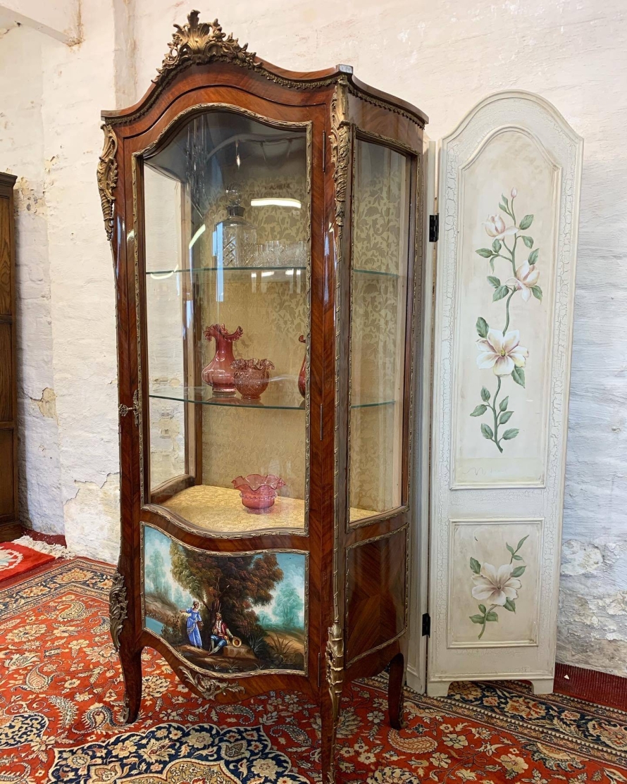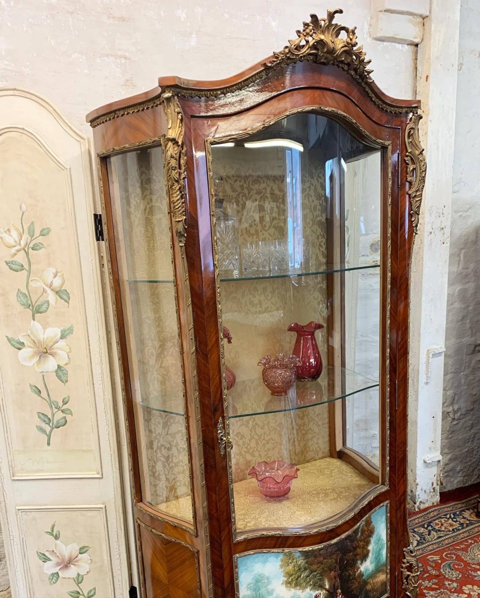 This French kingwood shaped glazed cabinet is smothered in ormolu decoration throughout and is in excellent condition. The lockable shaped glazed door has a beautiful painted panel below. The romantic scene having ormolu borders. The door opens to reveal two removable glass shelves. Shaped sides , this stunning cabinet stands on four cabriole shaped legs with ormulu decoration.A beautiful French cabinet which would grace any home.