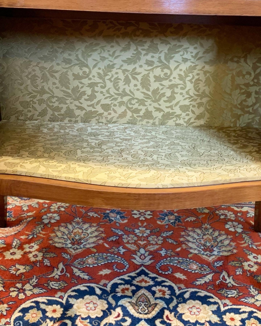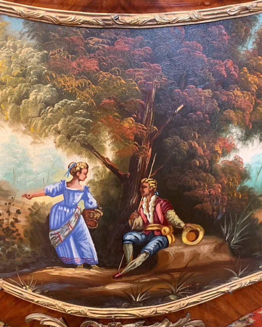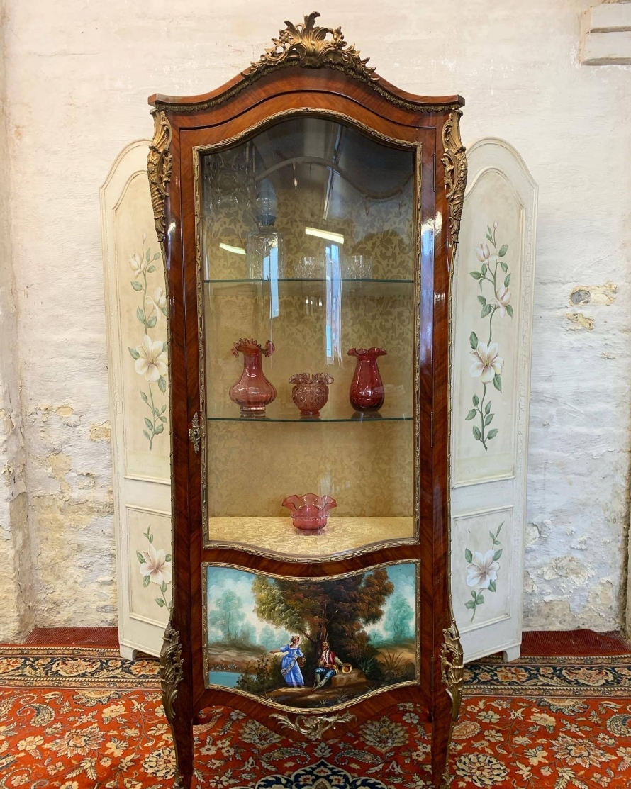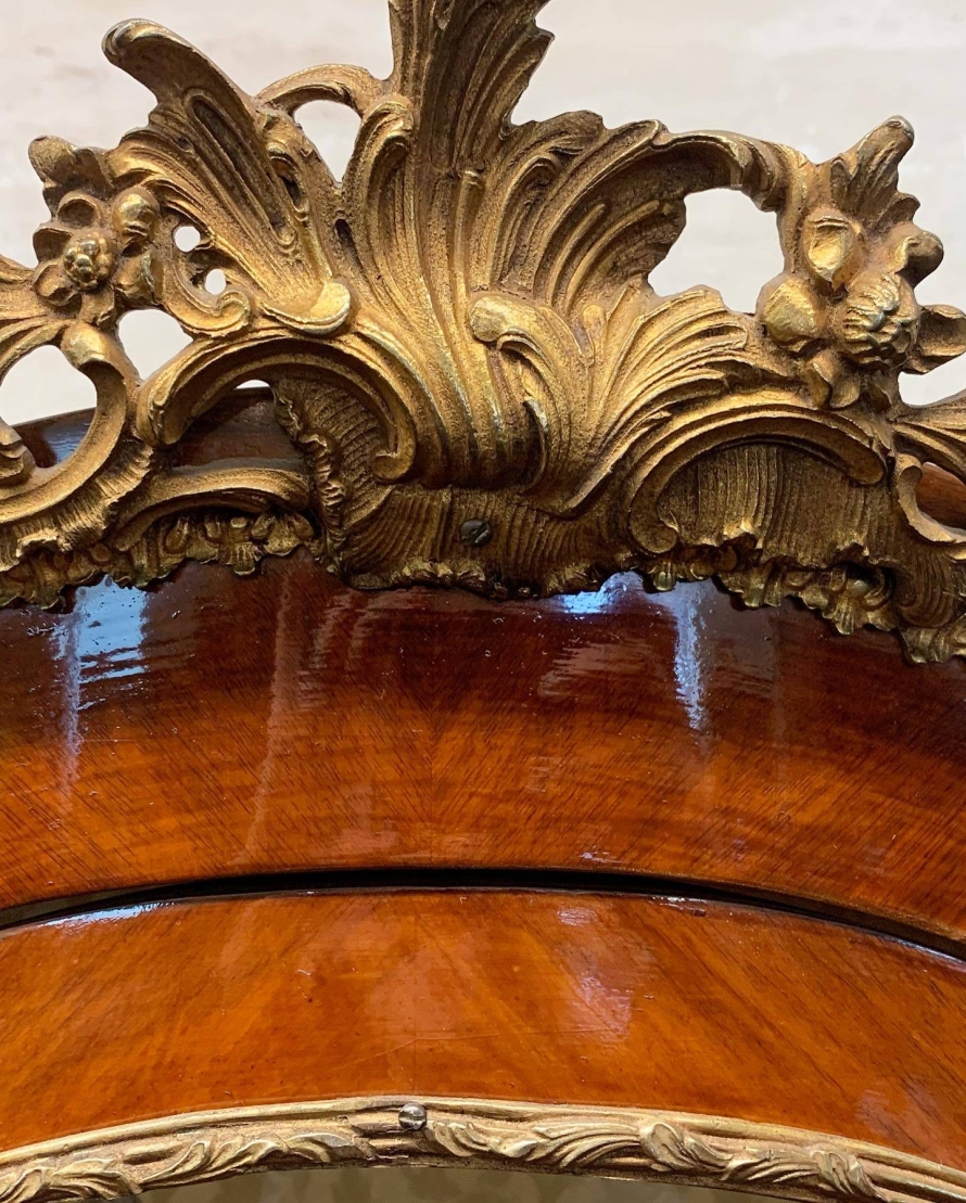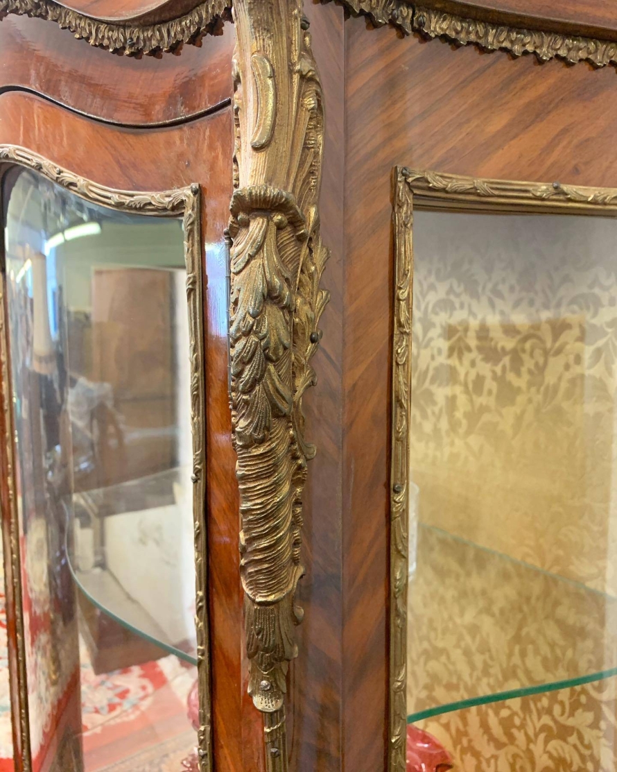 This French kingwood shaped glazed cabinet is smothered in ormolu decoration throughout and is in excellent condition. The lockable shaped glazed door has a beautiful painted panel below. The romantic scene having ormolu borders. The door opens to reveal two removable glass shelves. Shaped sides , this stunning cabinet stands on four cabriole shaped legs with ormulu decoration.A beautiful French cabinet which would grace any home.