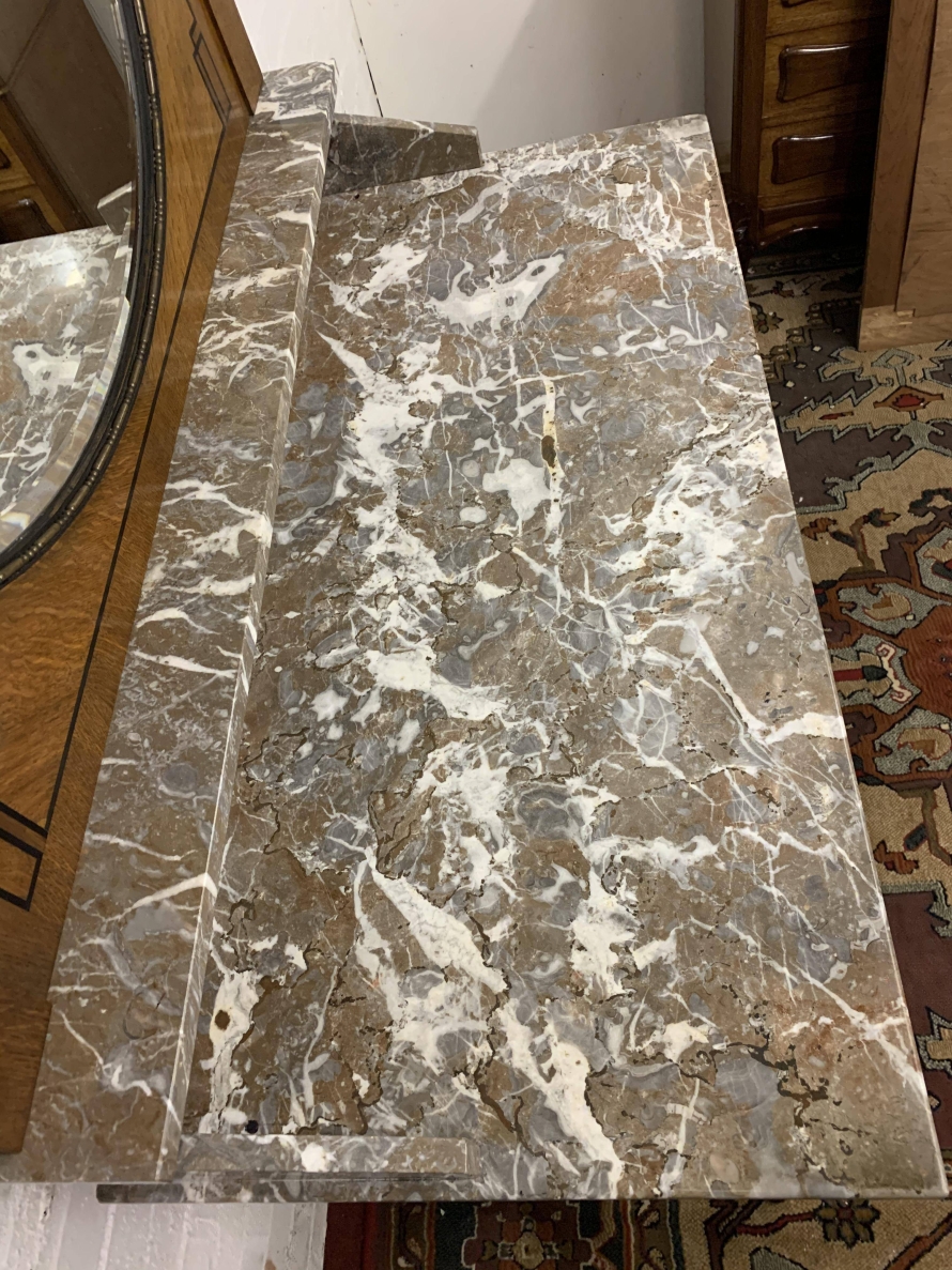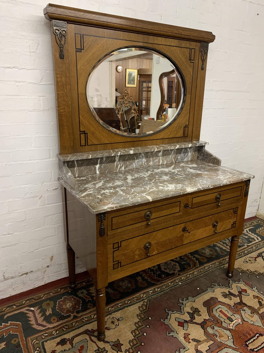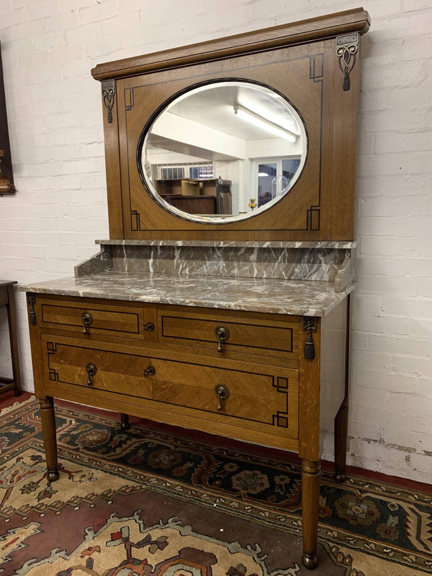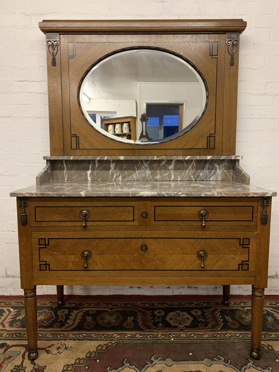 We are delighted to offer this stylish item of French Deco furniture. The removable back has a central oval mirror, brass decorative plaques and ebony stringing. The mirror sits on a marble shelf. The marble top sits above two drawers above a long drawer. The drawers are lockable and have ebony string decoration. This beautiful item stands on four turned legs with four turned brass feet.