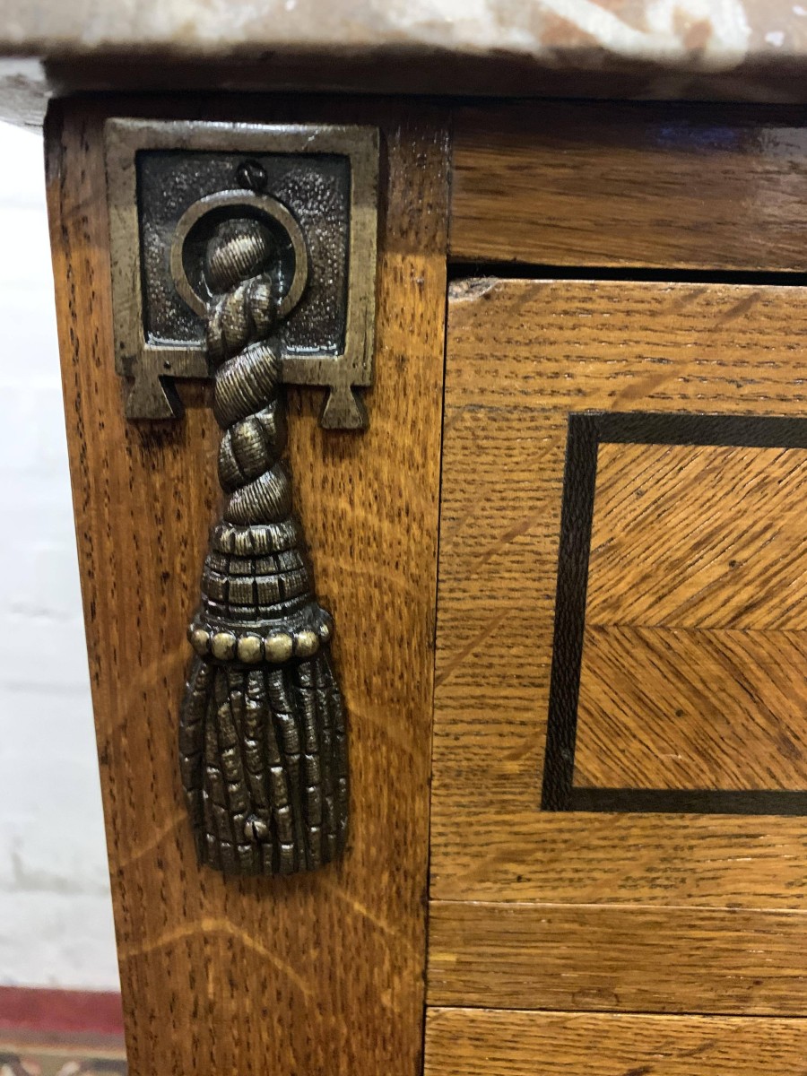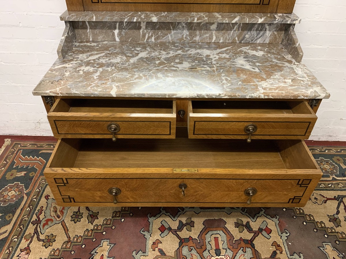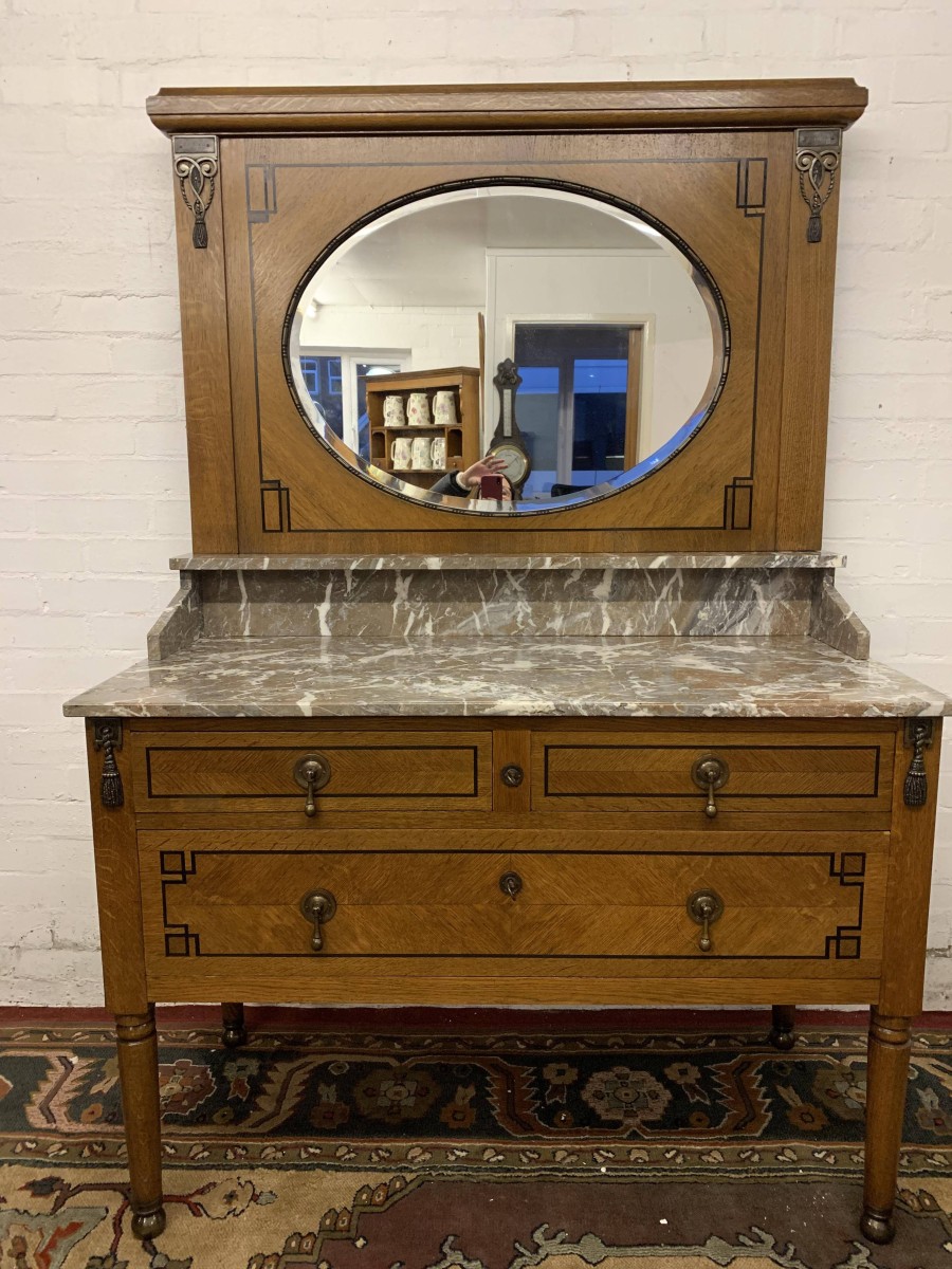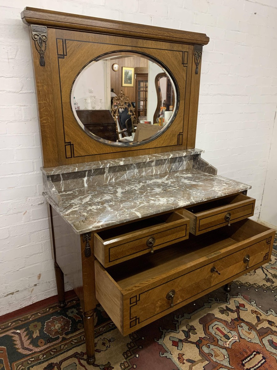 We are delighted to offer this stylish item of French Deco furniture. The removable back has a central oval mirror, brass decorative plaques and ebony stringing. The mirror sits on a marble shelf. The marble top sits above two drawers above a long drawer. The drawers are lockable and have ebony string decoration. This beautiful item stands on four turned legs with four turned brass feet.