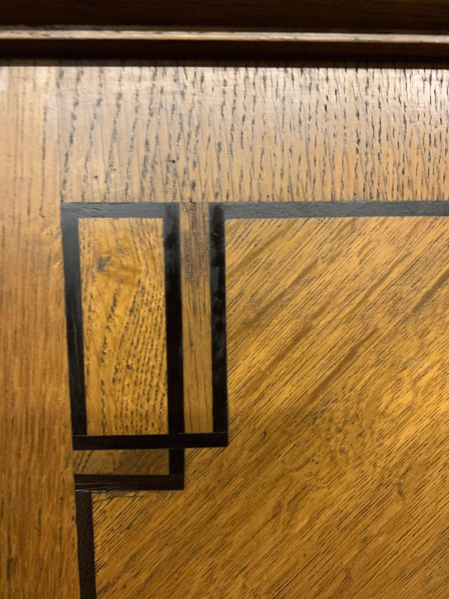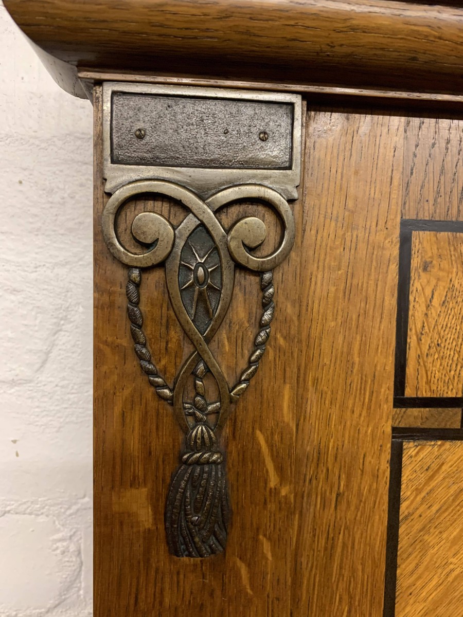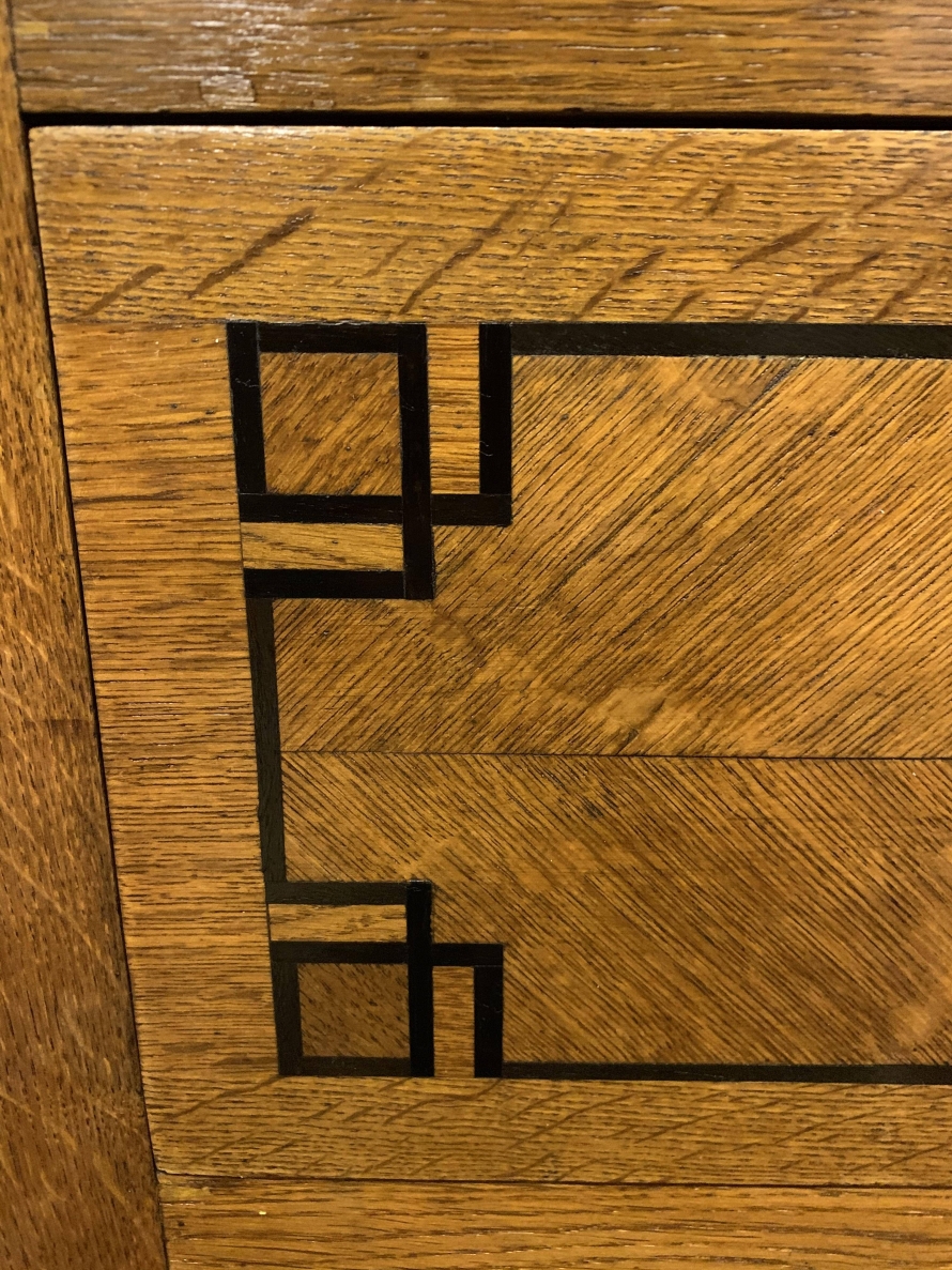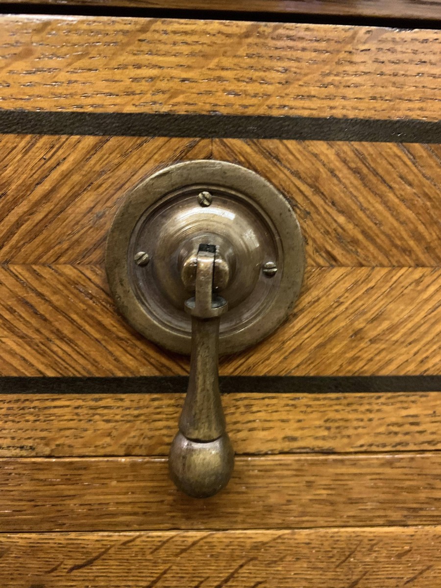 We are delighted to offer this stylish item of French Deco furniture. The removable back has a central oval mirror, brass decorative plaques and ebony stringing. The mirror sits on a marble shelf. The marble top sits above two drawers above a long drawer. The drawers are lockable and have ebony string decoration. This beautiful item stands on four turned legs with four turned brass feet.
