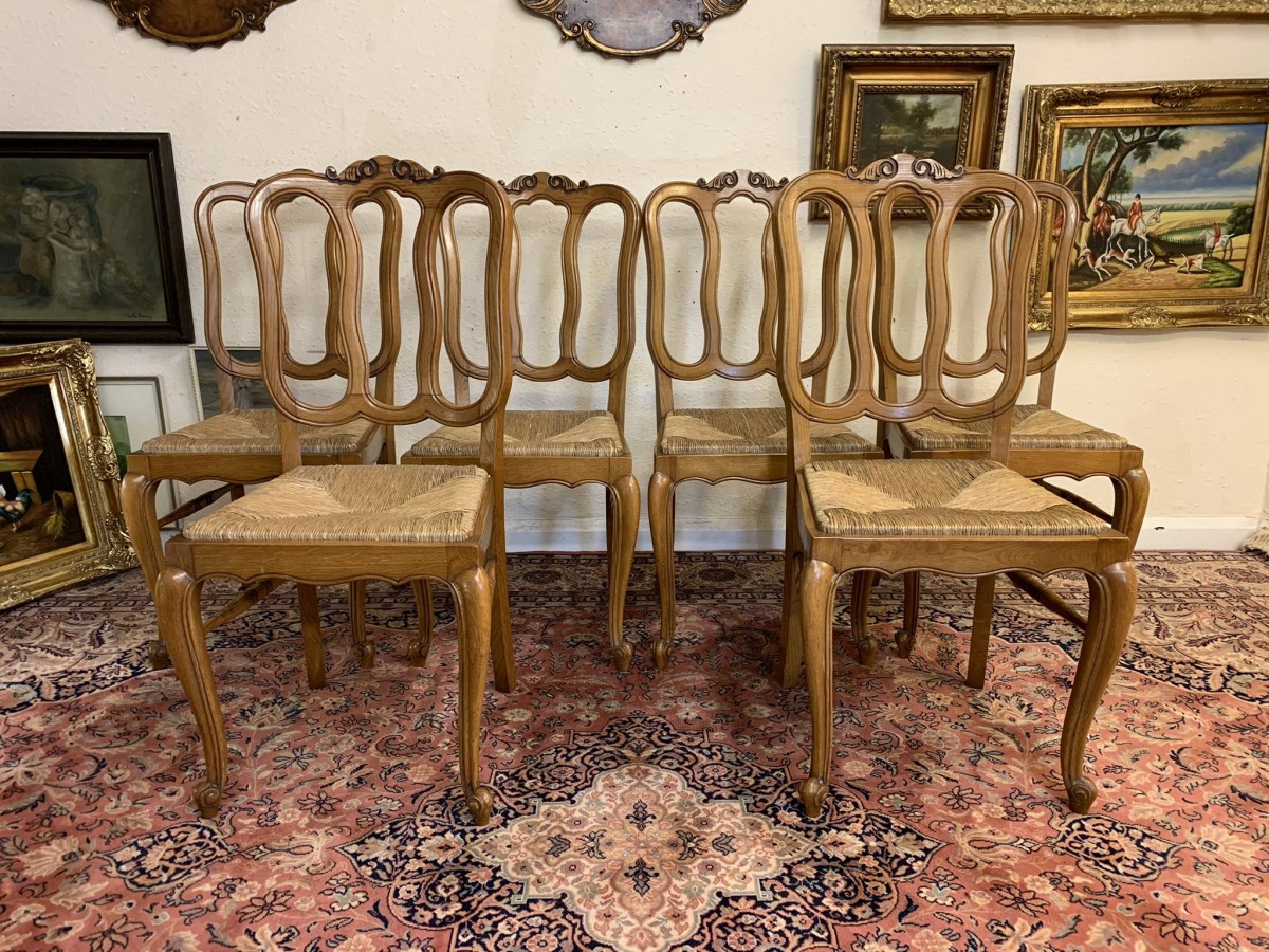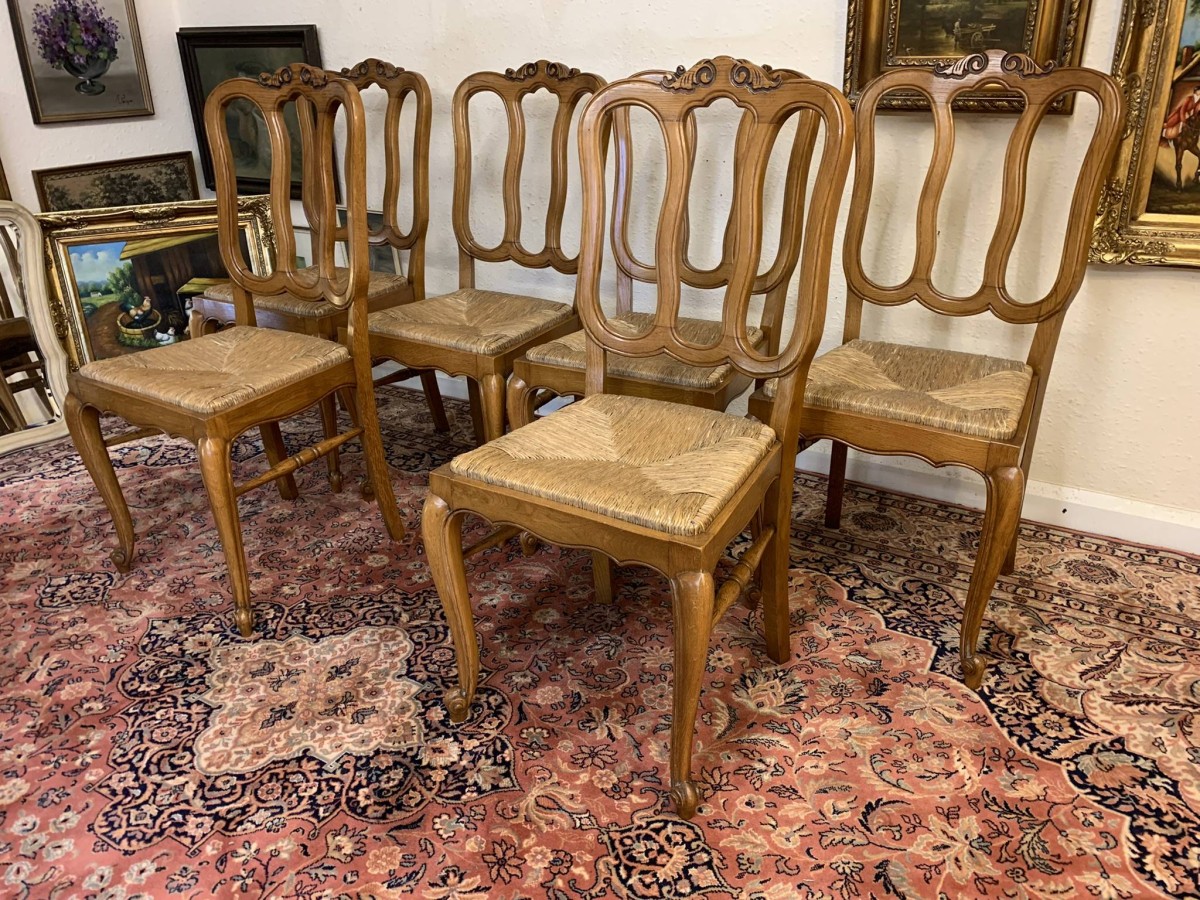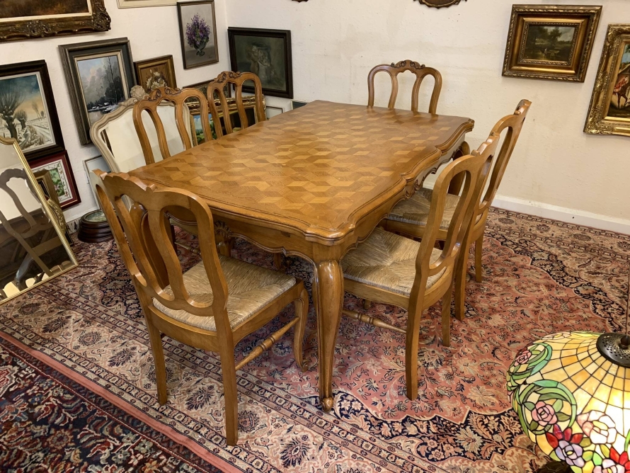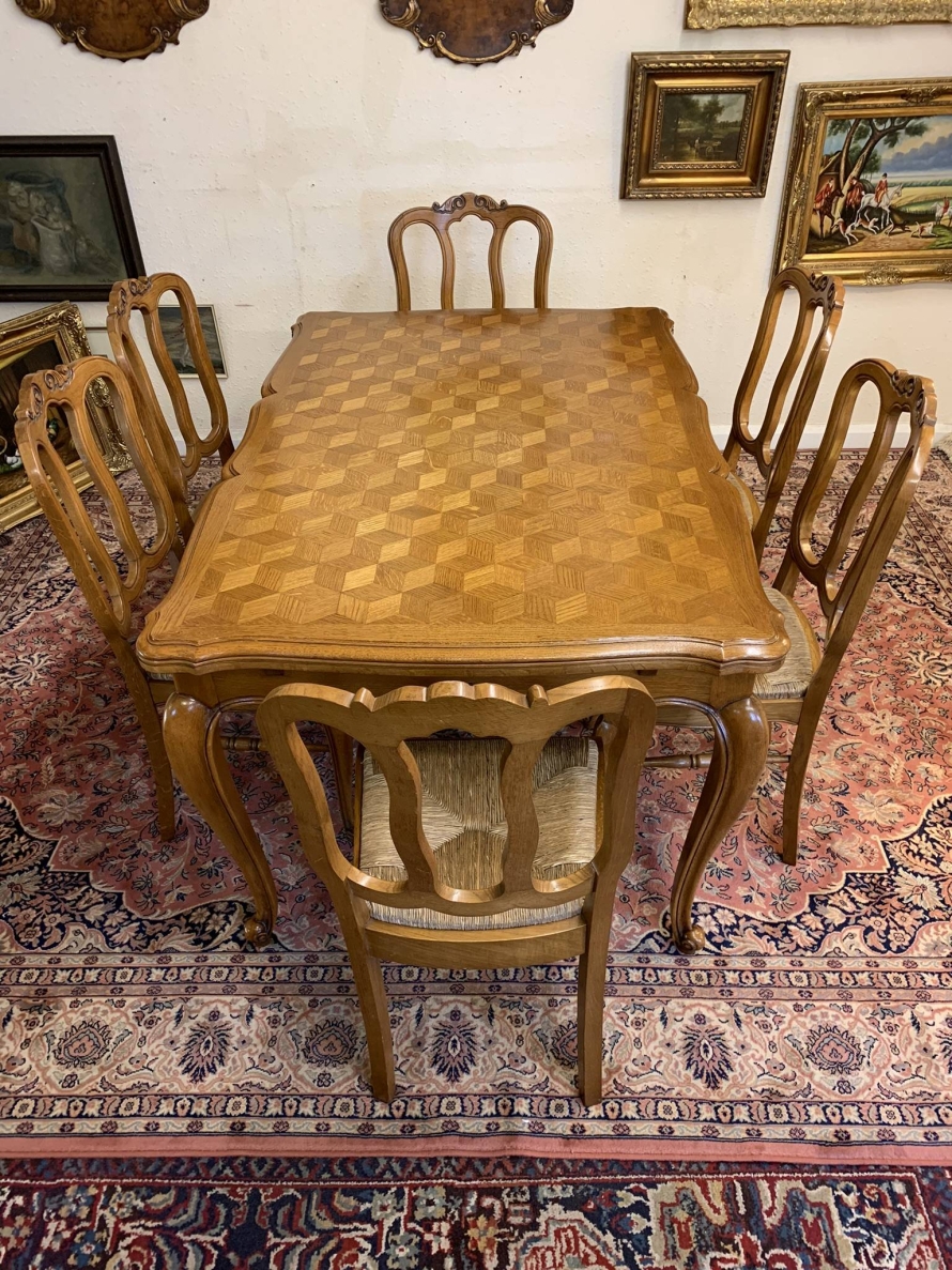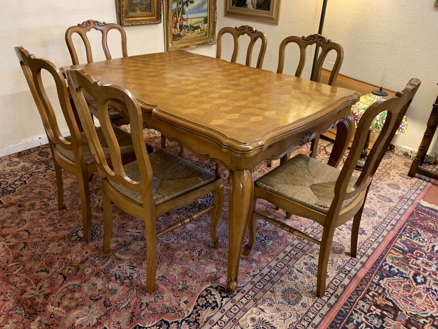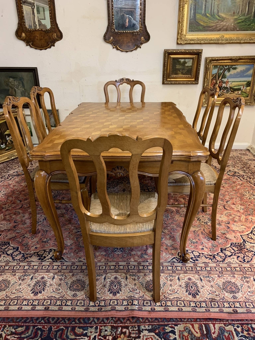 This stunning French set is in excellent condition. The table has a shaped top with a parquetry inlay. The table has two concealed leaves which can easily slide out to produce a larger table. Shaped carved skirt, this fabulous table sits on four carved cabriole shaped legs. The six chairs are all sturdy and have a shaped back, rush removable seat pad with two carved cabriole legs to the front and a turned stretcher support.