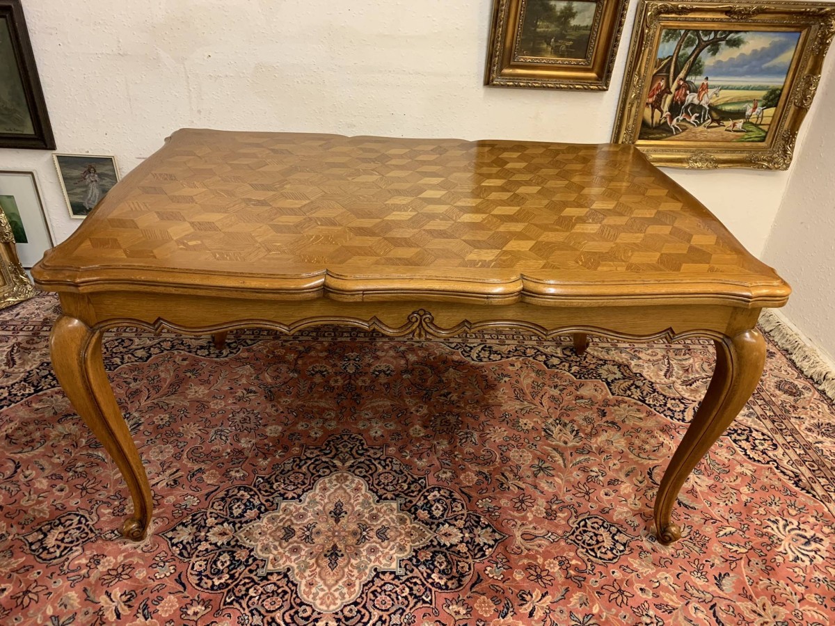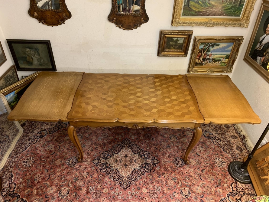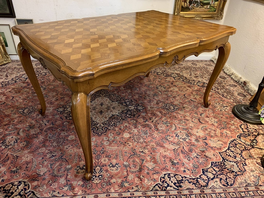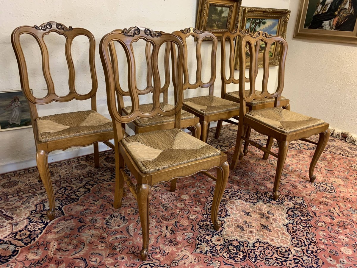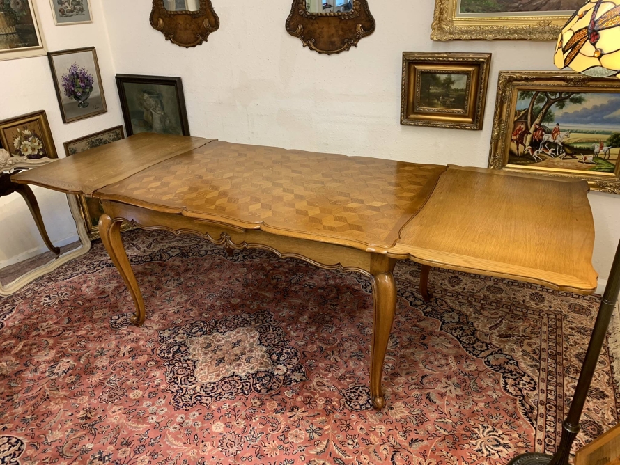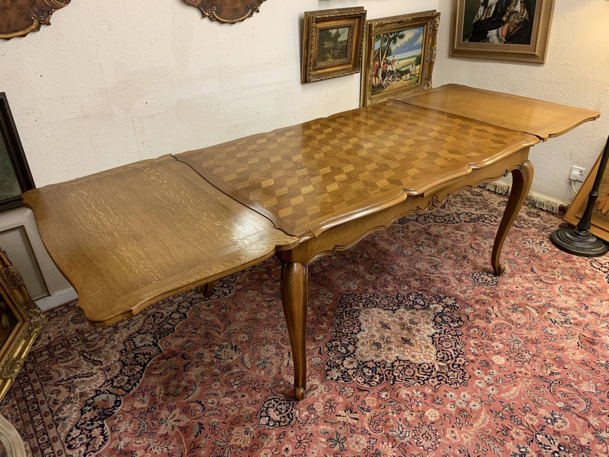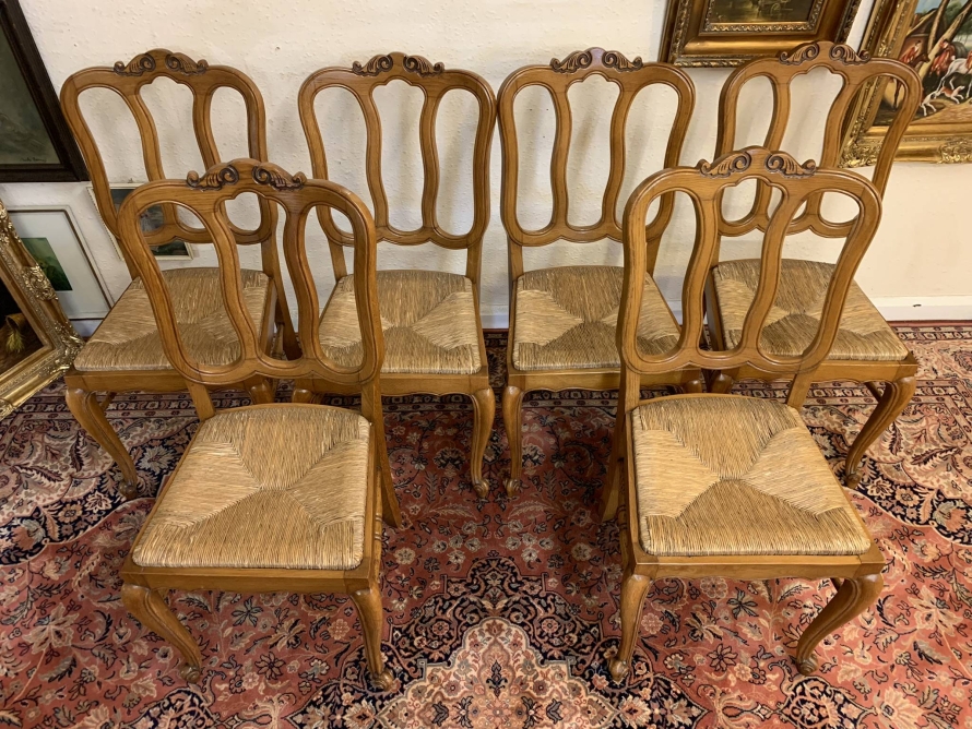 This stunning French set is in excellent condition. The table has a shaped top with a parquetry inlay. The table has two concealed leaves which can easily slide out to produce a larger table. Shaped carved skirt, this fabulous table sits on four carved cabriole shaped legs. The six chairs are all sturdy and have a shaped back, rush removable seat pad with two carved cabriole legs to the front and a turned stretcher support.