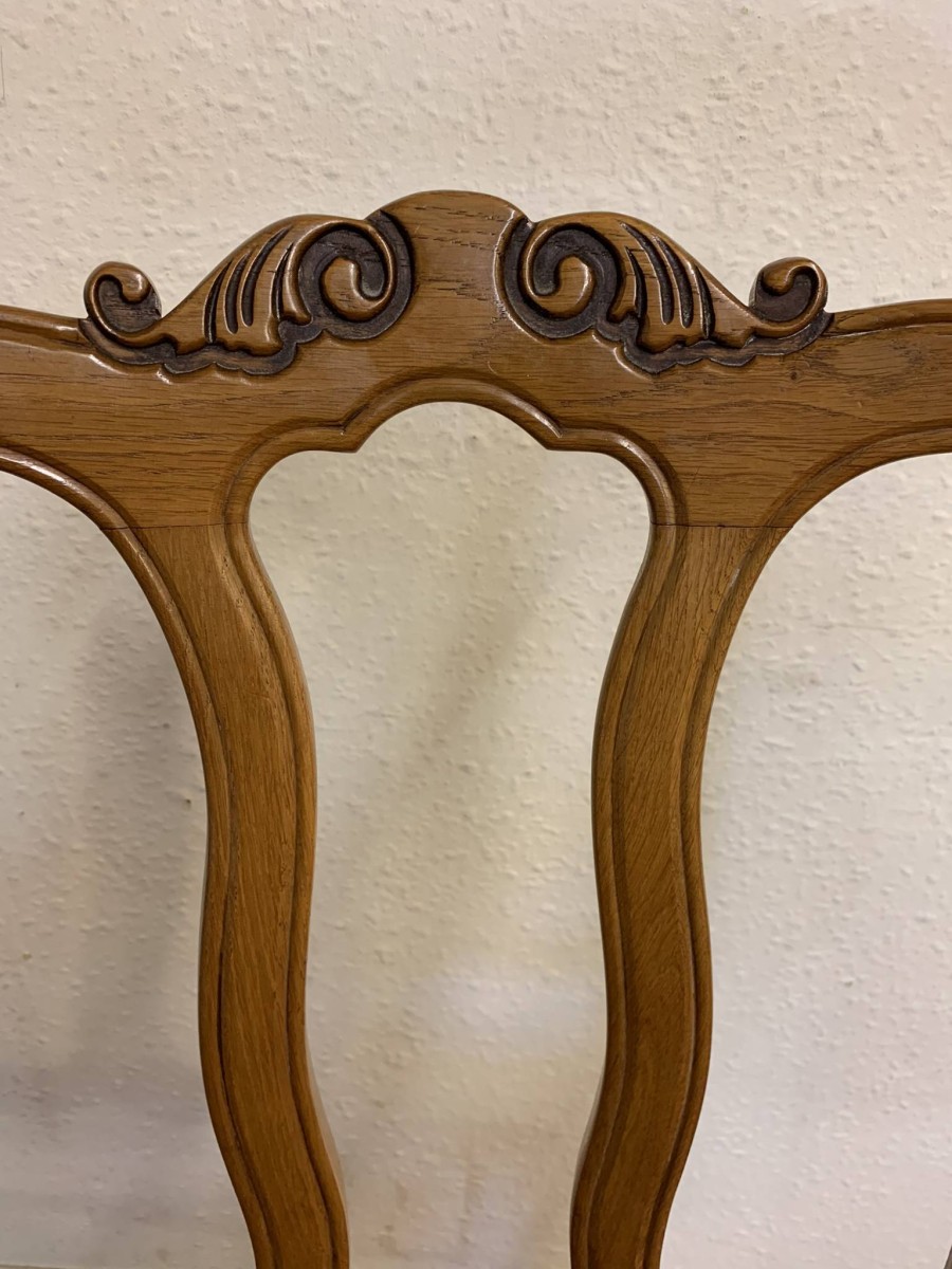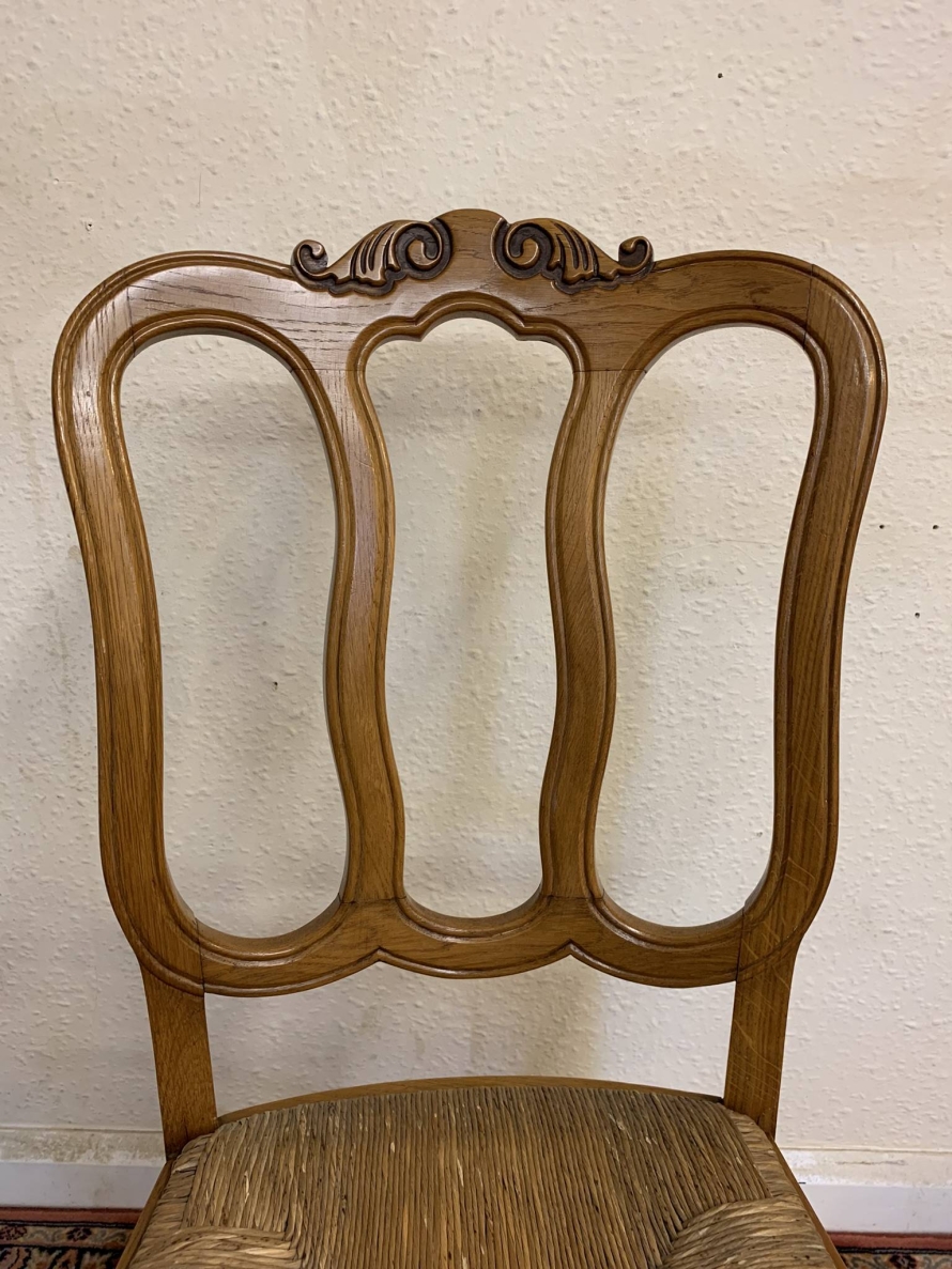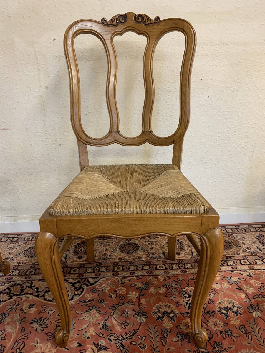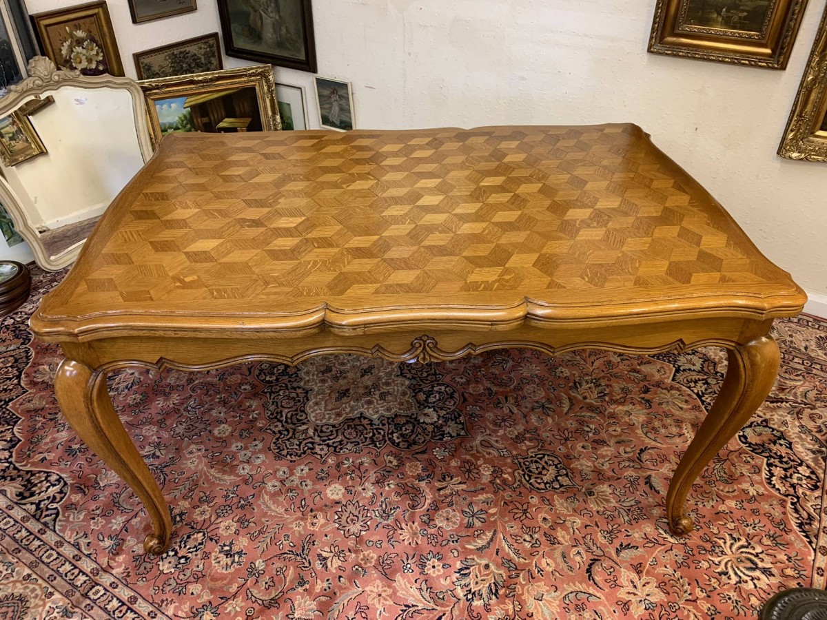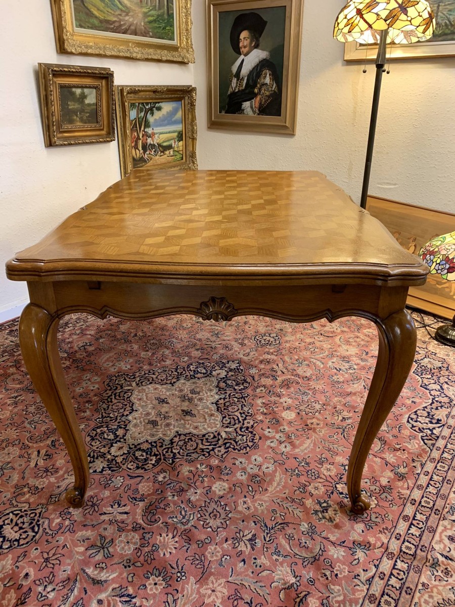 This stunning French set is in excellent condition. The table has a shaped top with a parquetry inlay. The table has two concealed leaves which can easily slide out to produce a larger table. Shaped carved skirt, this fabulous table sits on four carved cabriole shaped legs. The six chairs are all sturdy and have a shaped back, rush removable seat pad with two carved cabriole legs to the front and a turned stretcher support.