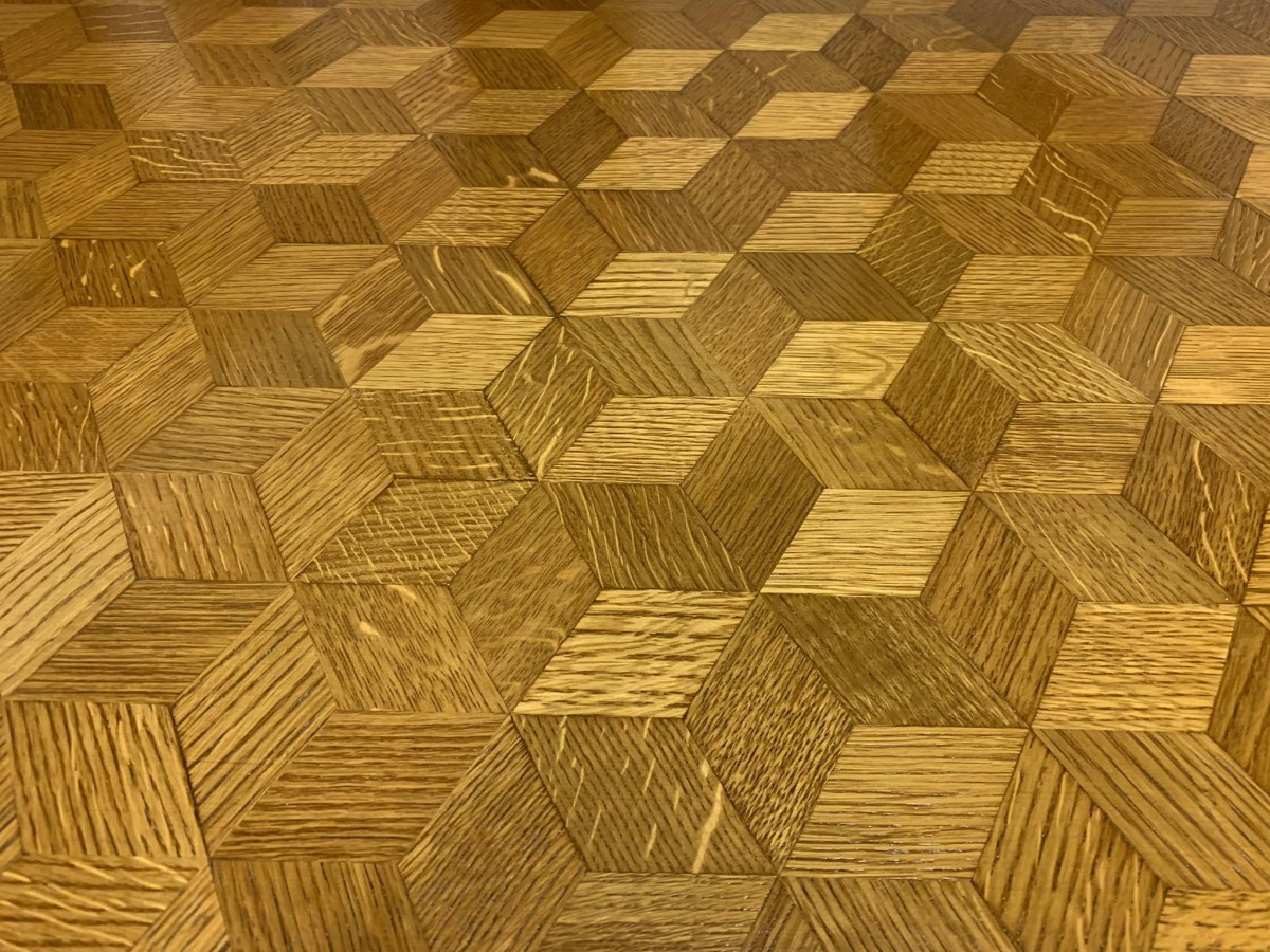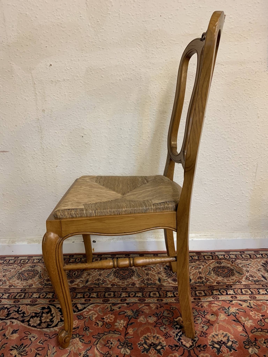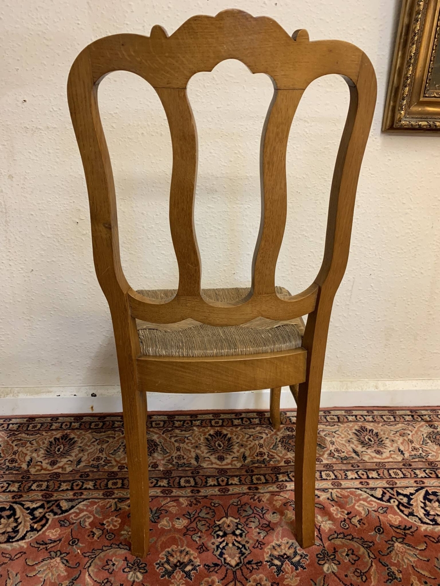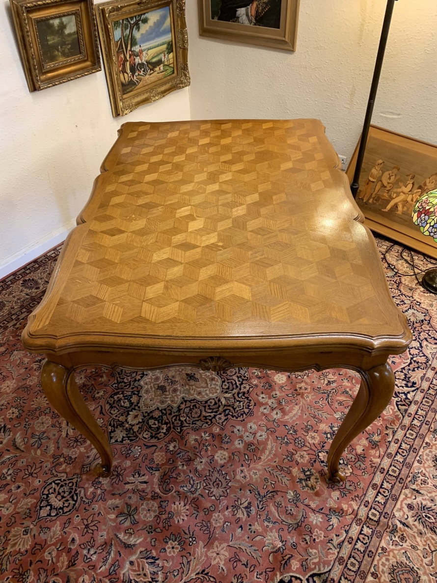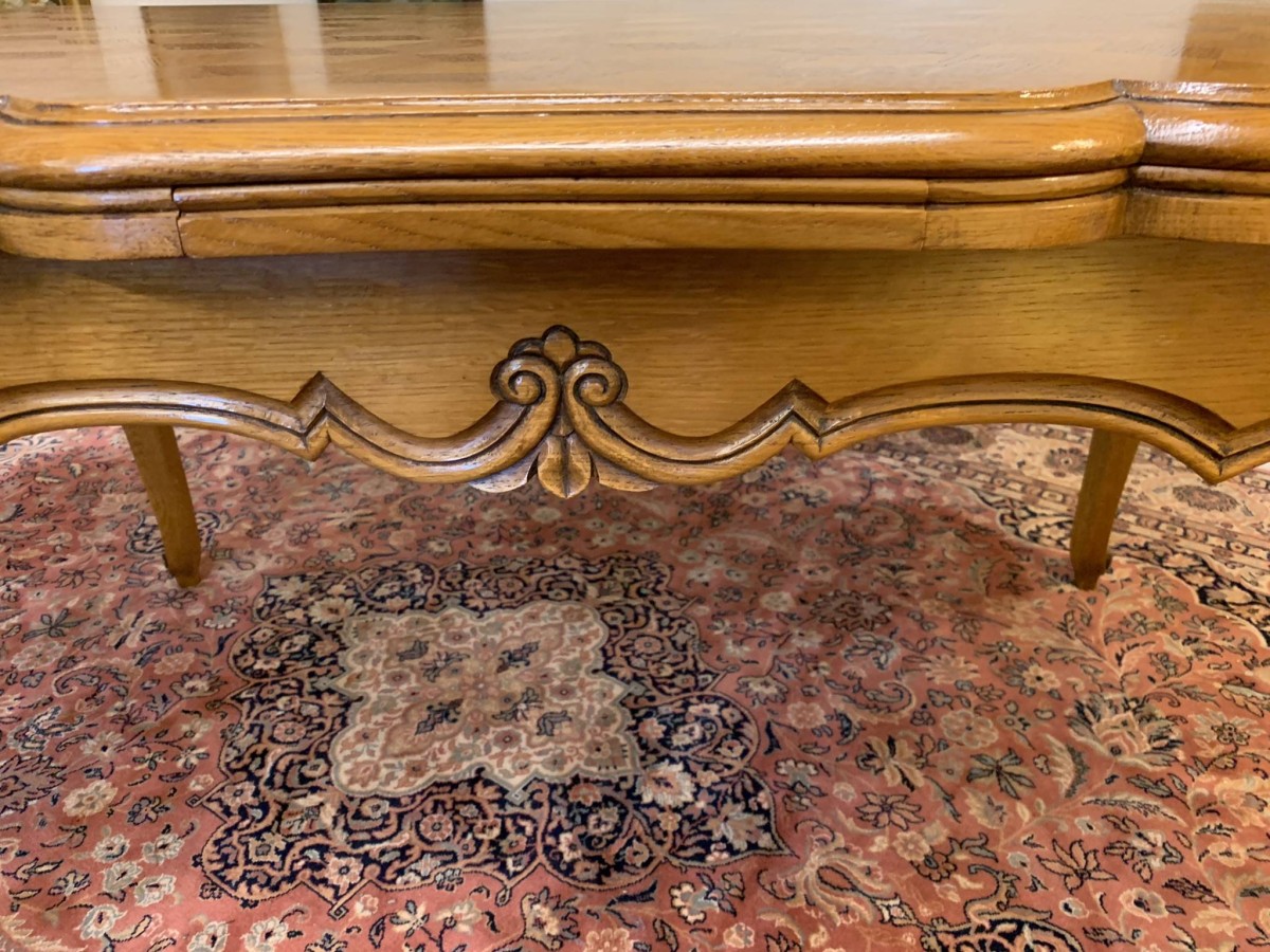 This stunning French set is in excellent condition. The table has a shaped top with a parquetry inlay. The table has two concealed leaves which can easily slide out to produce a larger table. Shaped carved skirt, this fabulous table sits on four carved cabriole shaped legs. The six chairs are all sturdy and have a shaped back, rush removable seat pad with two carved cabriole legs to the front and a turned stretcher support.