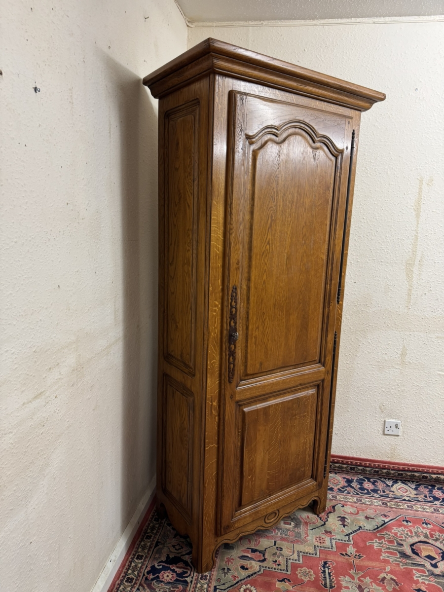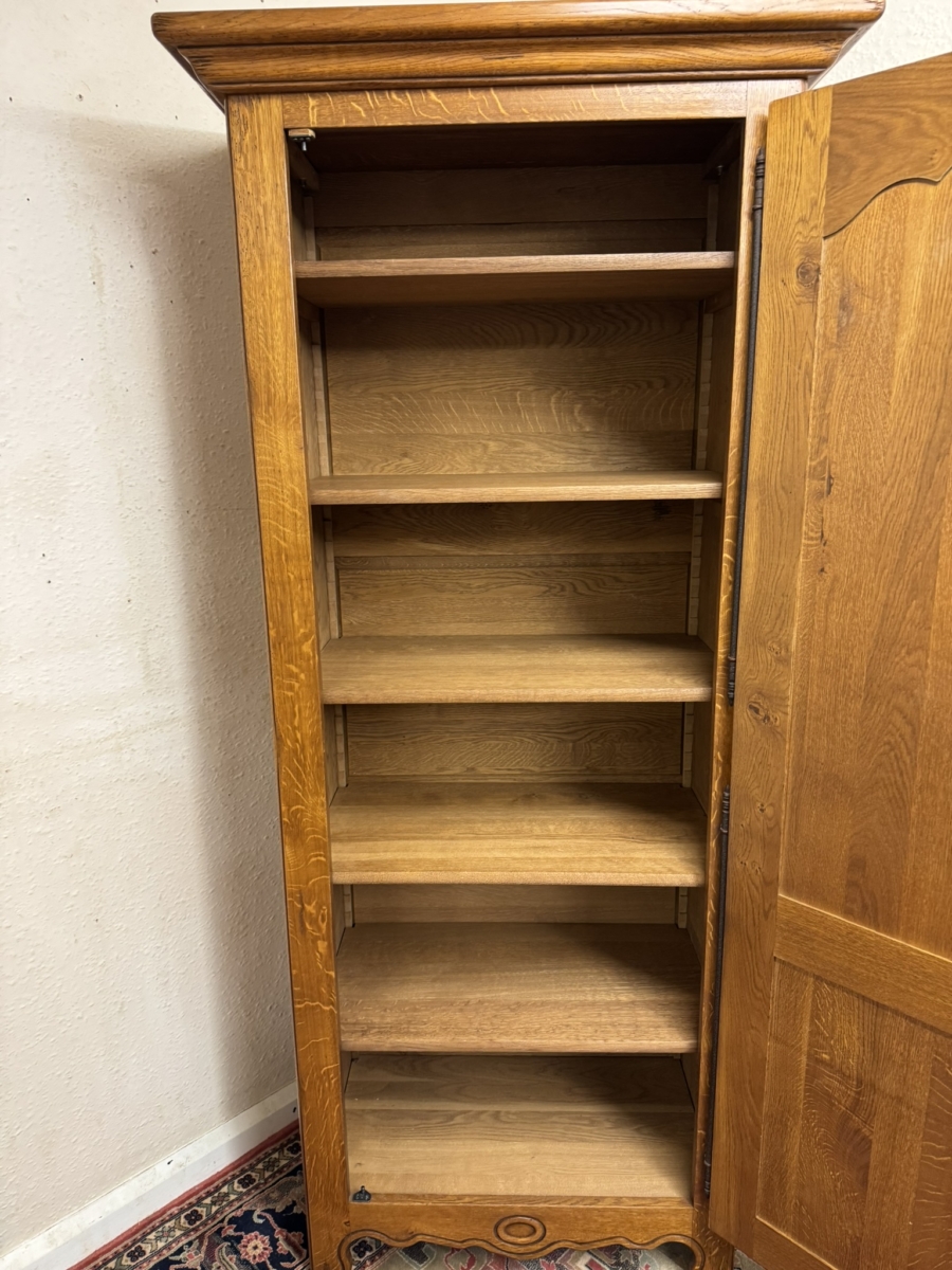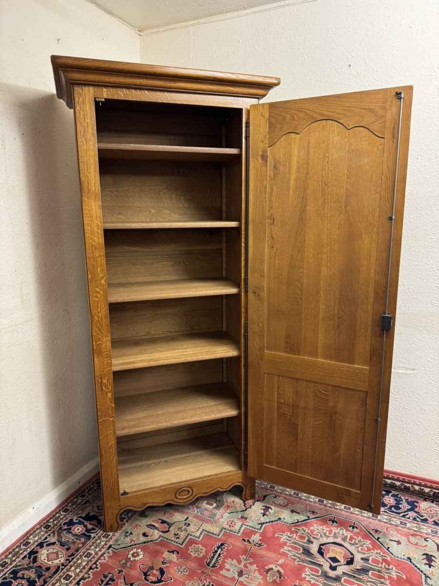 Made in solid oak and in excellent condition. This slim cupboard has an over sailing top which sits above a lockable shaped fielded panelled door, the door having metal hinges, escutcheon and key. The door opens to reveal five adjustable and removable shelves. Fielded panelled sides, shaped skirt with central oval carving and standing on shaped bracket feet.