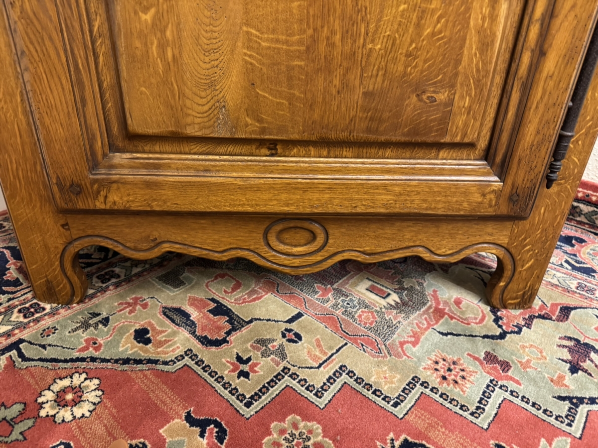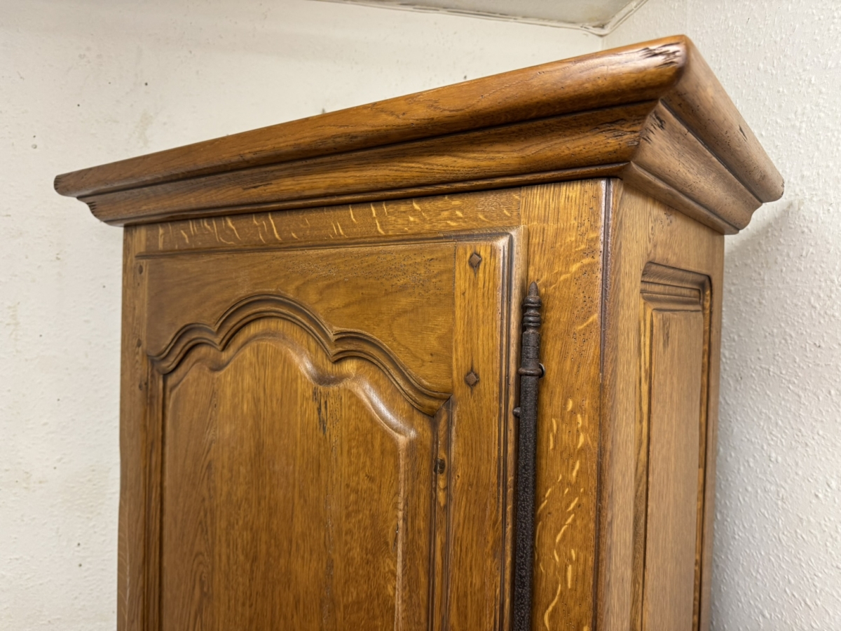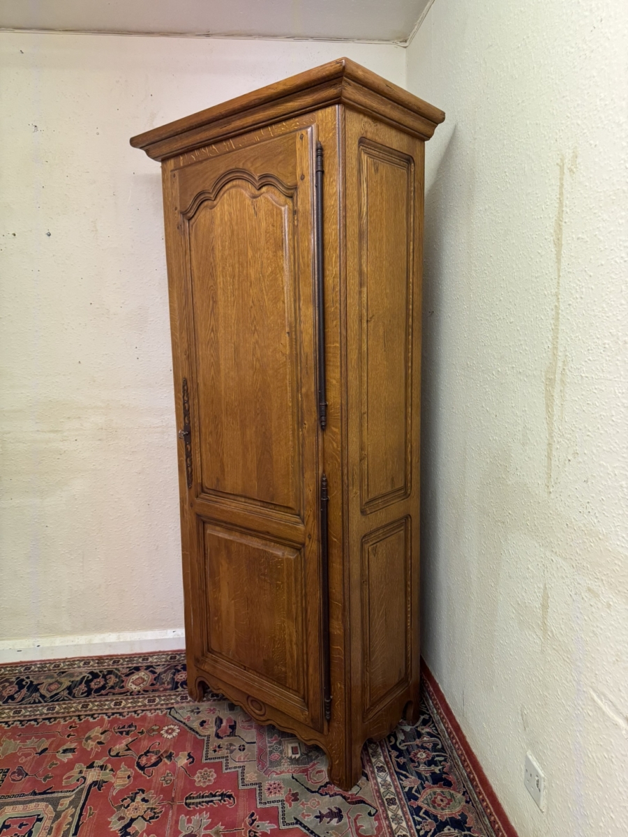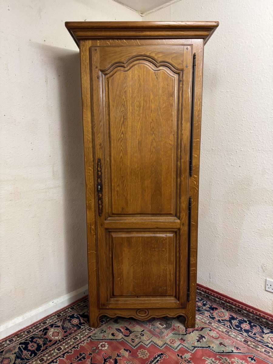 Made in solid oak and in excellent condition. This slim cupboard has an over sailing top which sits above a lockable shaped fielded panelled door, the door having metal hinges, escutcheon and key. The door opens to reveal five adjustable and removable shelves. Fielded panelled sides, shaped skirt with central oval carving and standing on shaped bracket feet.