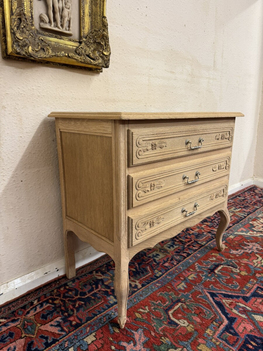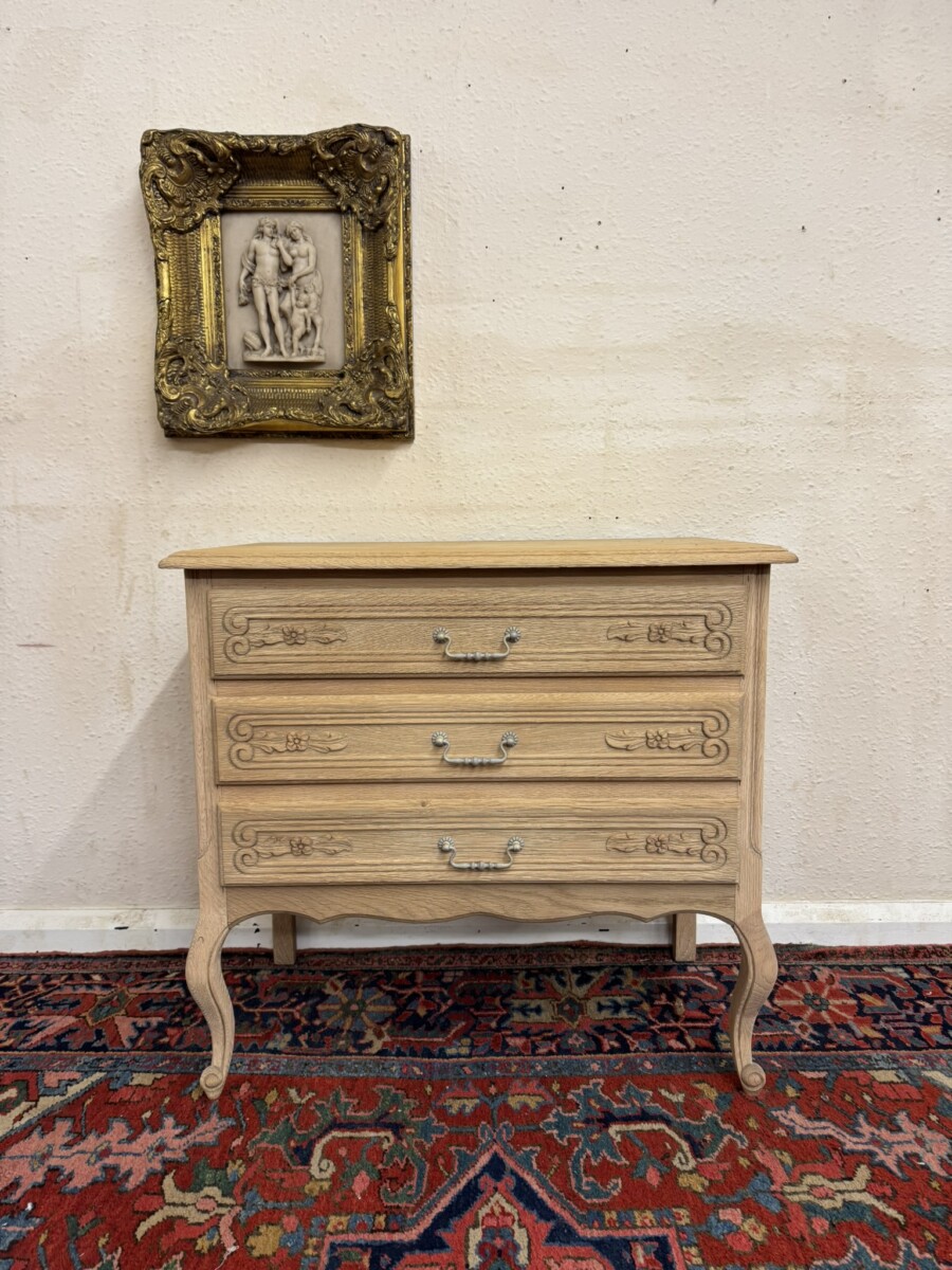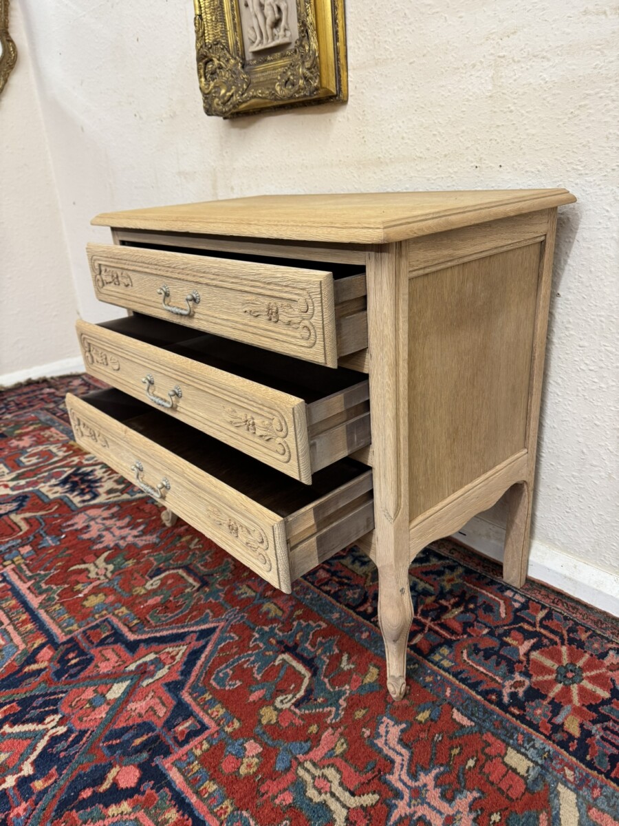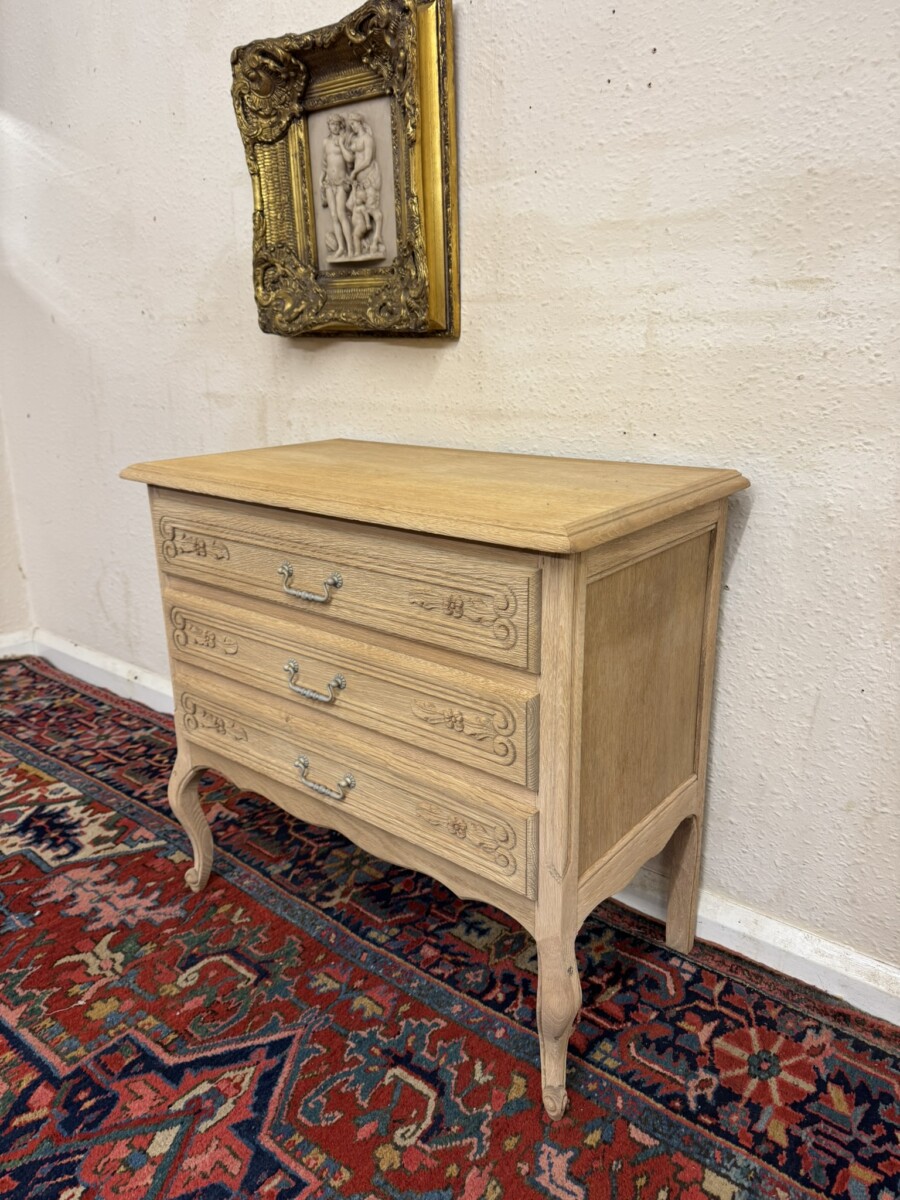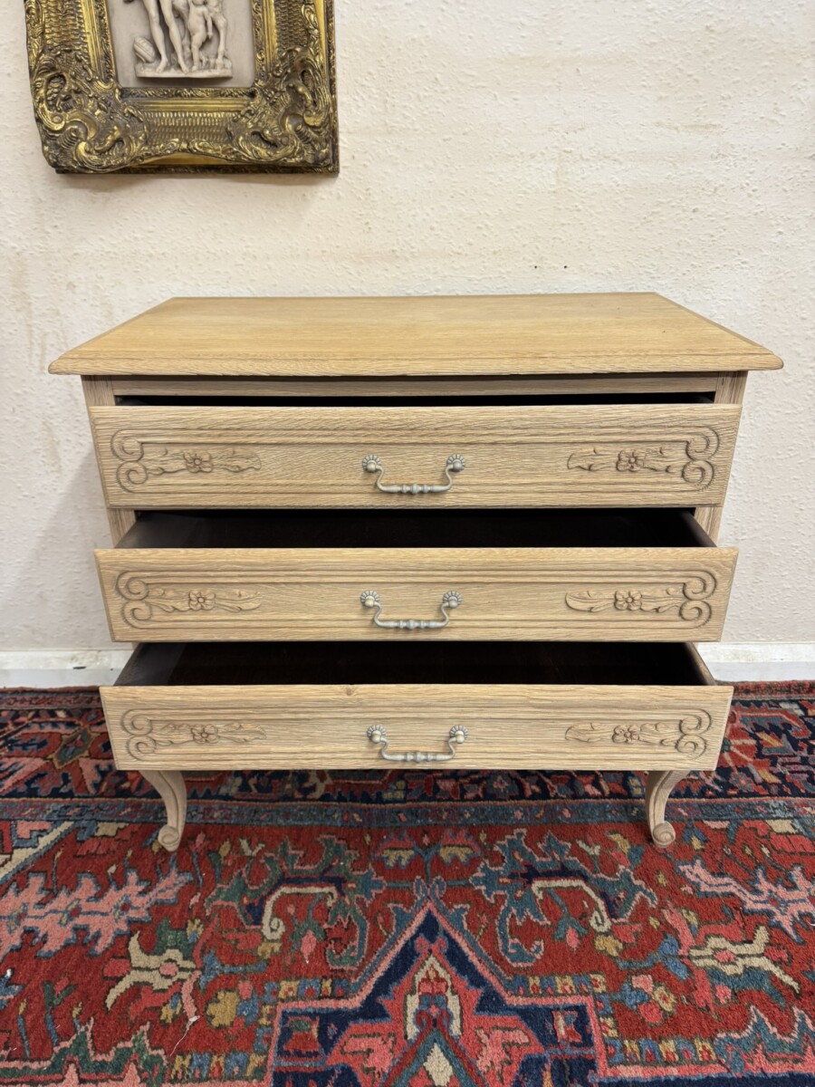 This lovely French chest of drawers is in excellent condition. Made in fabulous raw oak and having an oversailing top which sits above three carved drawers, each drawer with a brass handle. Recessed panelled side and standing on two cabriole shaped legs to the front.