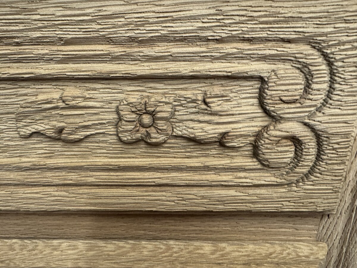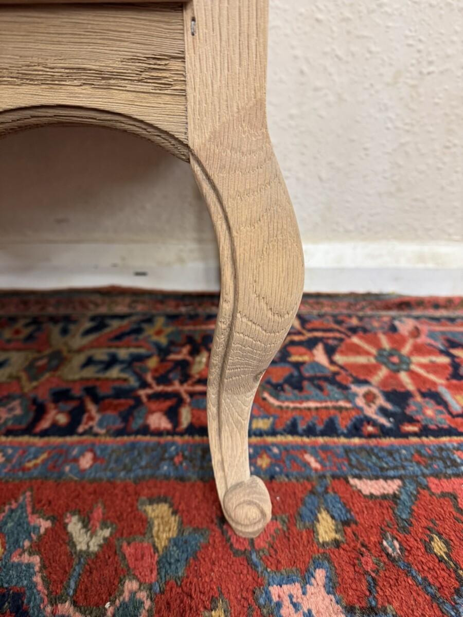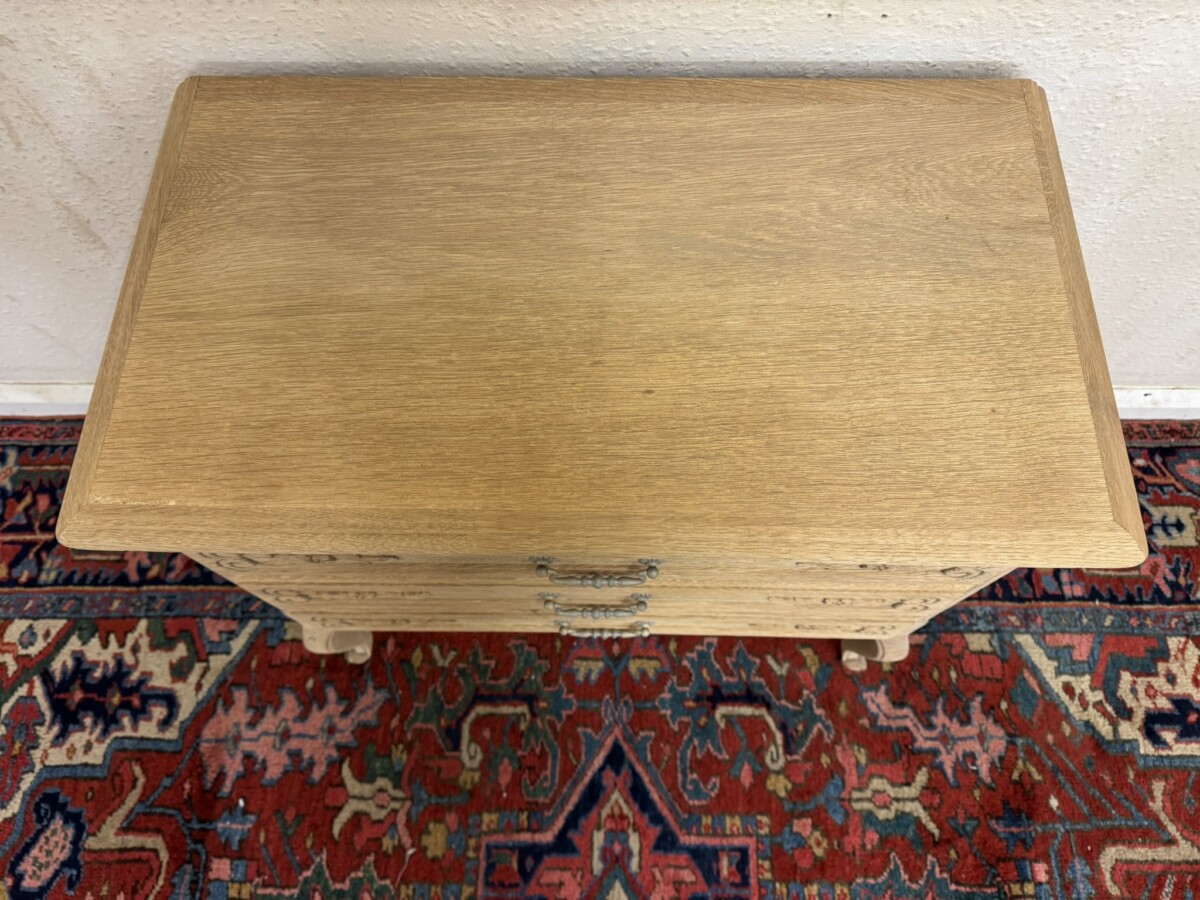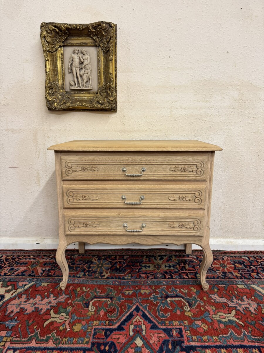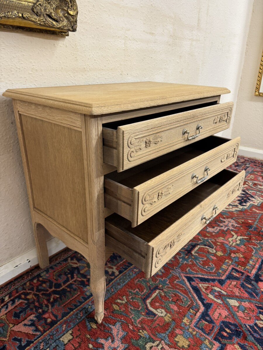 This lovely French chest of drawers is in excellent condition. Made in fabulous raw oak and having an oversailing top which sits above three carved drawers, each drawer with a brass handle. Recessed panelled side and standing on two cabriole shaped legs to the front.