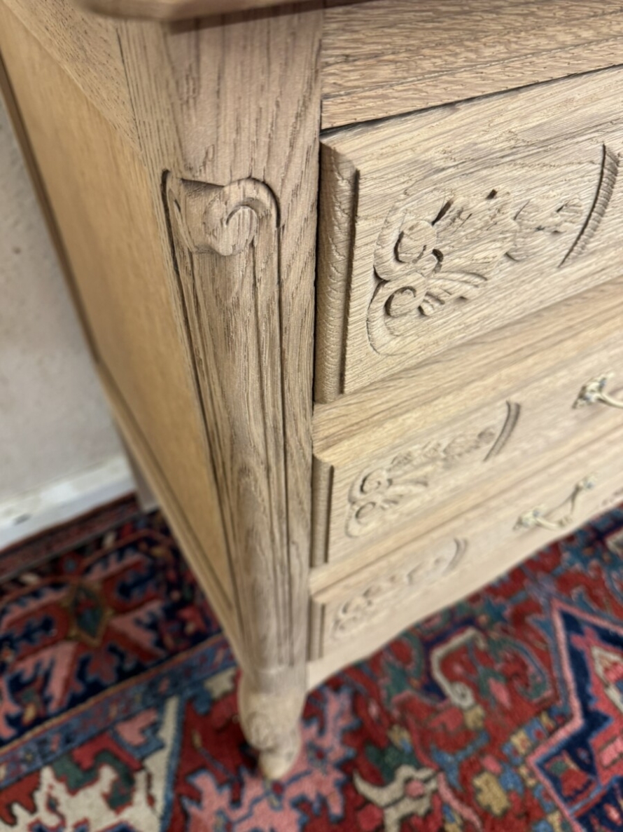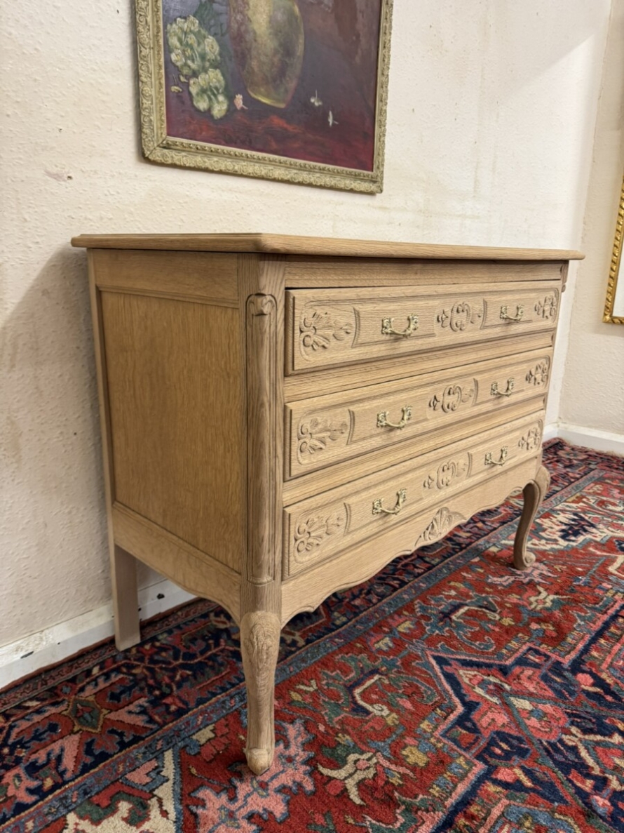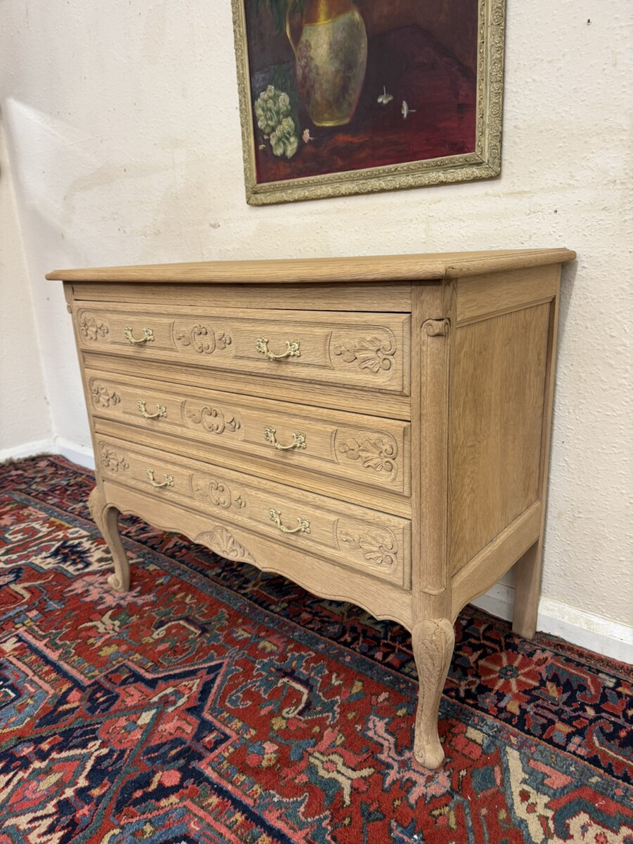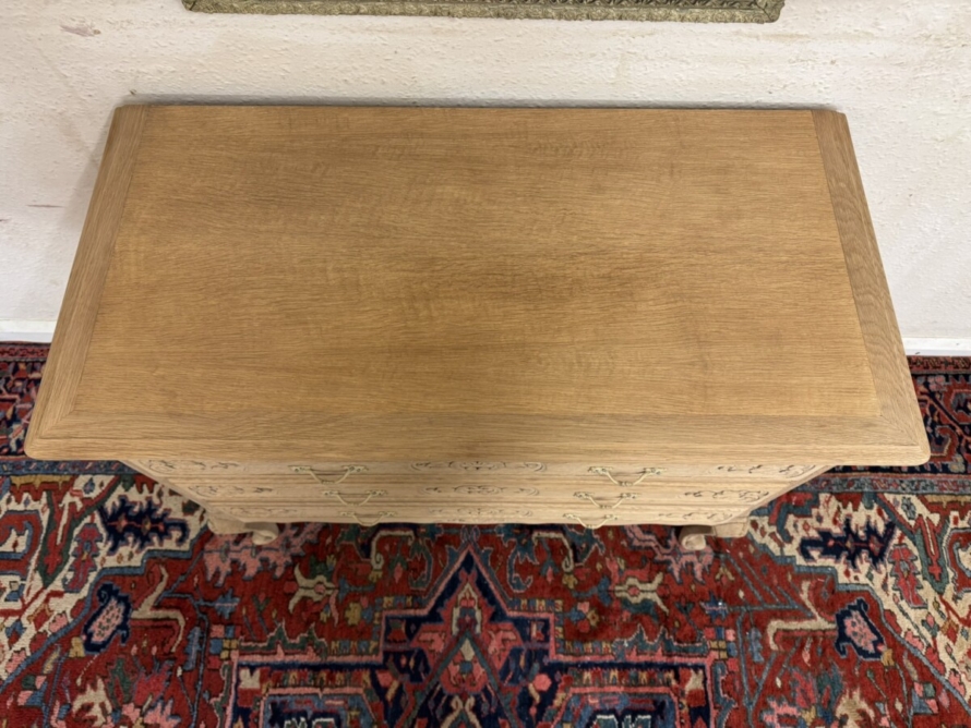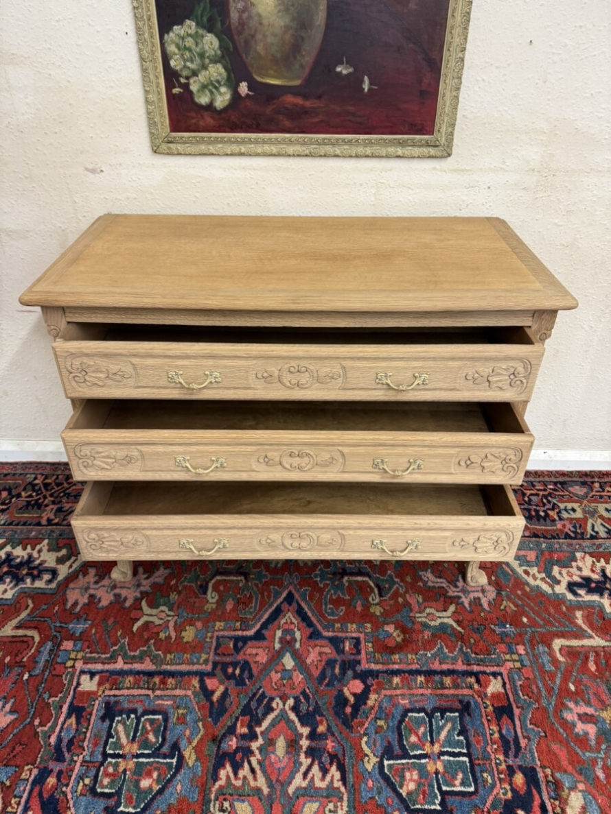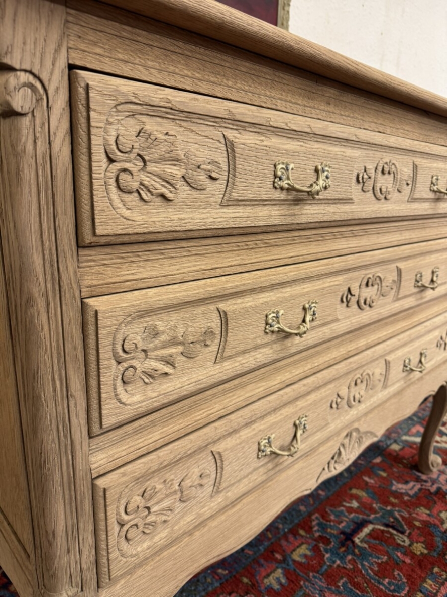 This French raw oak chest is in excellent condition. The oversailing top sits above three carved drawers, each drawer having a pair of decorative brass handles. Recessed panelled sides shaped skirt with central carving and standing on two carved cabriole shaped legs to the front.