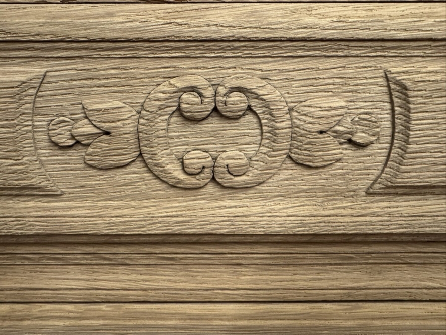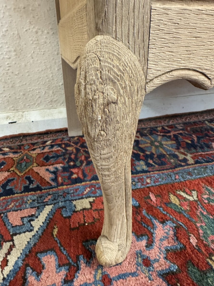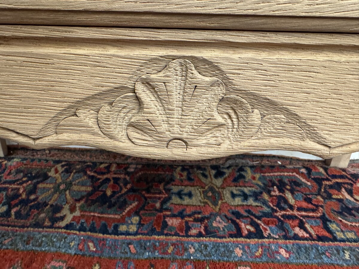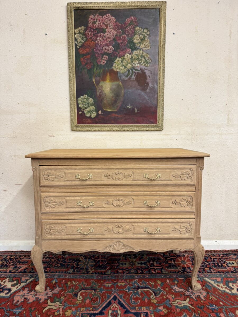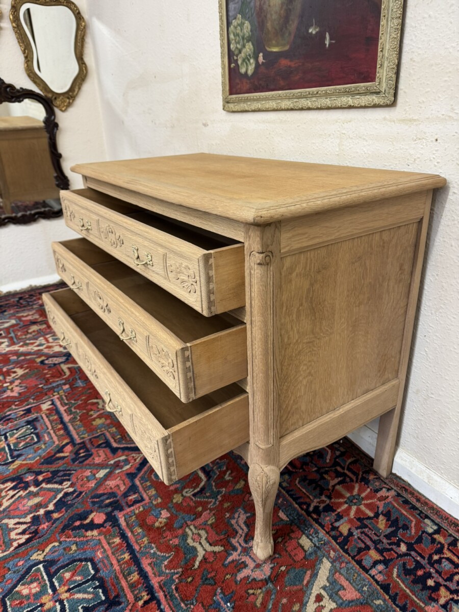 This French raw oak chest is in excellent condition. The oversailing top sits above three carved drawers, each drawer having a pair of decorative brass handles. Recessed panelled sides shaped skirt with central carving and standing on two carved cabriole shaped legs to the front.