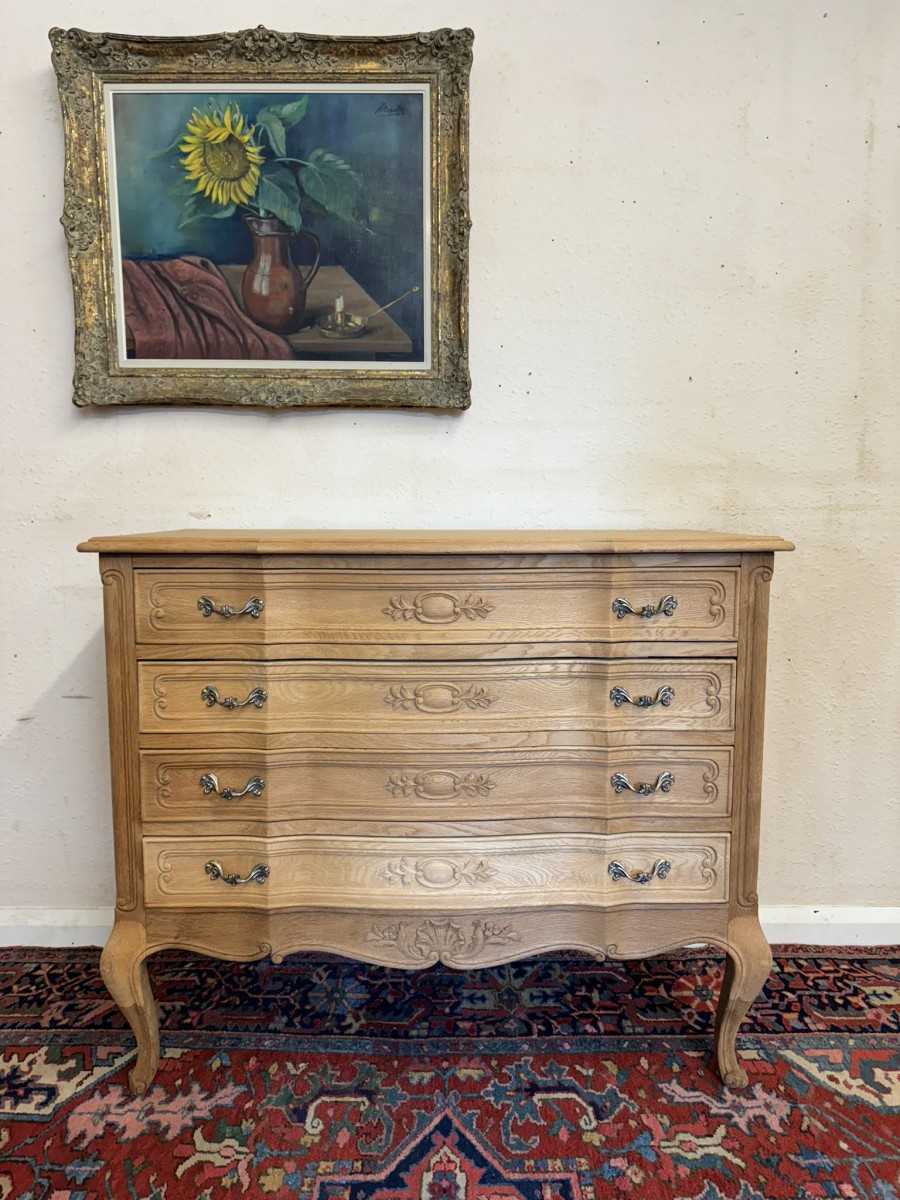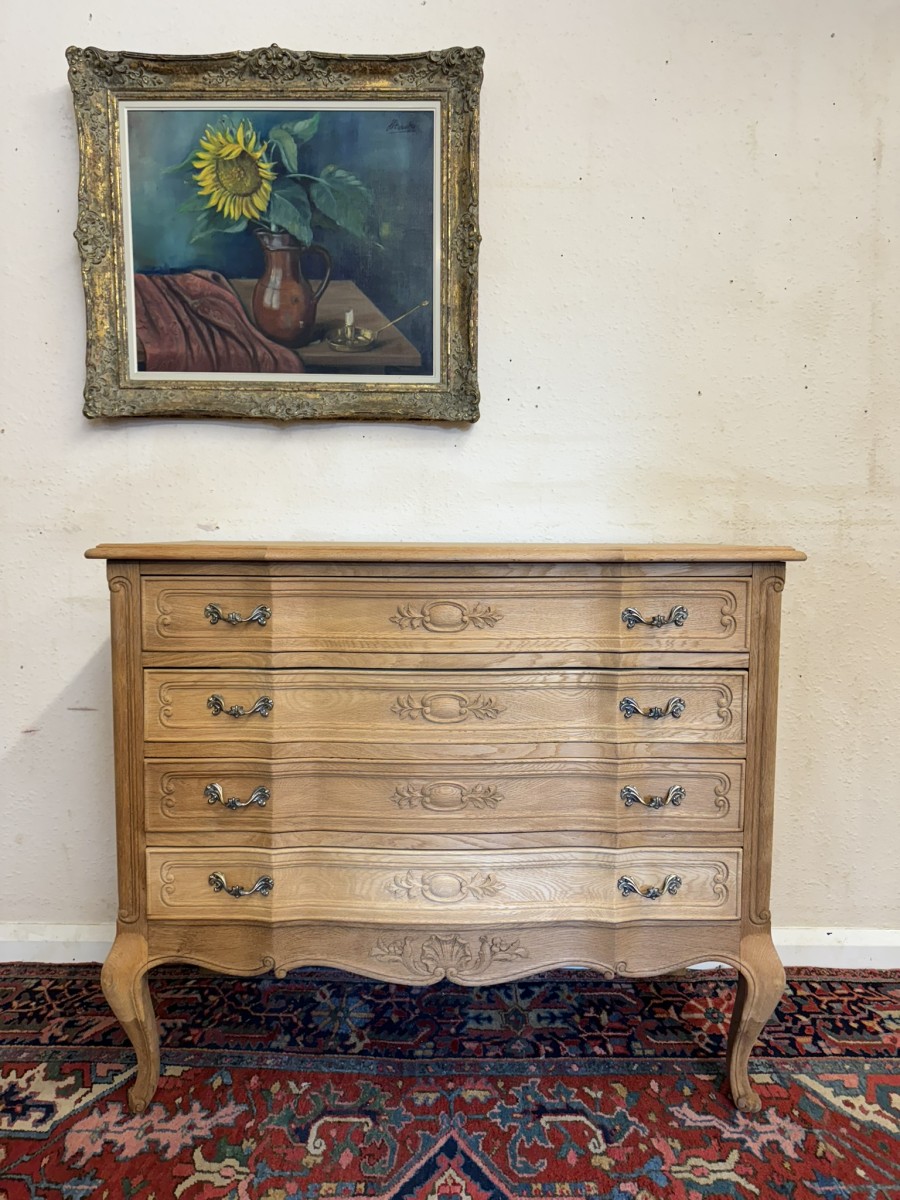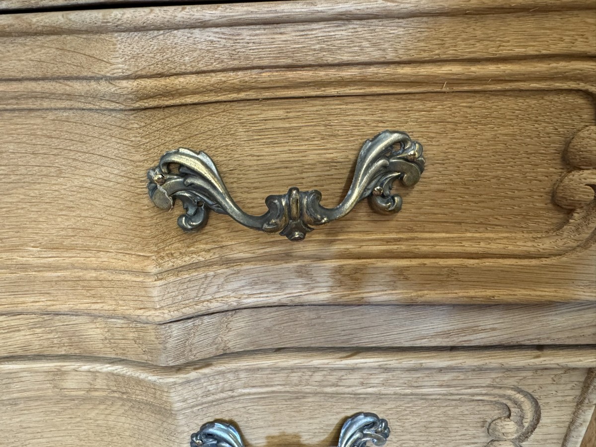 This stylish raw oak chest is in excellent condition. The shaped oversailing top sits above four carved serpentine shaped drawers, each drawer having a pair of ornate brass handles. Recessed panelled sides, shaped skirt with decorative central carving and standing on two carved cabriole shaped legs to the front.