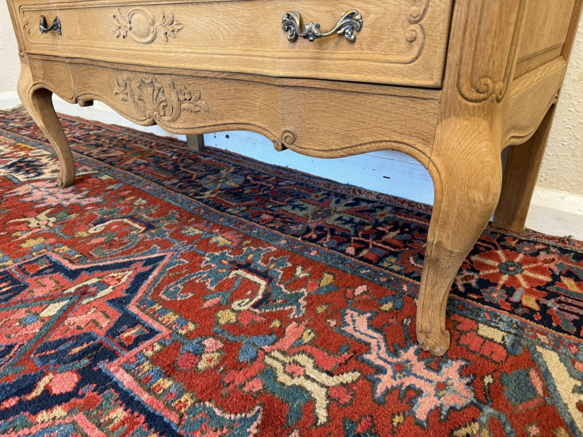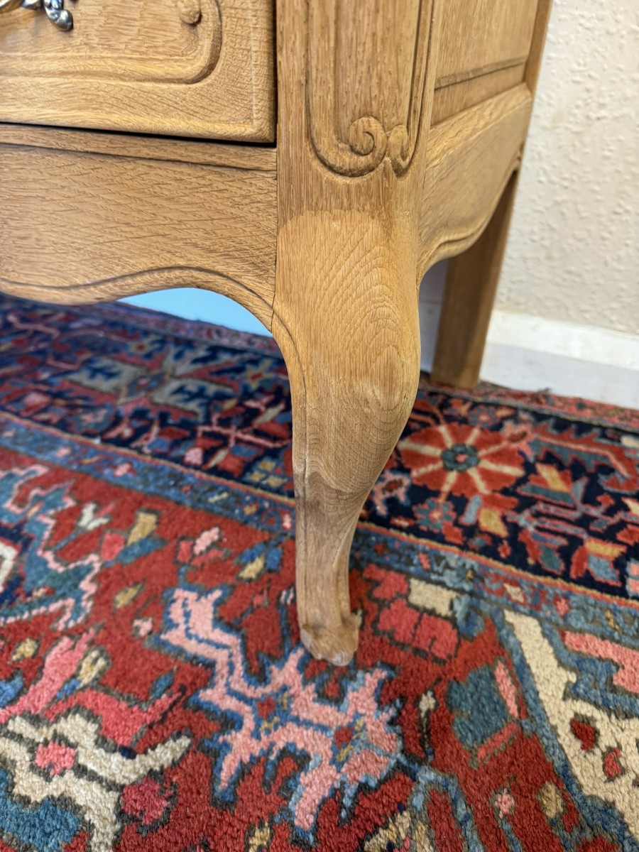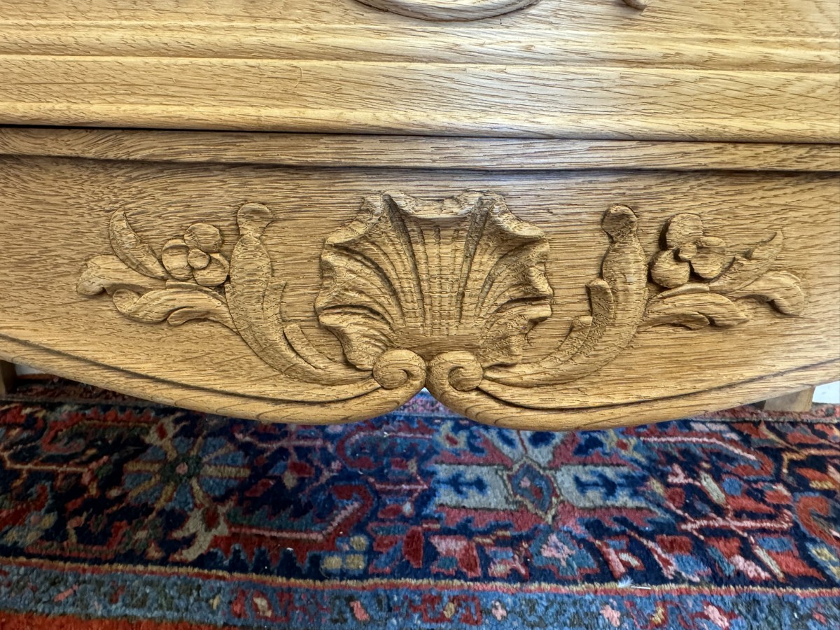 This stylish raw oak chest is in excellent condition. The shaped oversailing top sits above four carved serpentine shaped drawers, each drawer having a pair of ornate brass handles. Recessed panelled sides, shaped skirt with decorative central carving and standing on two carved cabriole shaped legs to the front.