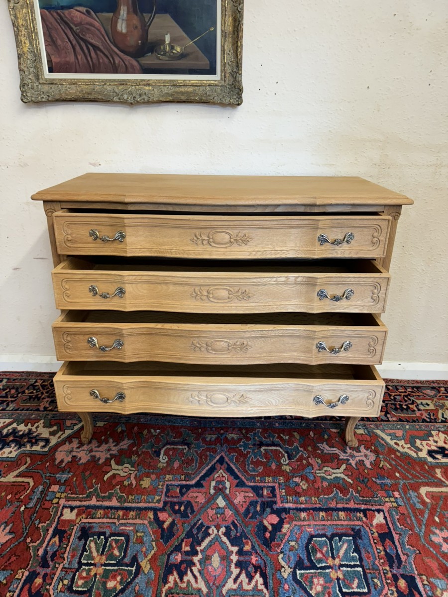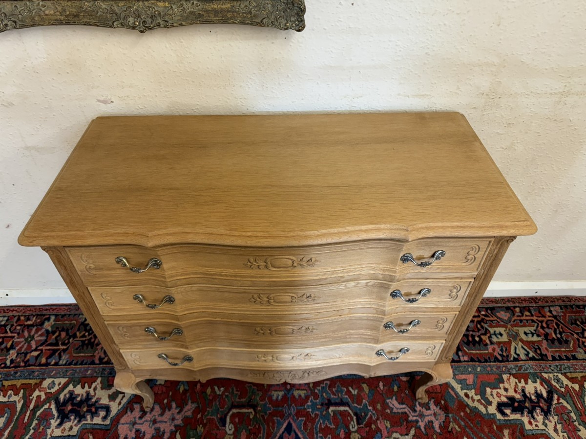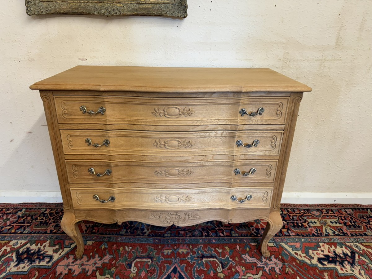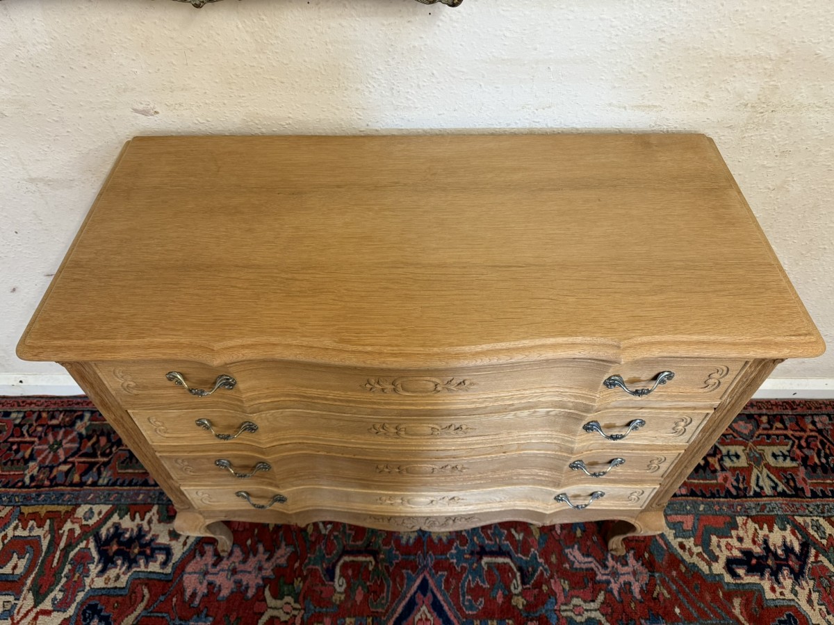 - FANTASTIC QUALITY FRENCH RAW OAK SERPENTINE CHEST OF FOUR DRAWERS