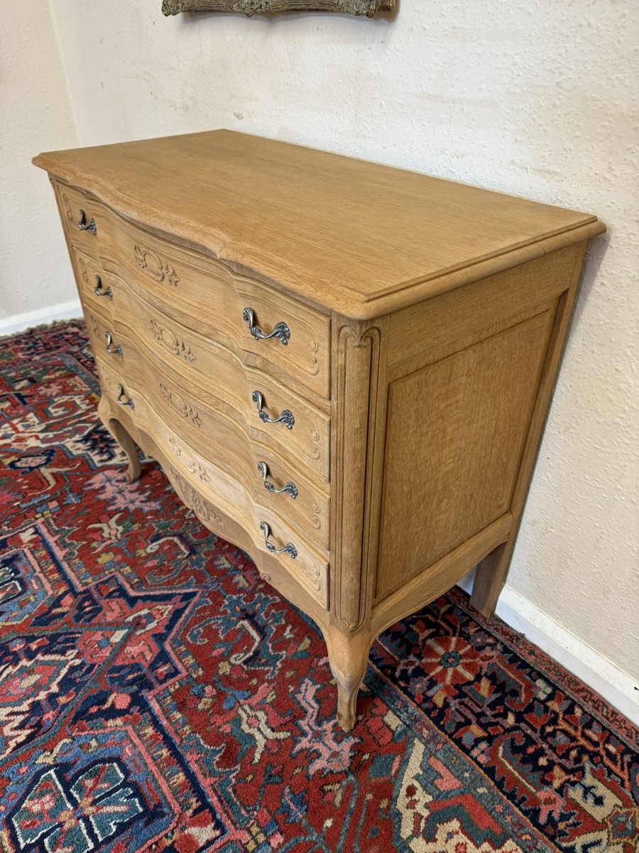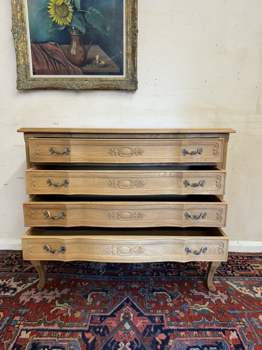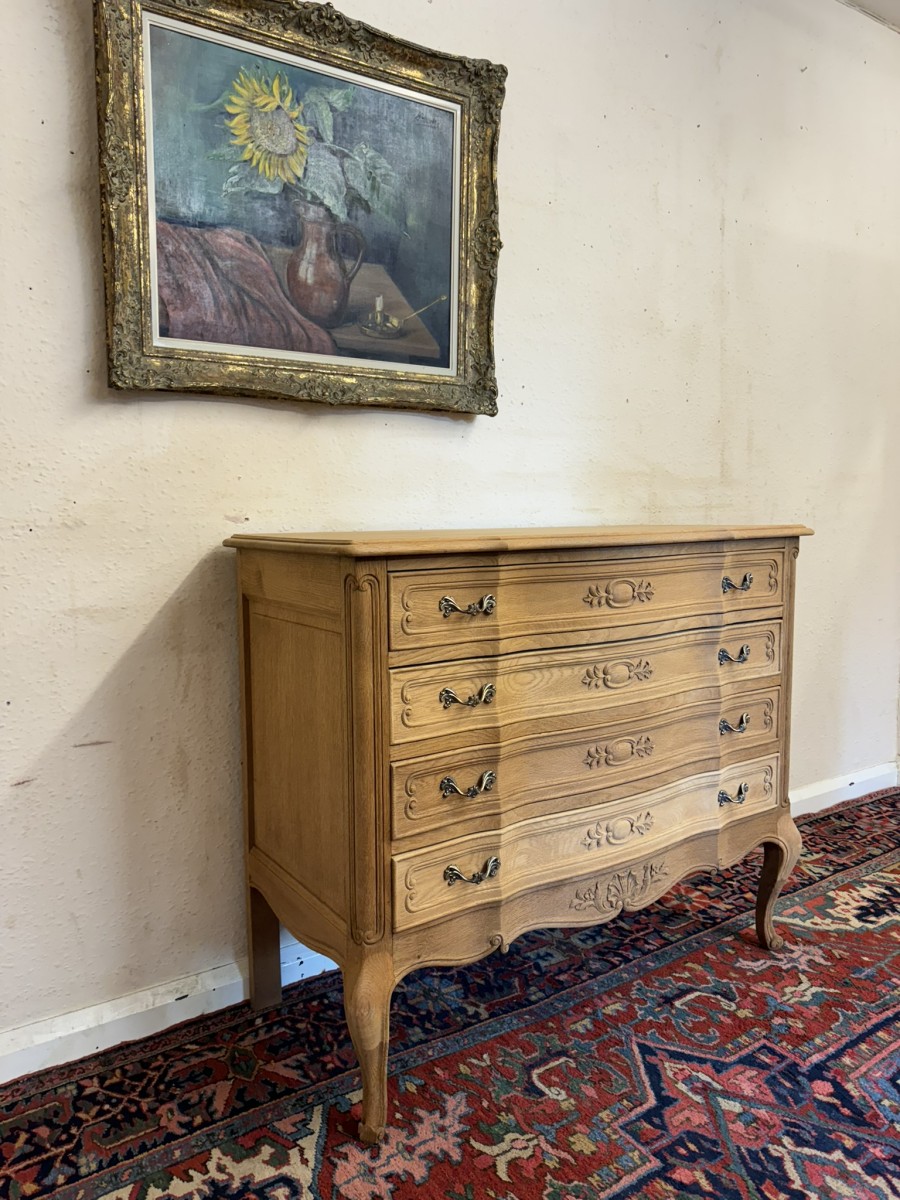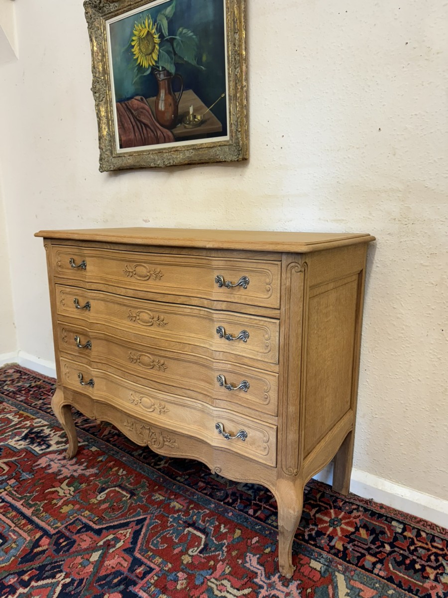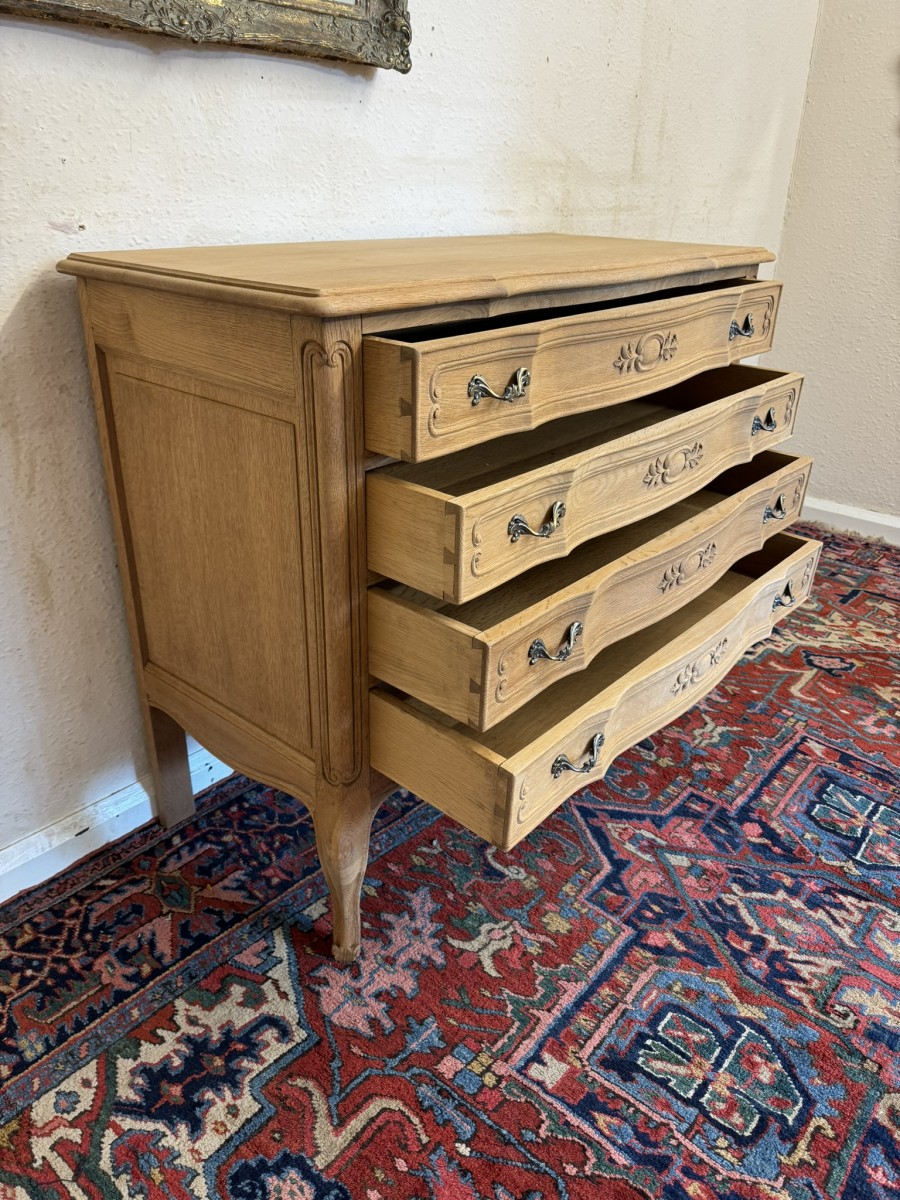 - FANTASTIC QUALITY FRENCH RAW OAK SERPENTINE CHEST OF FOUR DRAWERS