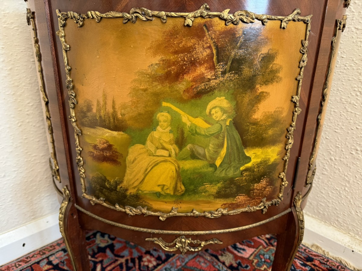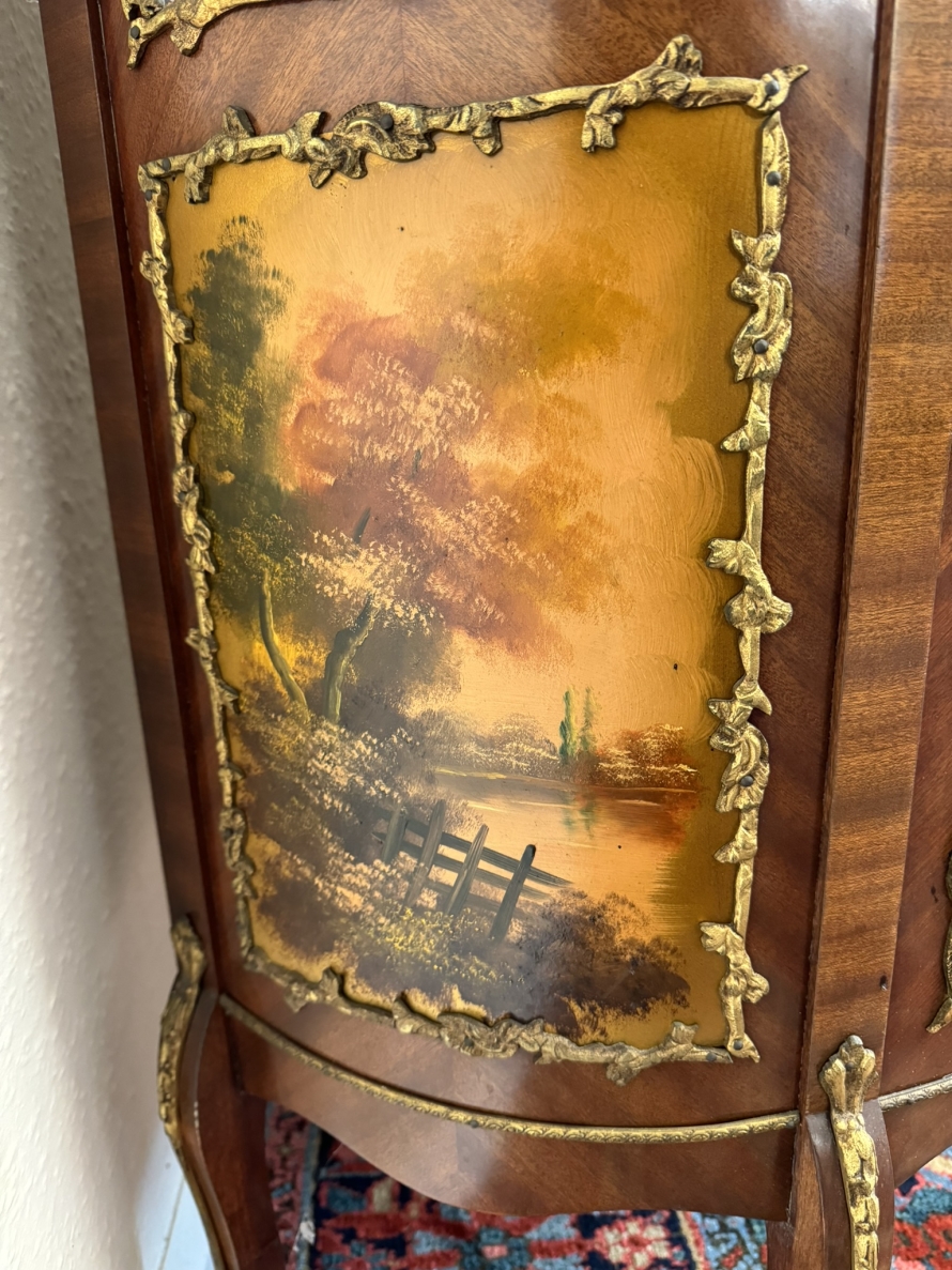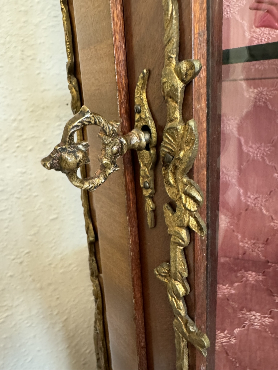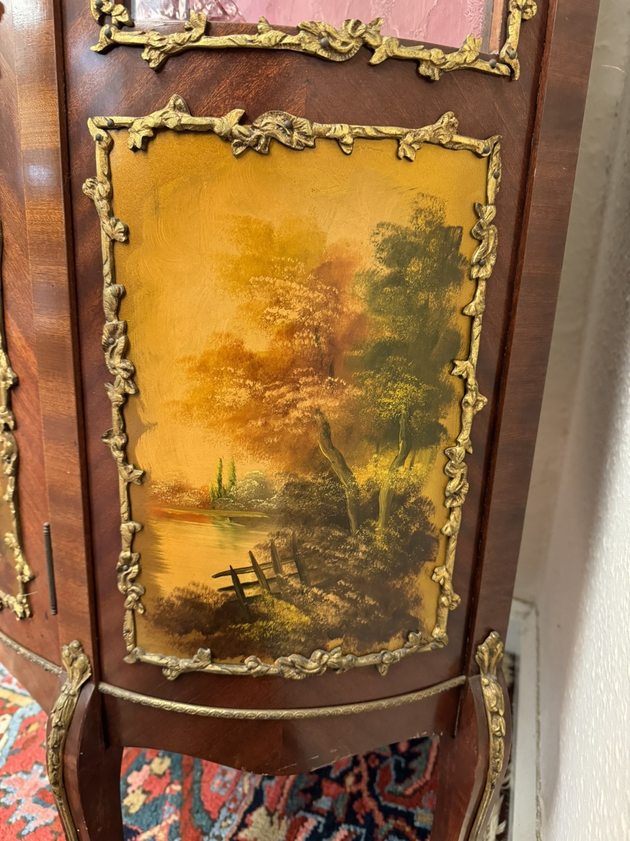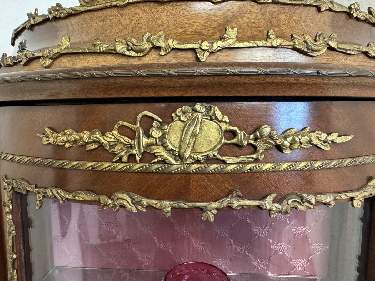 Smothered in fabulous ormolu decoration with lockable glazed door with decorated panel below, glazed sides with painted decoration below and standing on four cabriole shaped legs with ormolu mounts.