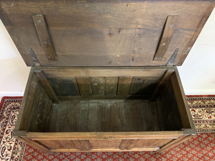 This fabulous storage chest dates circa 1830. The lift up lid opens to reveal a boarded base and offers ample storage space. Three recessed panels to the front and standing on traditional block feet.