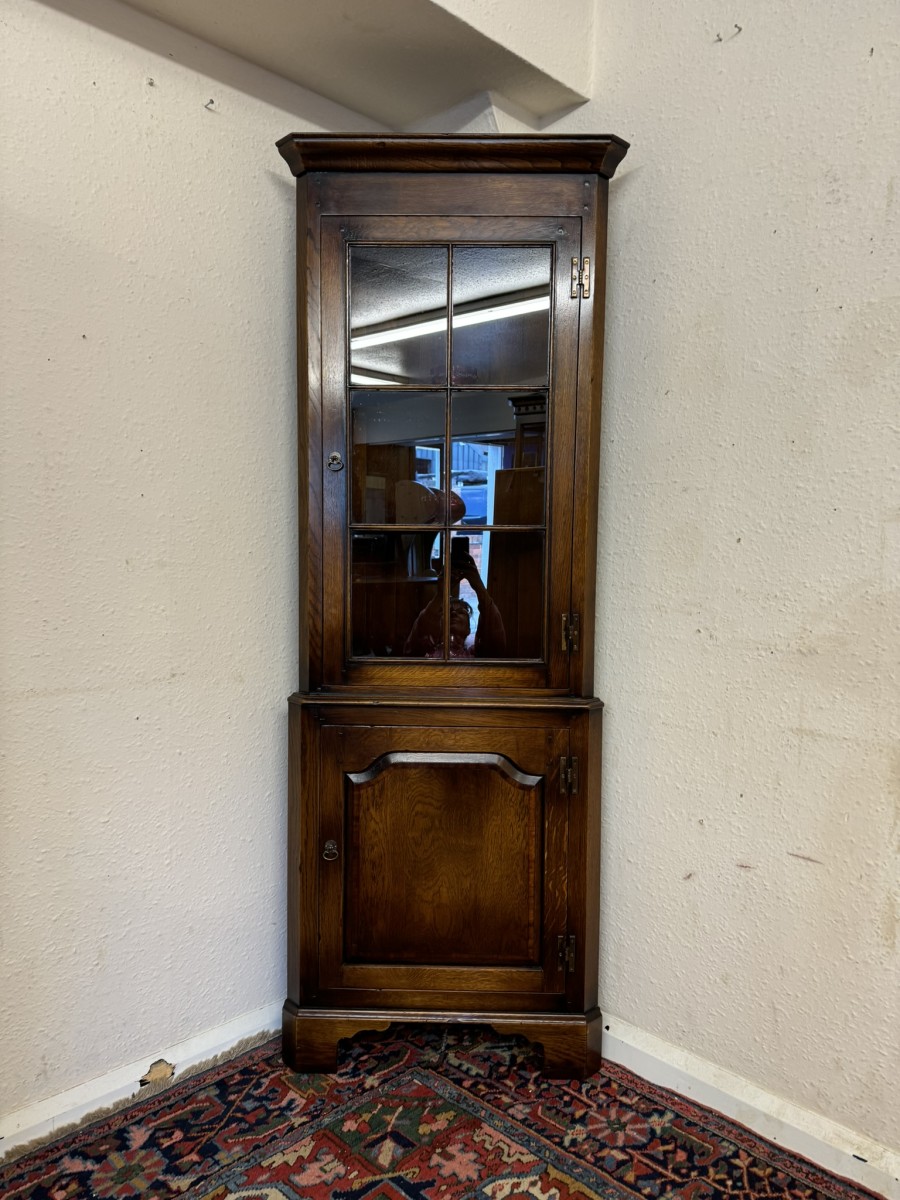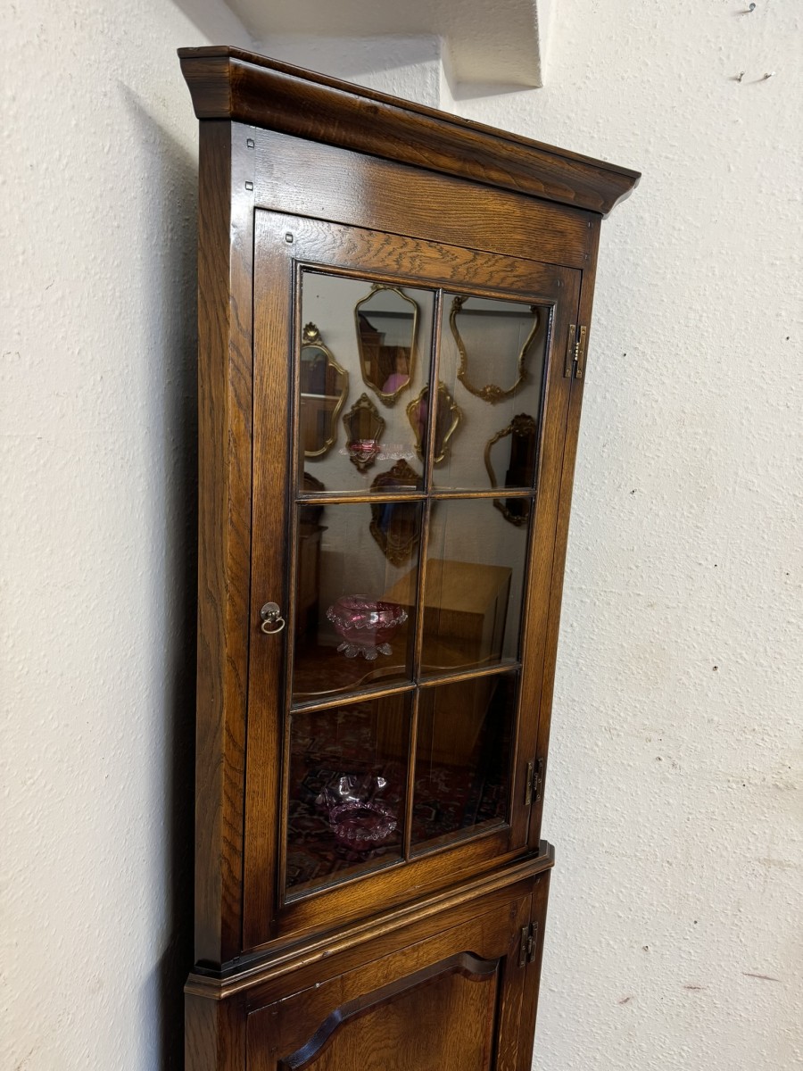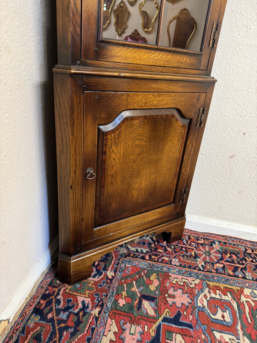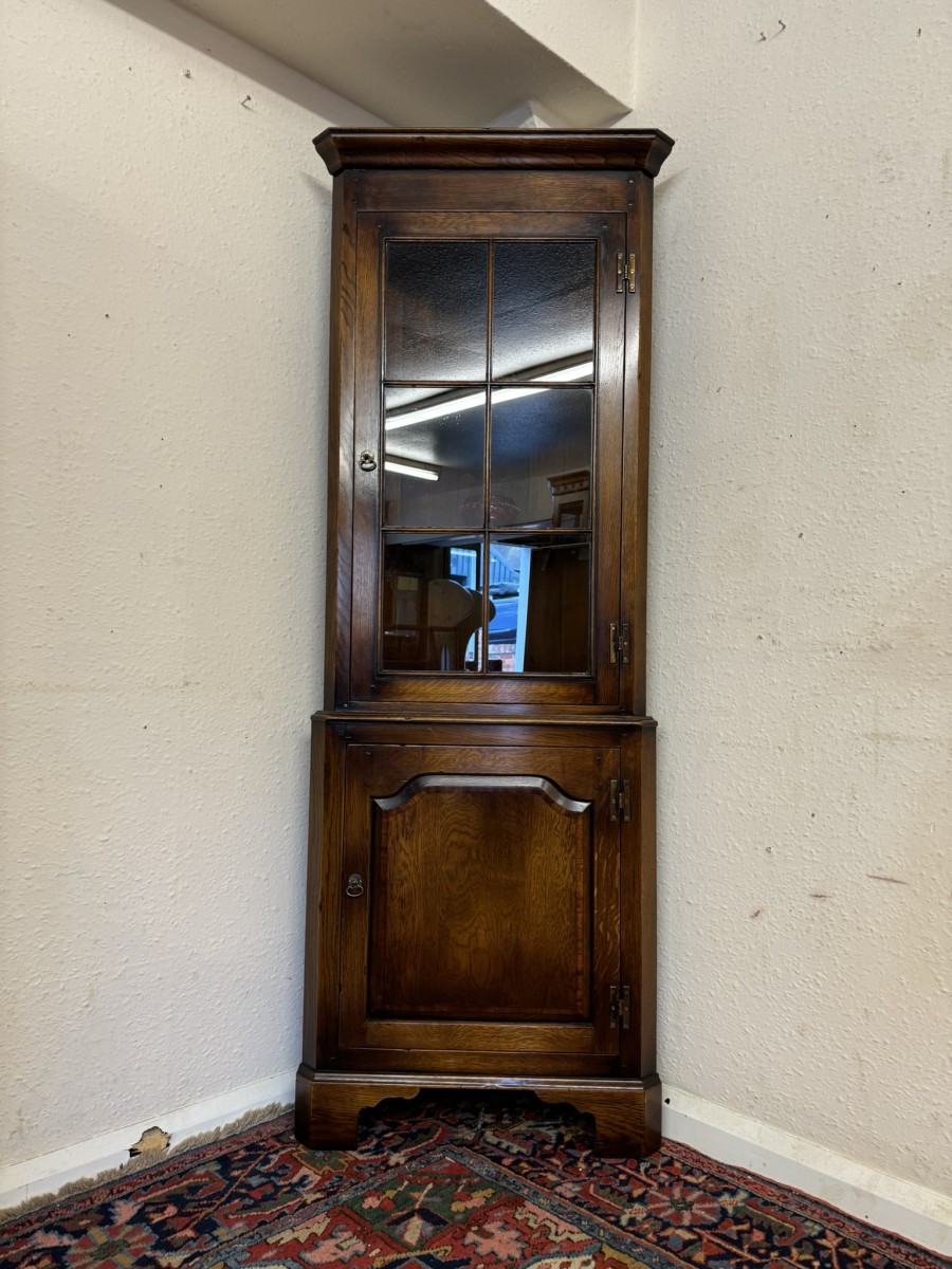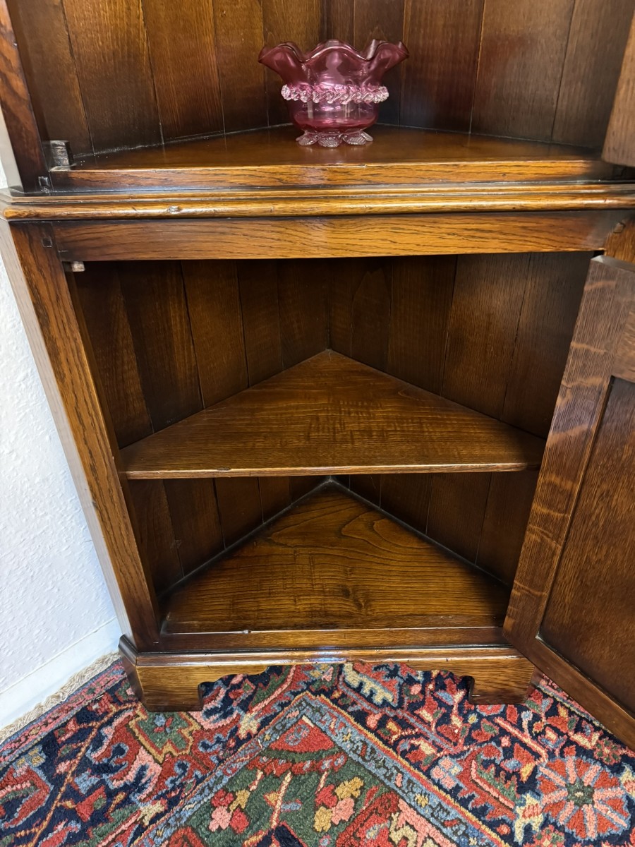 This fabulous oak corner cupboard is made of solid oak throughout and is in excellent condition. The glazed top opens to reveal two shaped removable shelves, below is a shaped recessed panelled cupboard door, the door opens to reveal a shelf. This fabulous corner cupboard sits on bracket feet.