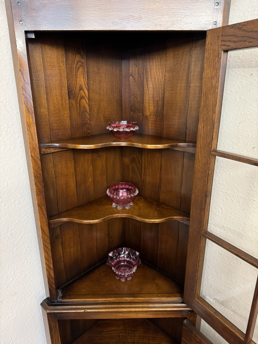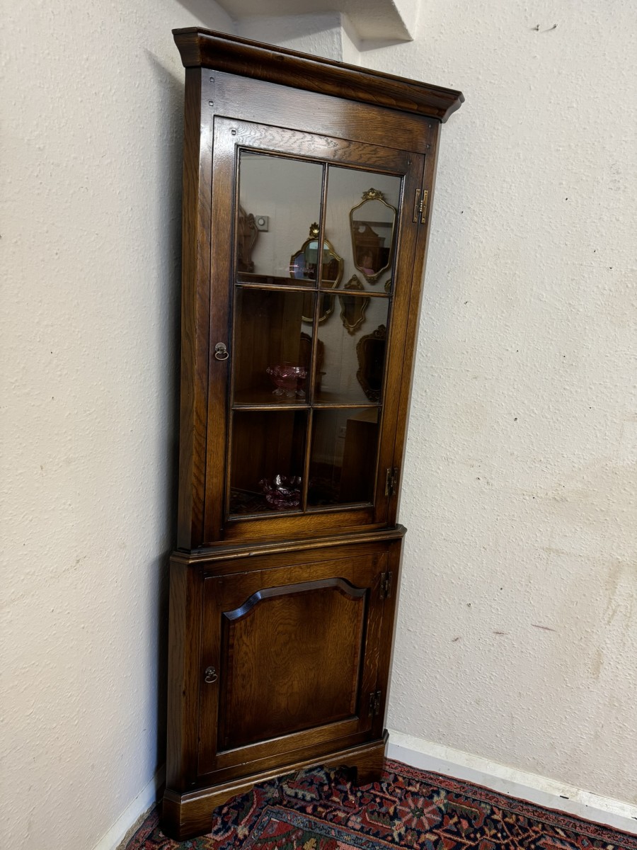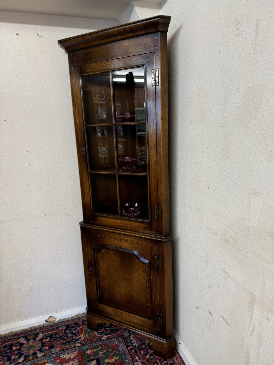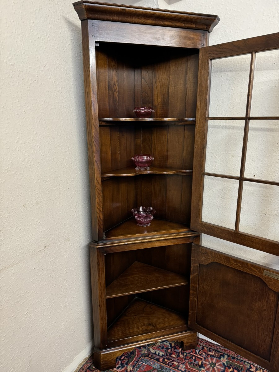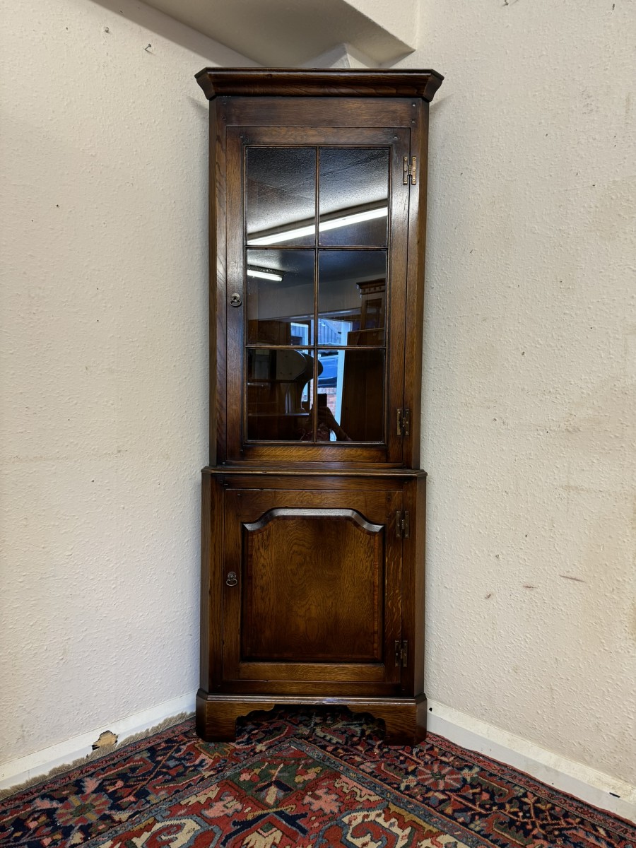 This fabulous oak corner cupboard is made of solid oak throughout and is in excellent condition. The glazed top opens to reveal two shaped removable shelves, below is a shaped recessed panelled cupboard door, the door opens to reveal a shelf. This fabulous corner cupboard sits on bracket feet.