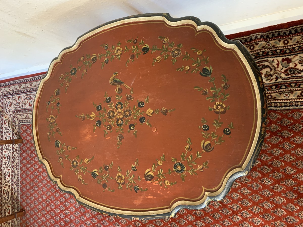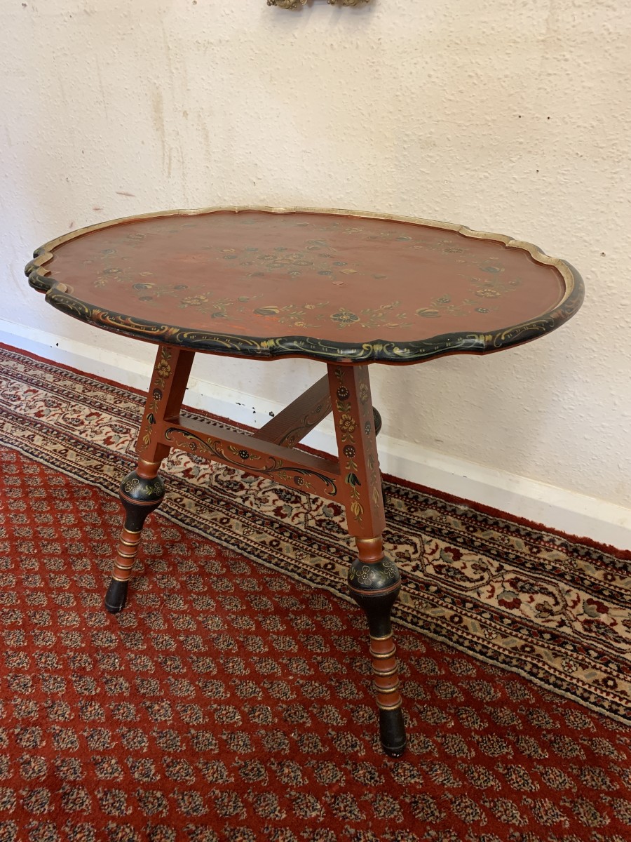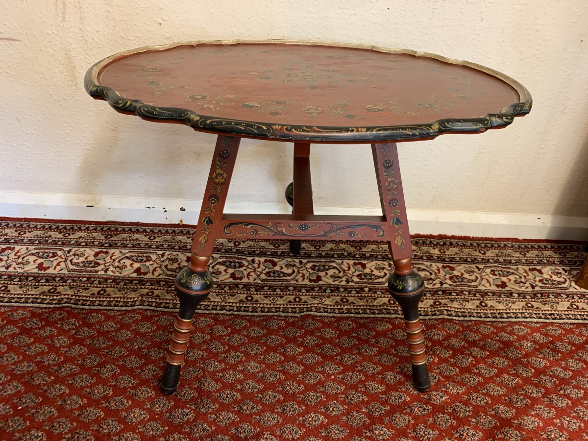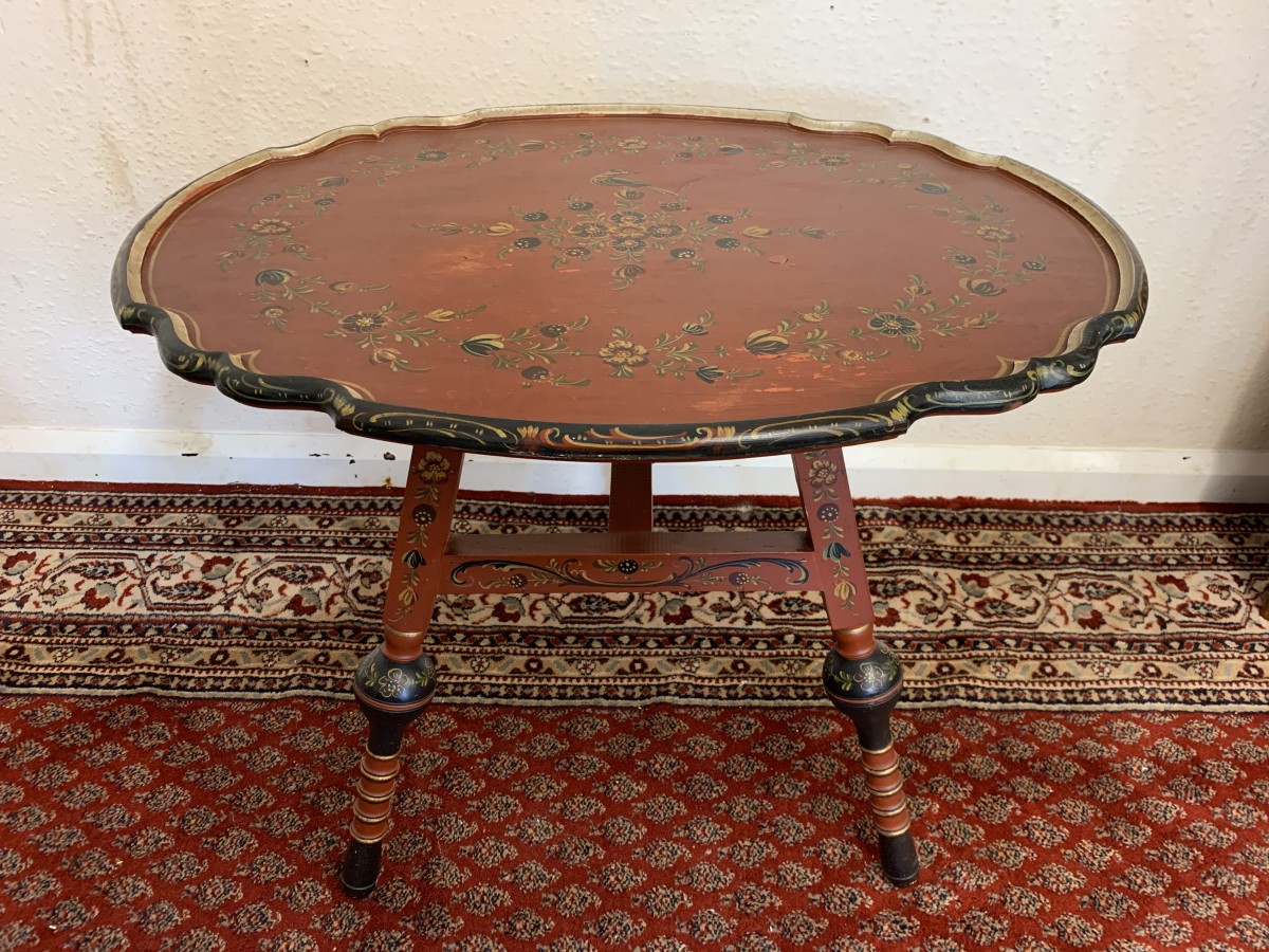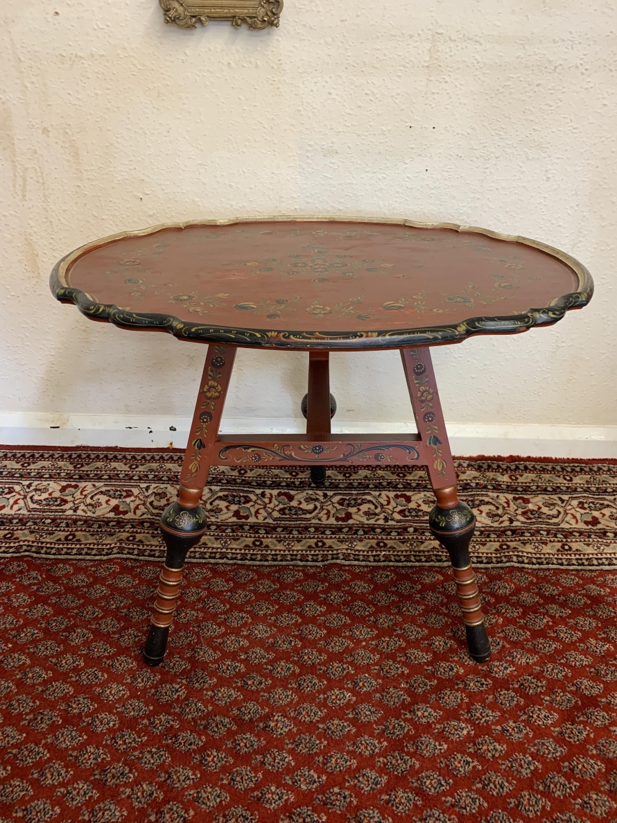 The shaped top having a black and gilt edging with hand painted floral decoration to the top. Three fabulous painted turned legs with painted stretcher supports.