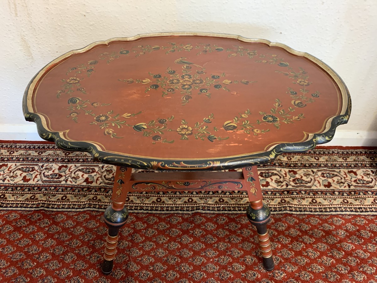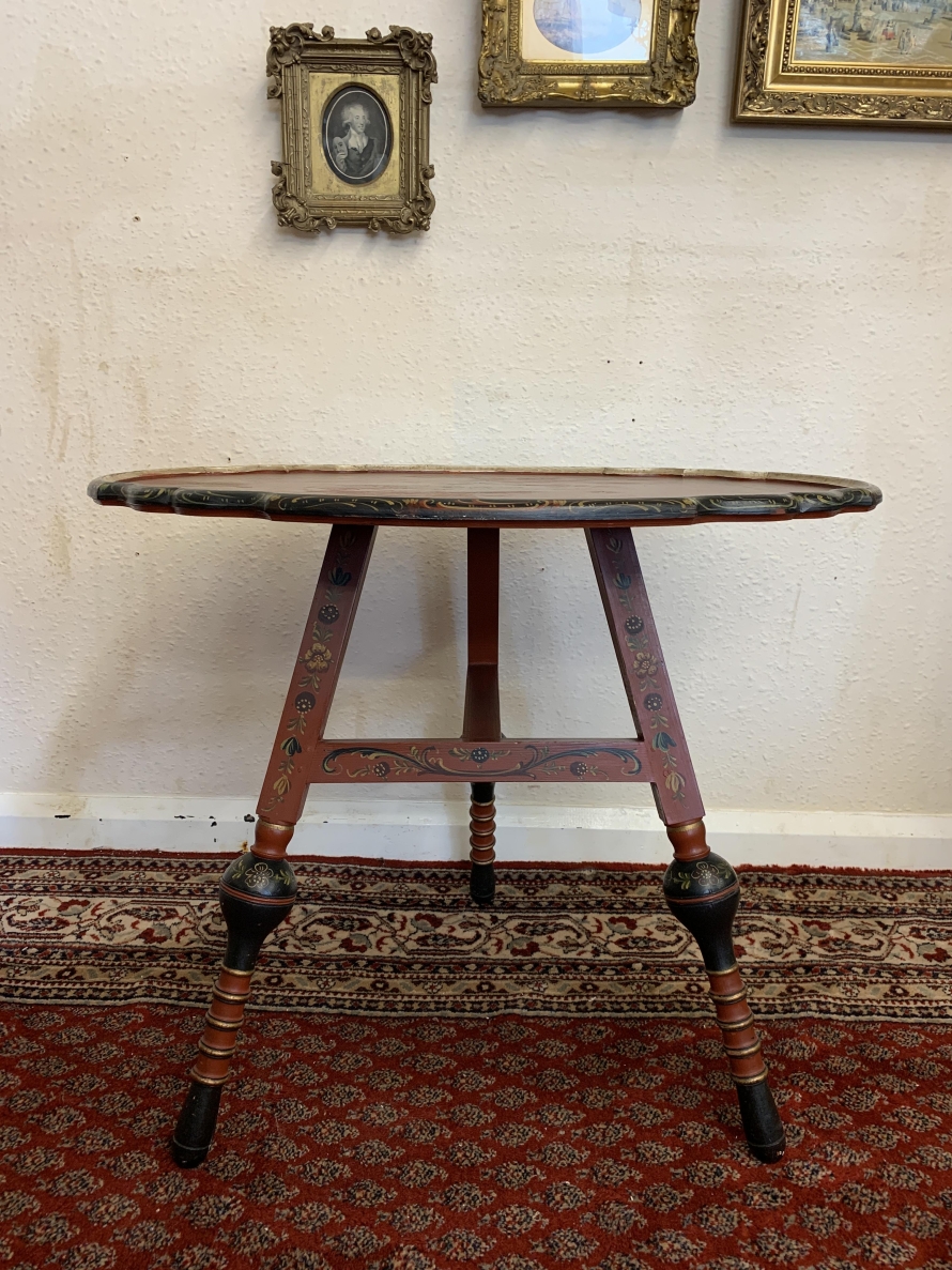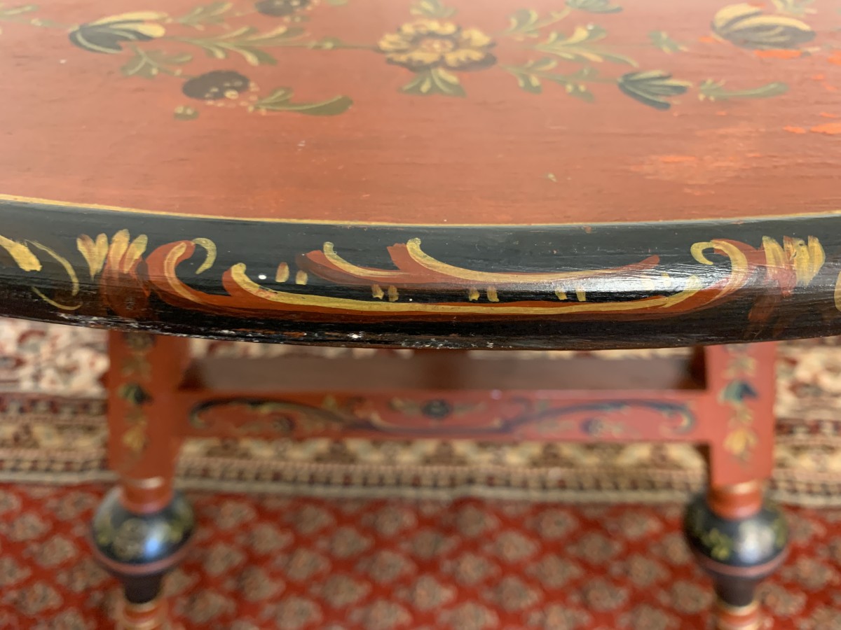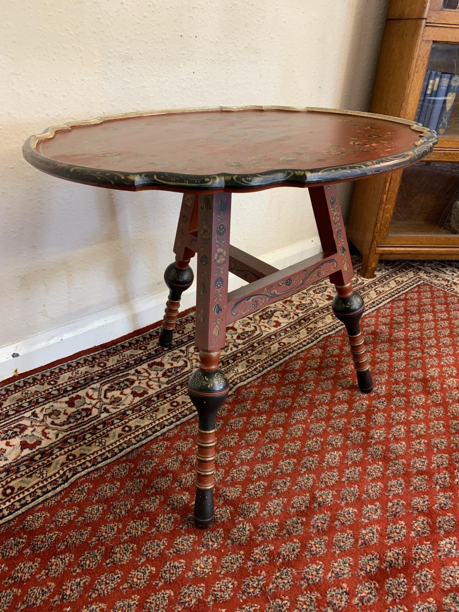 The shaped top having a black and gilt edging with hand painted floral decoration to the top. Three fabulous painted turned legs with painted stretcher supports.